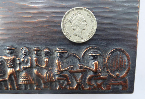 Strange SCANDINAVIAN Bronze and Wooden Desktop Cigarette Box: Images on the Lid Showing Wine Making Scenes