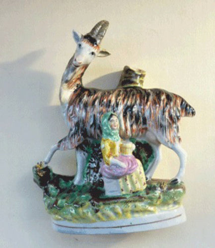 STAFFORDSHIRE POTTERY. Strange Victorian Spill Holder featuring a milkmaid and a massive goat