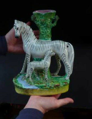 STAFFORDSHIRE ZEBRA and Foal Spill Vase; Very Rare Antique Model c 1860