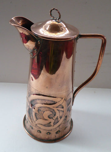 Stunning Copper Arts & Crafts Lidded Flagon / Jug. With stylised foliate decoration around the base