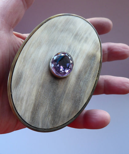 ANTIQUE Scottish Horn Snuff Box. 19th Century Horn Oval Box with Faceted Amethyst Set in a Slim Silver Band on the Lid