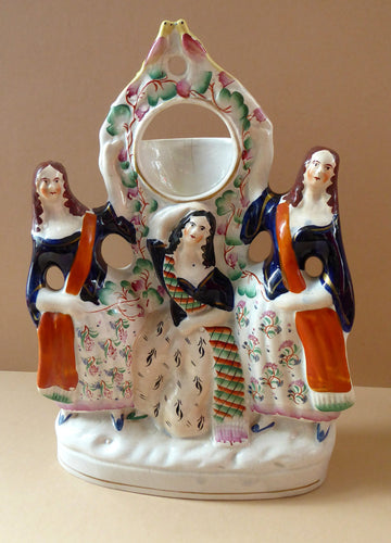 Antique STAFFORDSHIRE POTTERY Pocket Watch Holder. Group of Three Ladies Standing beside a Fruiting Vine Bough. Twin Birds on Top; c 1880s