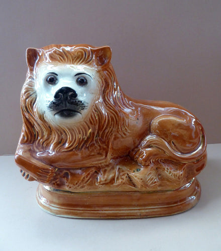 Large ANTIQUE Victorian Staffordshire Style (Bo'ness) Recumbent Lion with Glass Eyes. 11 inches in length