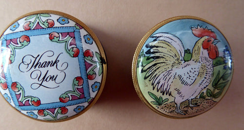 PAIR of Miniature Enamel Trinket Boxes. One HALCYON Days: Thank You. The other BILSTON Battersea with Chicken Image