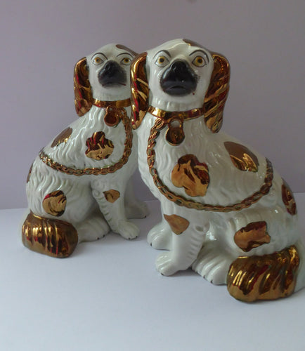 Rarer Pair of Victorian Staffordshire Spaniel Dogs / Wally Dugs. 9 inches in height. Unusual Gold Lustre Details