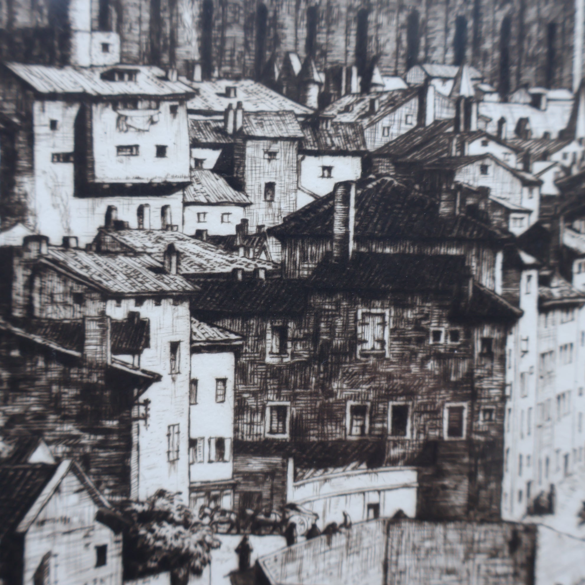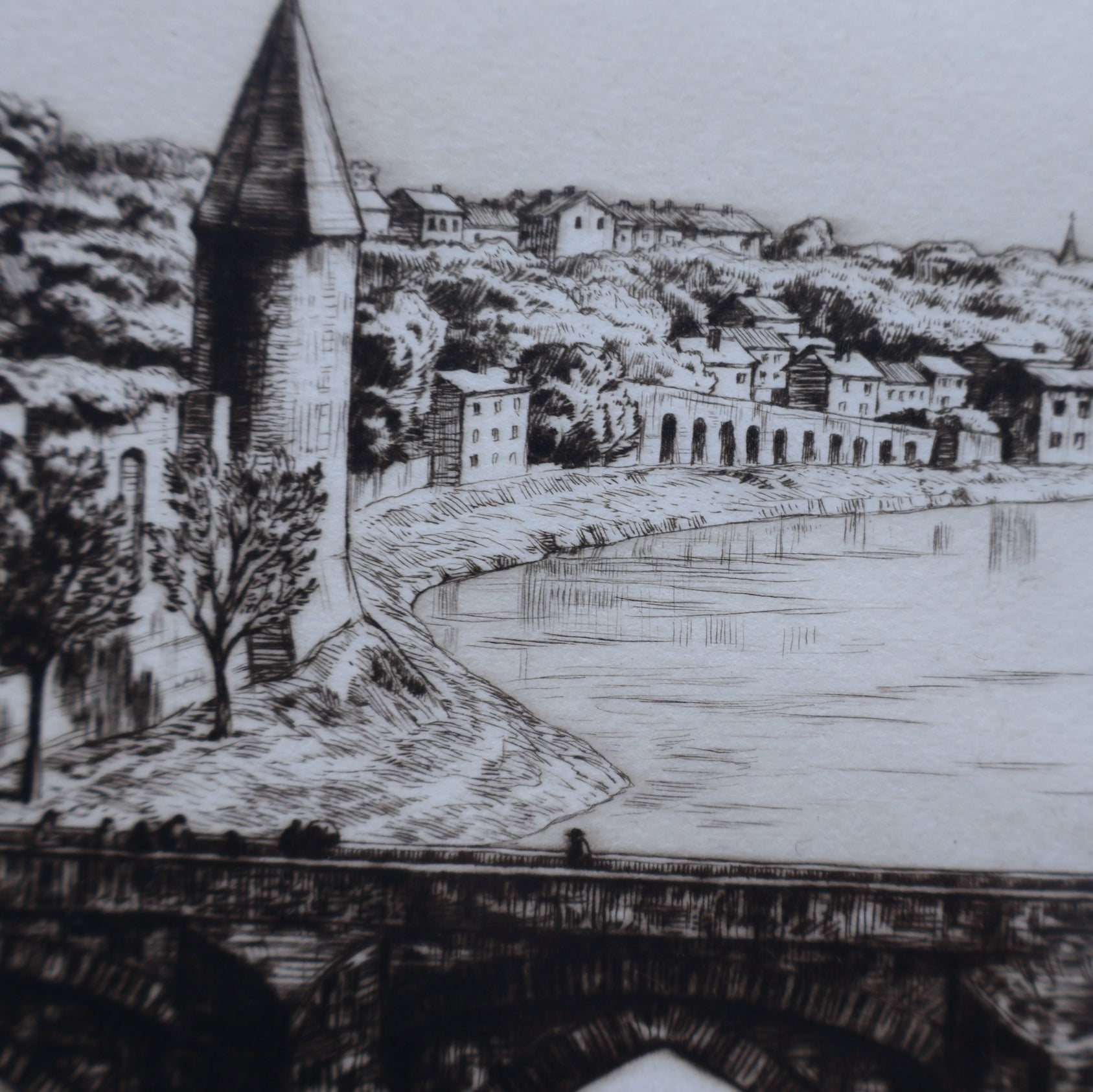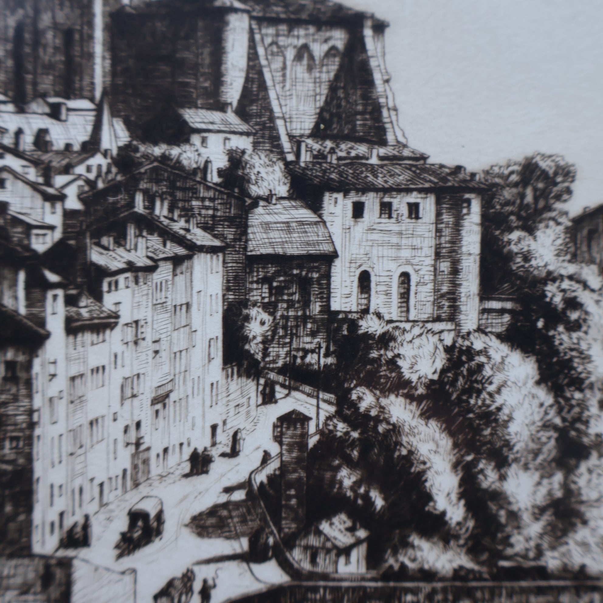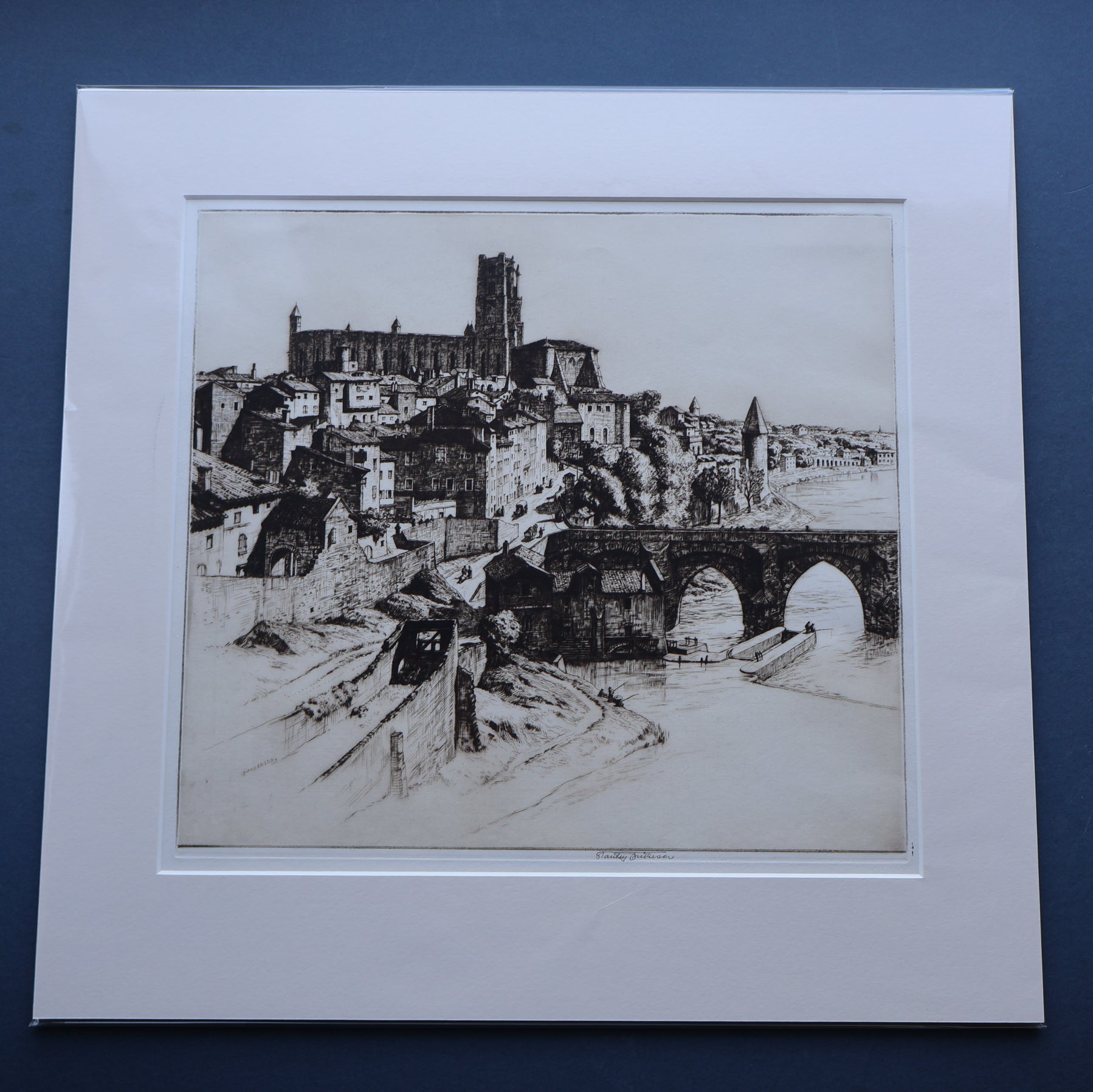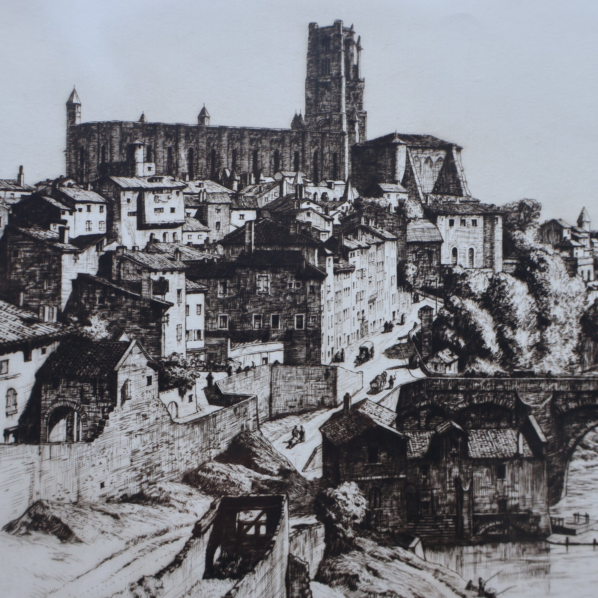 It is an original fine art etching and drypoint- and is pencil signed in the margin below the image. It was published in 1927 and shows the town of Albi. This picturesque French town is on the River Tarn and long been associated with artists. It was the birthplace of Toulouse-Lautrec and is now home to the museum in his memory. During the Etching Revival many British artists visited Albi and the town remains a draw for tourists today.