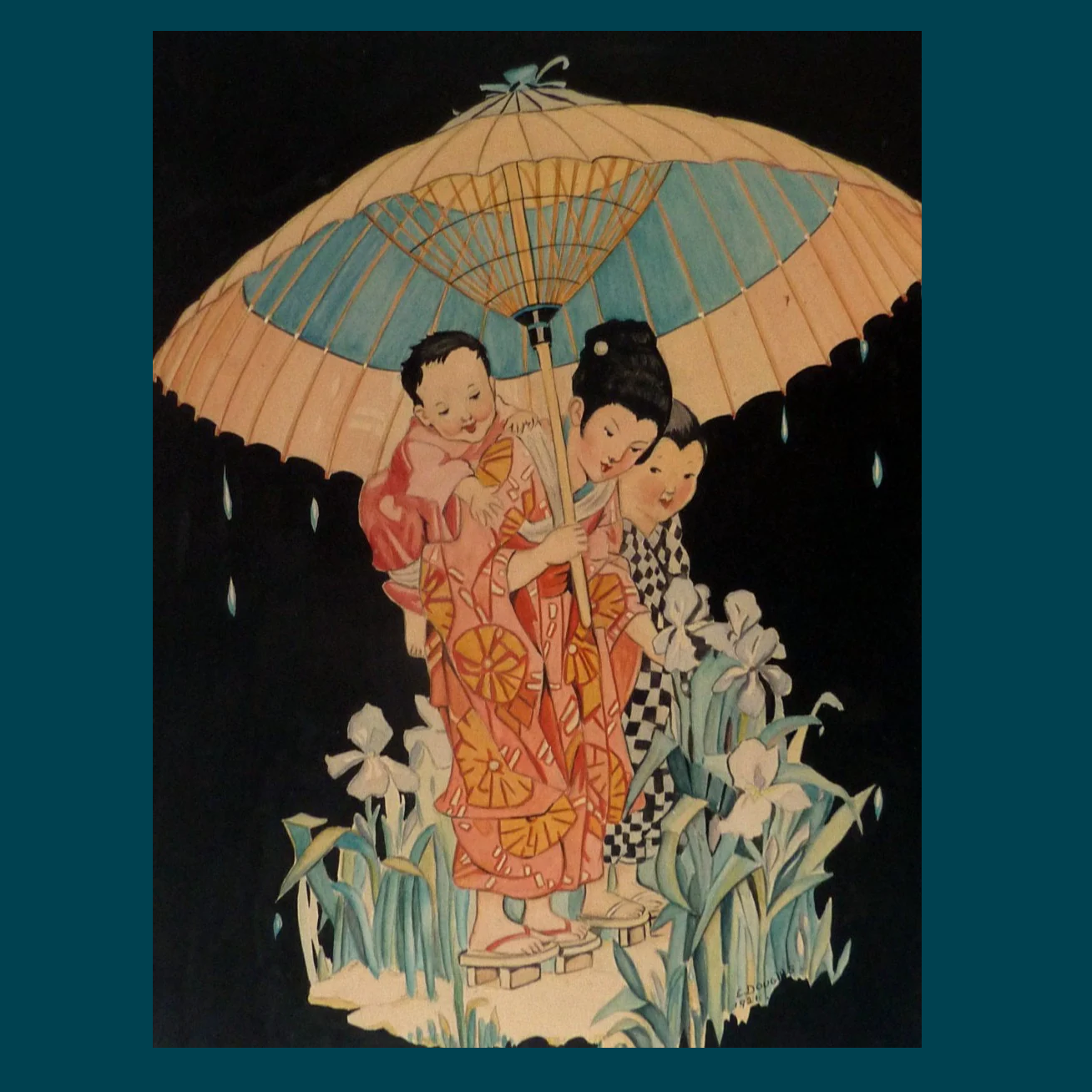 This lovely little watercolour shows a Japanese lady with two little children huddled under the canopy of a large parasol. It is a highly attractive and detailed image, as you can see from my photographs.