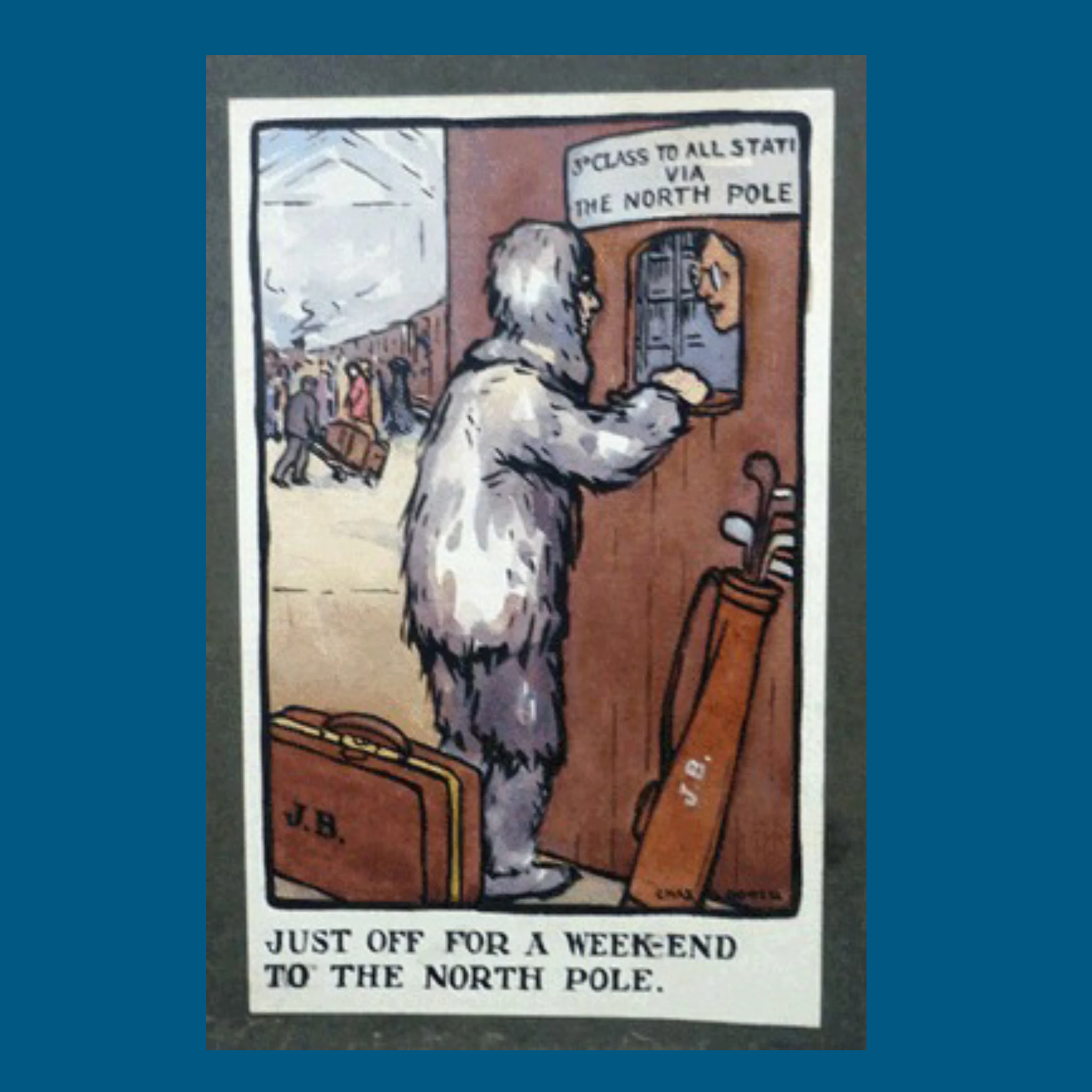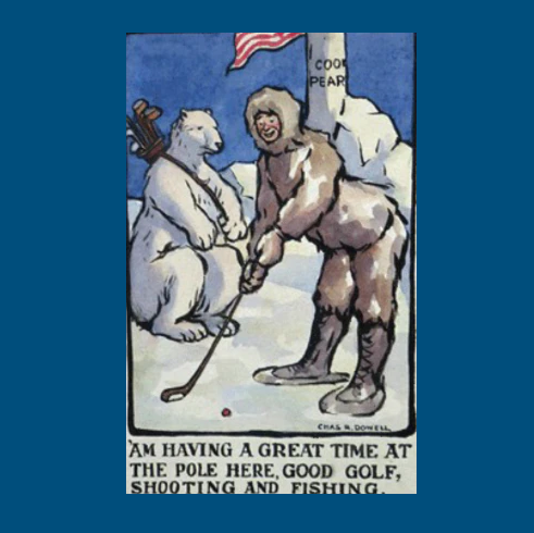Robert Peary (1856 - 1920 claimed to have led the first successful expedition to the Geographic North Pole on 6th April 1909. His competitor, Frederick Cook (1865 - 1940), refuted his claim and said that he had actually got there one year earlier on 21st April 1908. There was also a hint of the scandal with rumours of Peary fathering children with native Innuit women outside of marriage - this is probably being referred to in Dowell’s little sketch of a man rubbing noses with a pretty Eskimo lady.