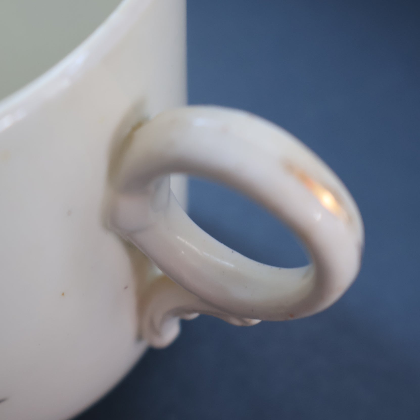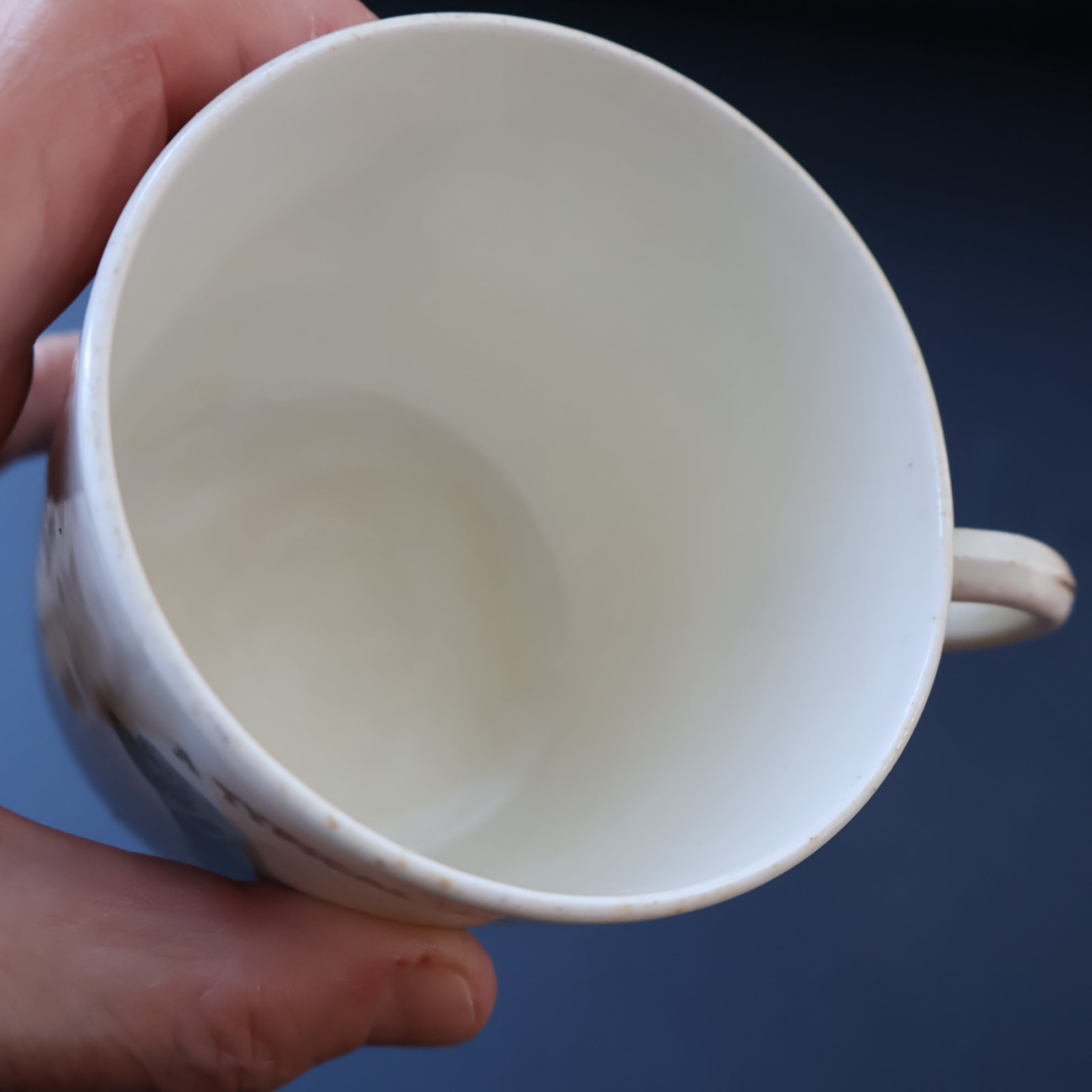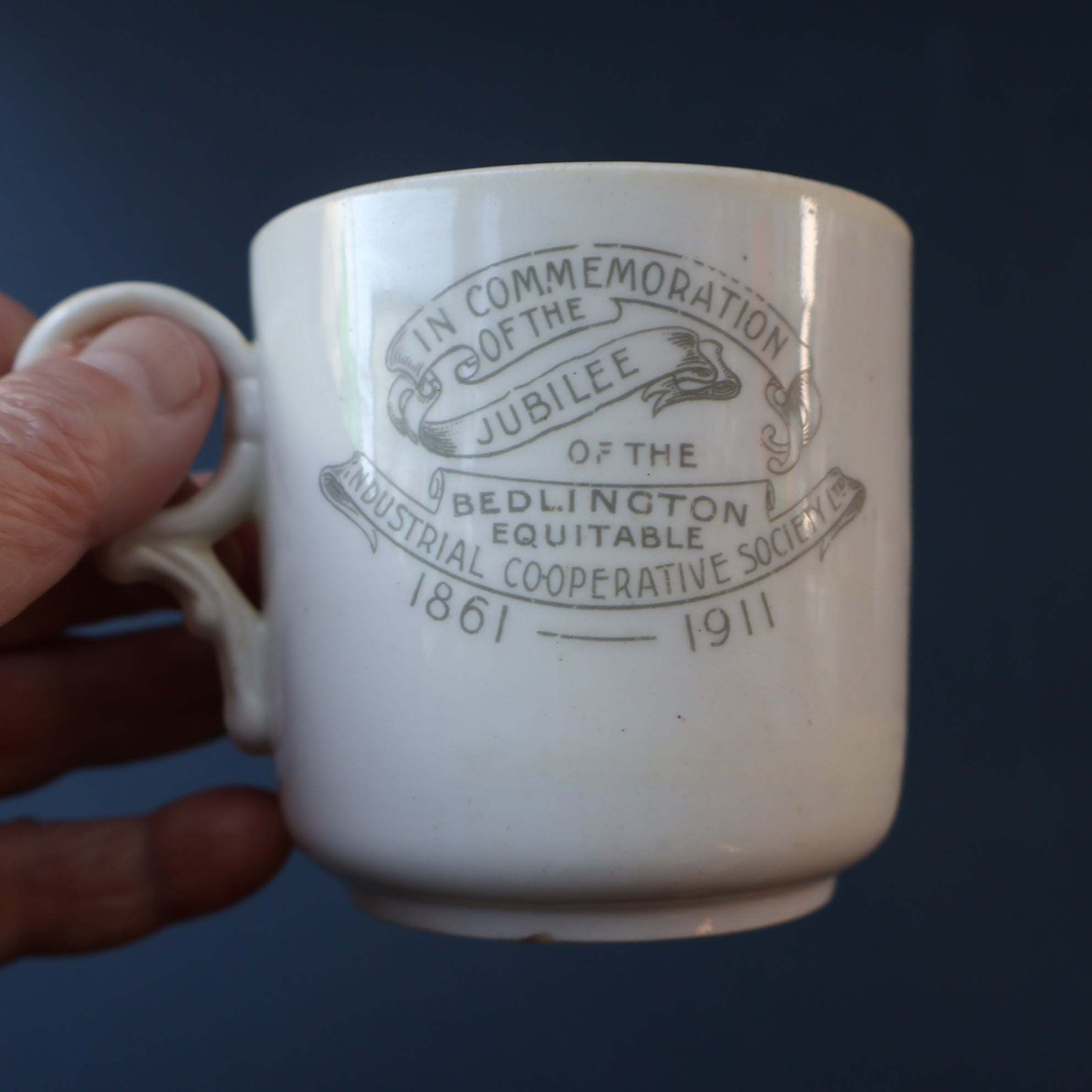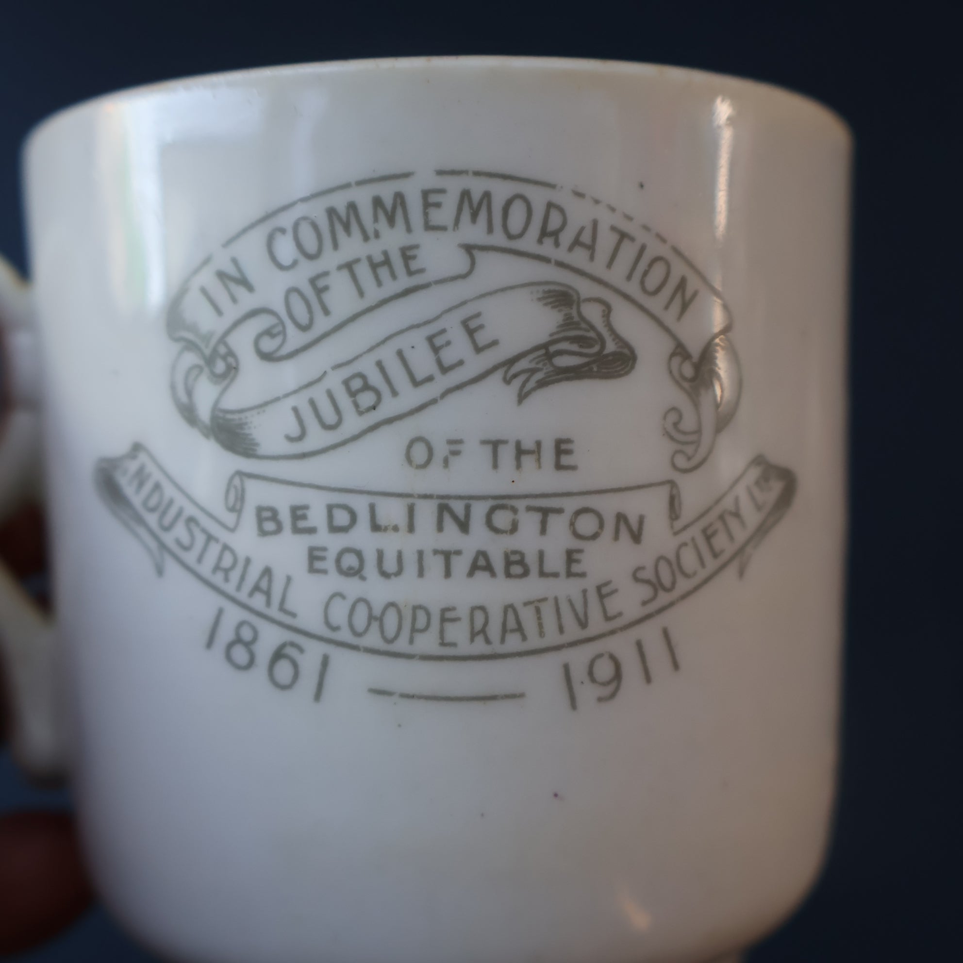 This mug has a crest or dedications printed on the back: This reads In Commemoration of the Jubilee of the Bedlington Equirable Industrial Cooperative Society 1861 - 1911. My price reflects that these two mugs are now rather rare survivors. They are in excellent condition being 114 years old.