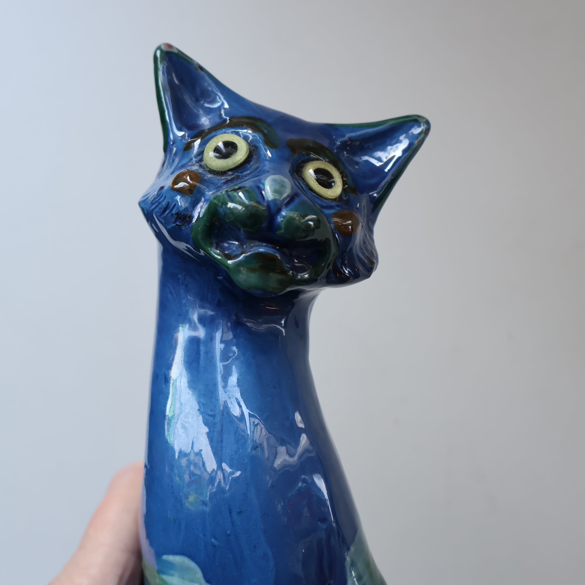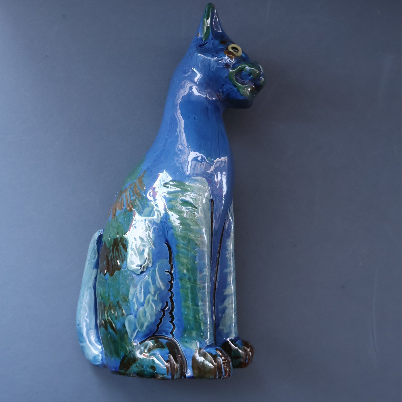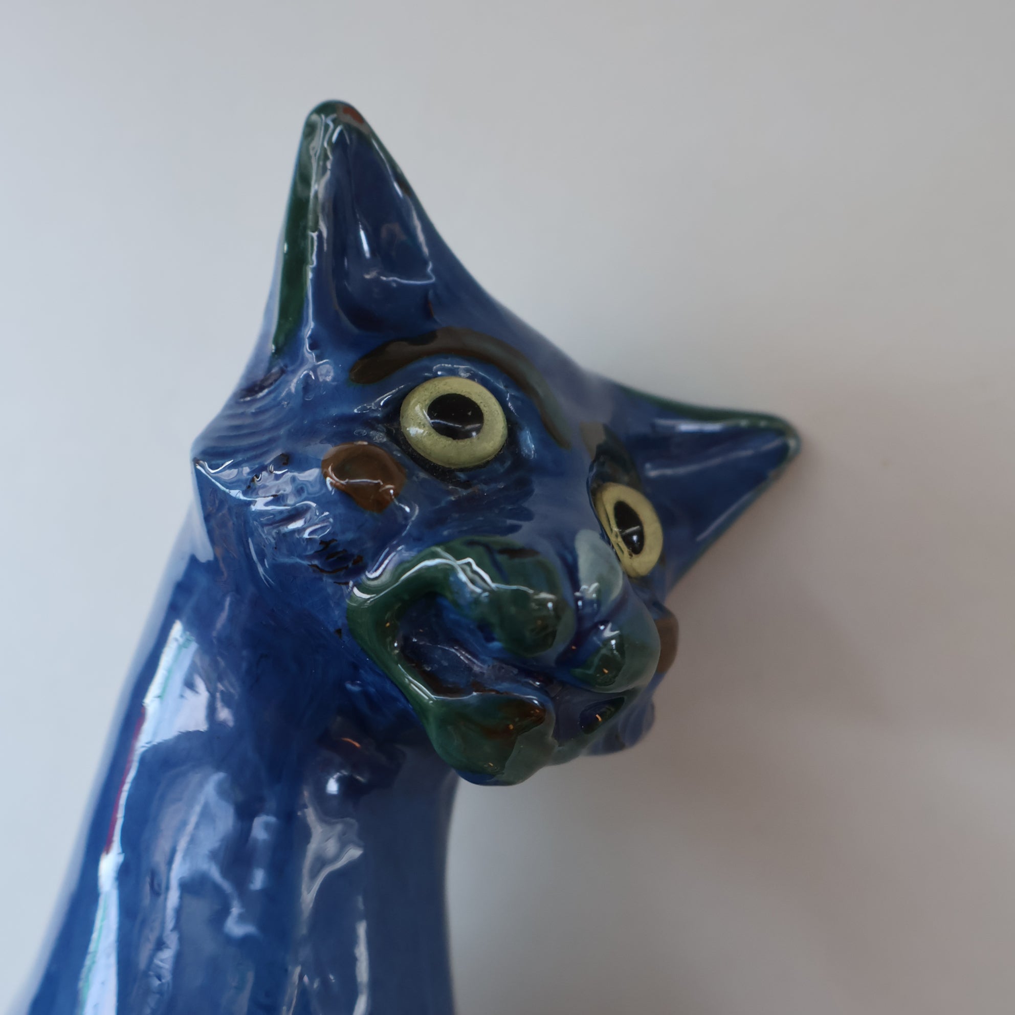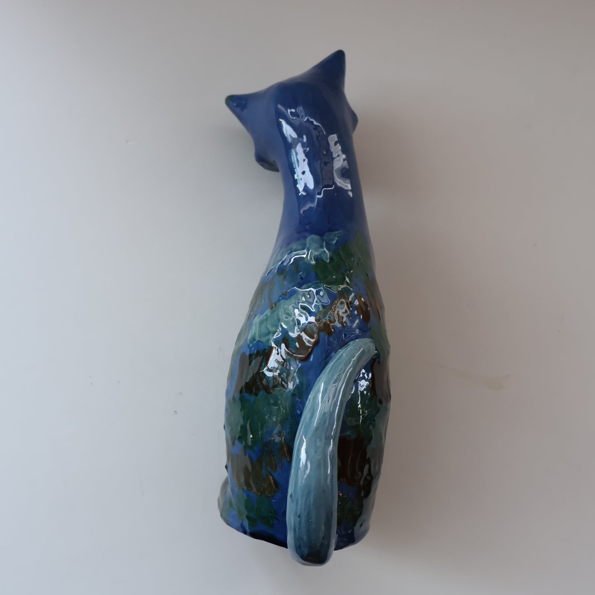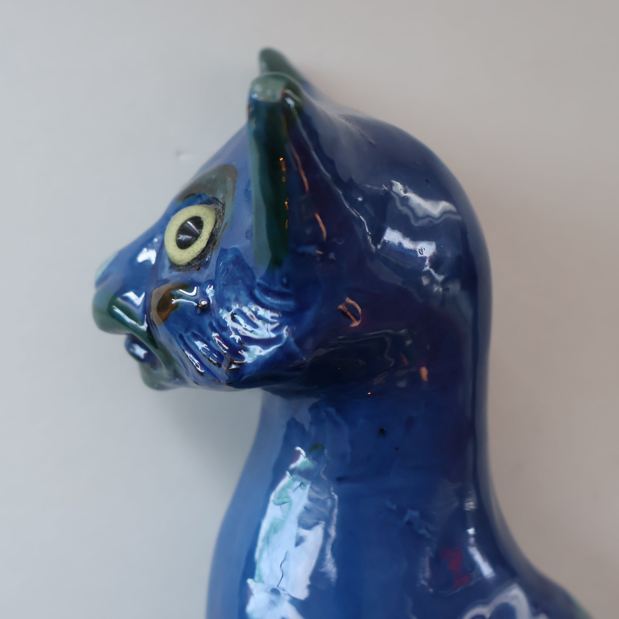 It is an attractive model which sits and looks straight ahead. His head is slightly cocked to one side in a quizzical manner. It is made of the customary Brannam red clay and decorated with a thick blue glaze. This blue body colour is further embellished with patches of olive green, rust and chocolate brown painted decoration to the body, as photographed. The cat has a green tail and green tip to his nose. There is some slipware ridges on the back of the cat to suggest the texture of his fur. My Kitty Cat has clear yellow glass eyes - these are original to the model and not later additions. It is certainly a very nice example.