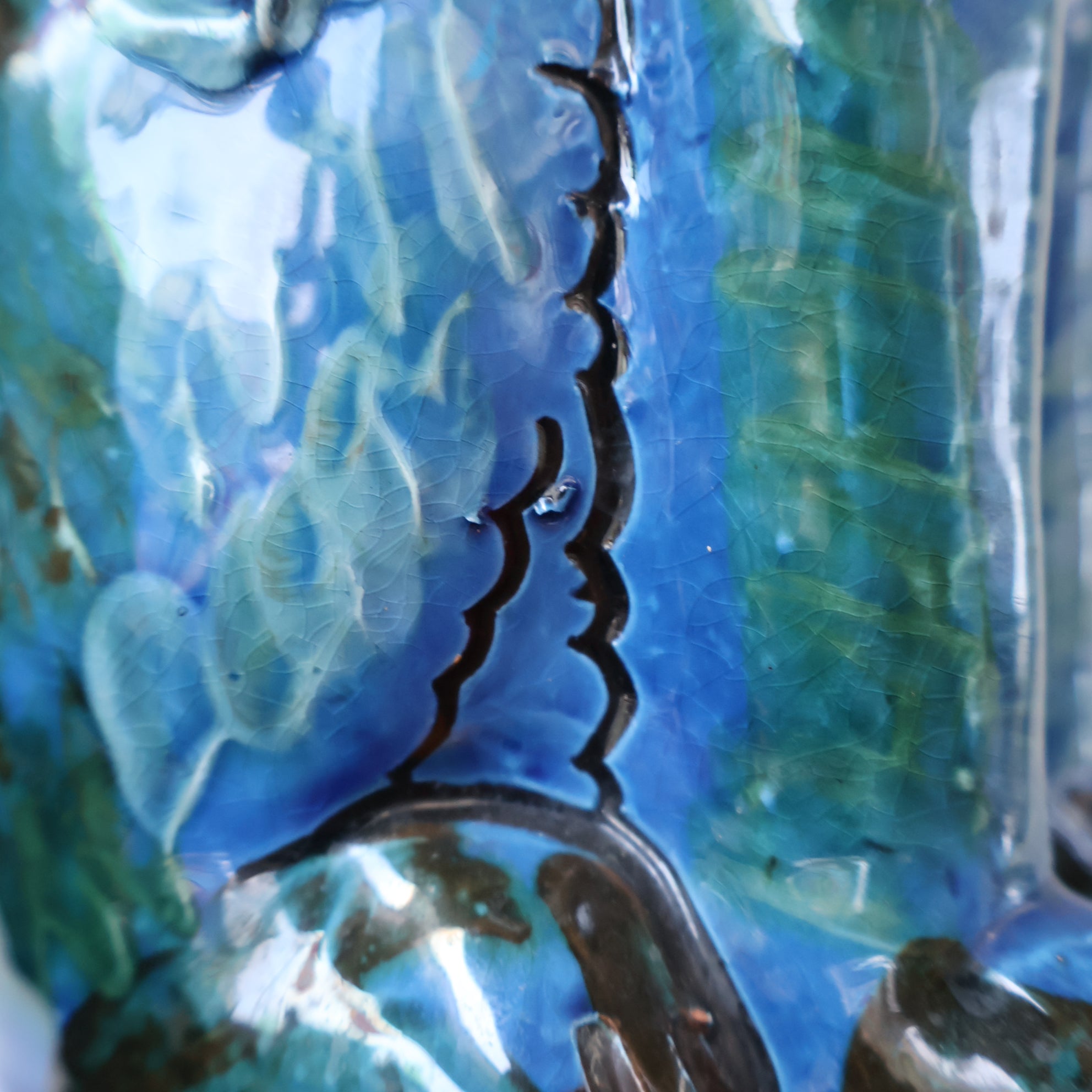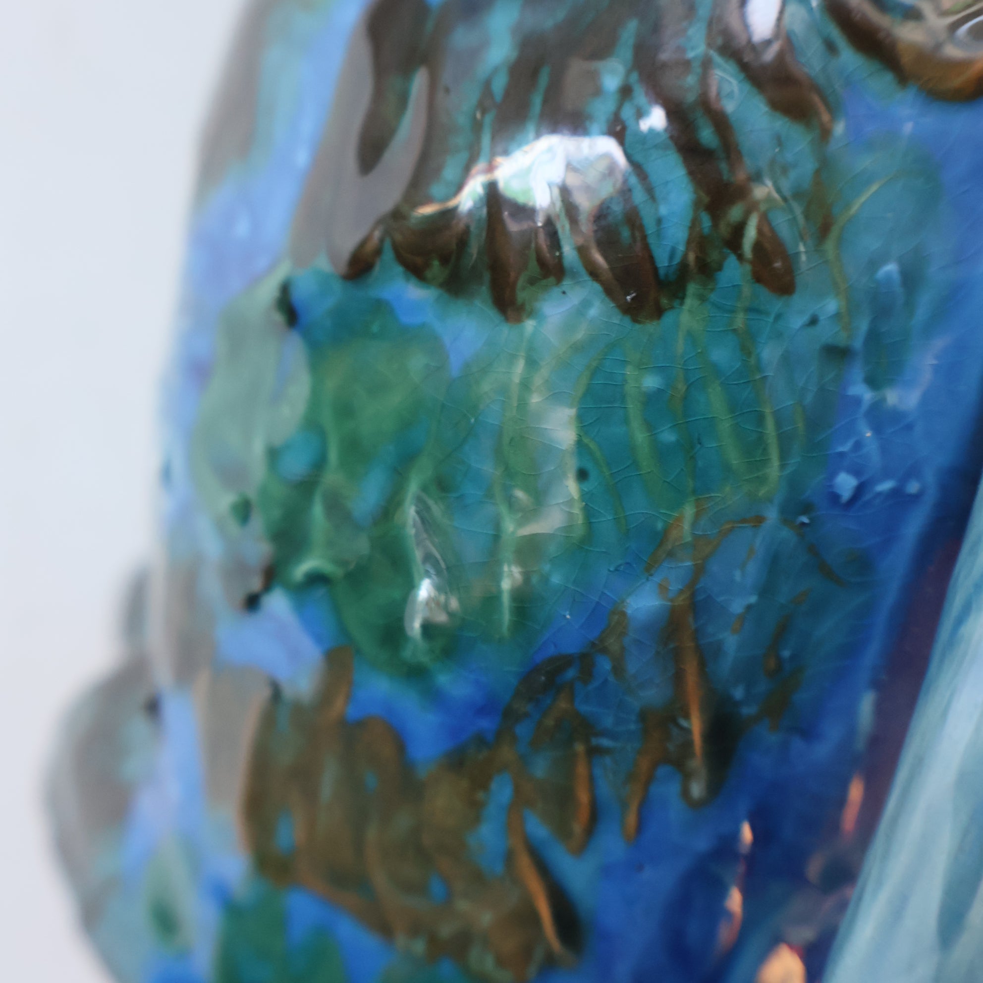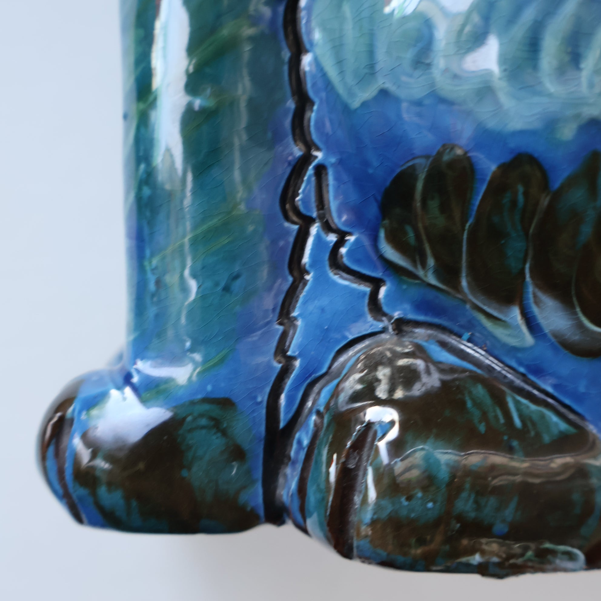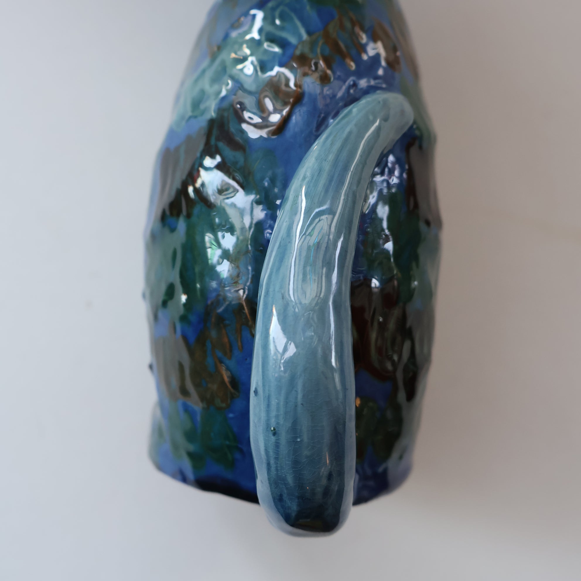It is an attractive model which sits and looks straight ahead. His head is slightly cocked to one side in a quizzical manner. It is made of the customary Brannam red clay and decorated with a thick blue glaze. This blue body colour is further embellished with patches of olive green, rust and chocolate brown painted decoration to the body, as photographed. The cat has a green tail and green tip to his nose. There is some slipware ridges on the back of the cat to suggest the texture of his fur. My Kitty Cat has clear yellow glass eyes - these are original to the model and not later additions. It is certainly a very nice example.
