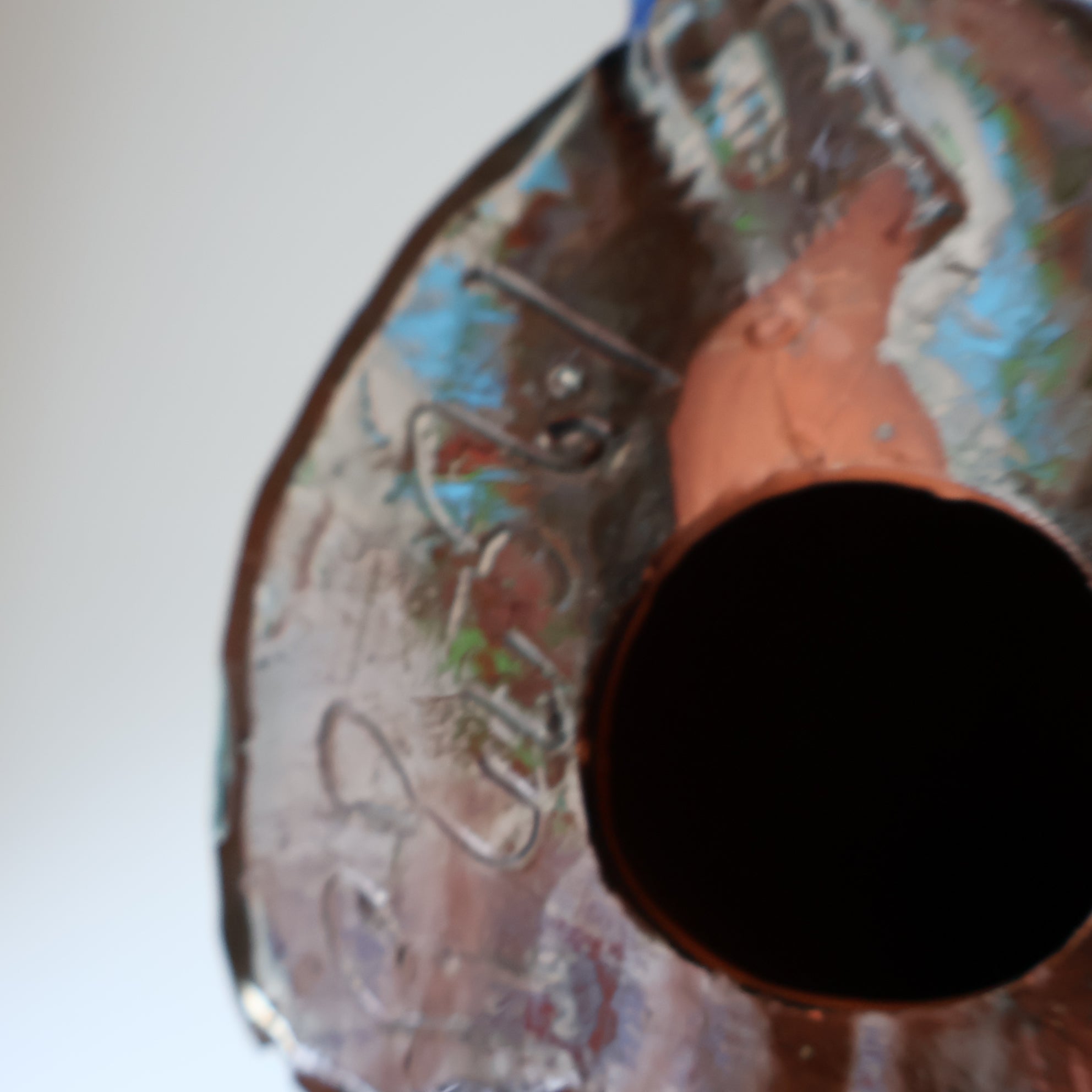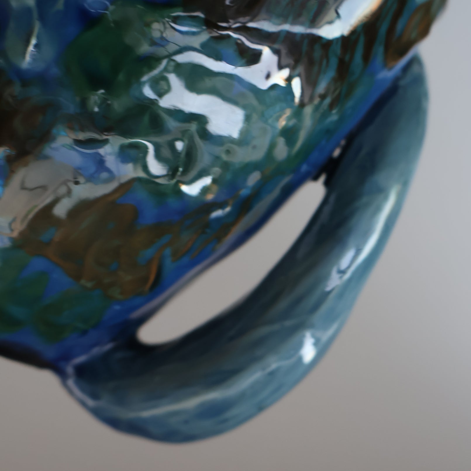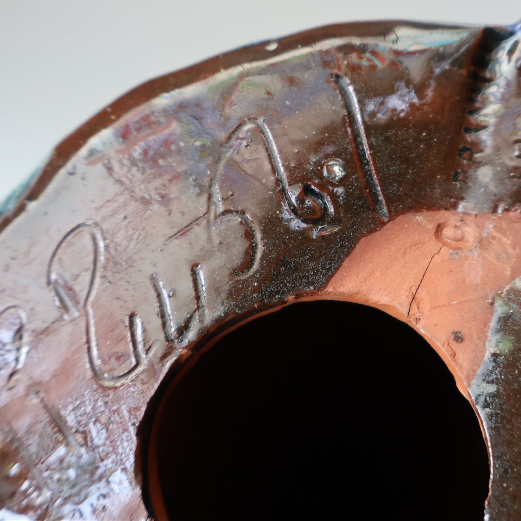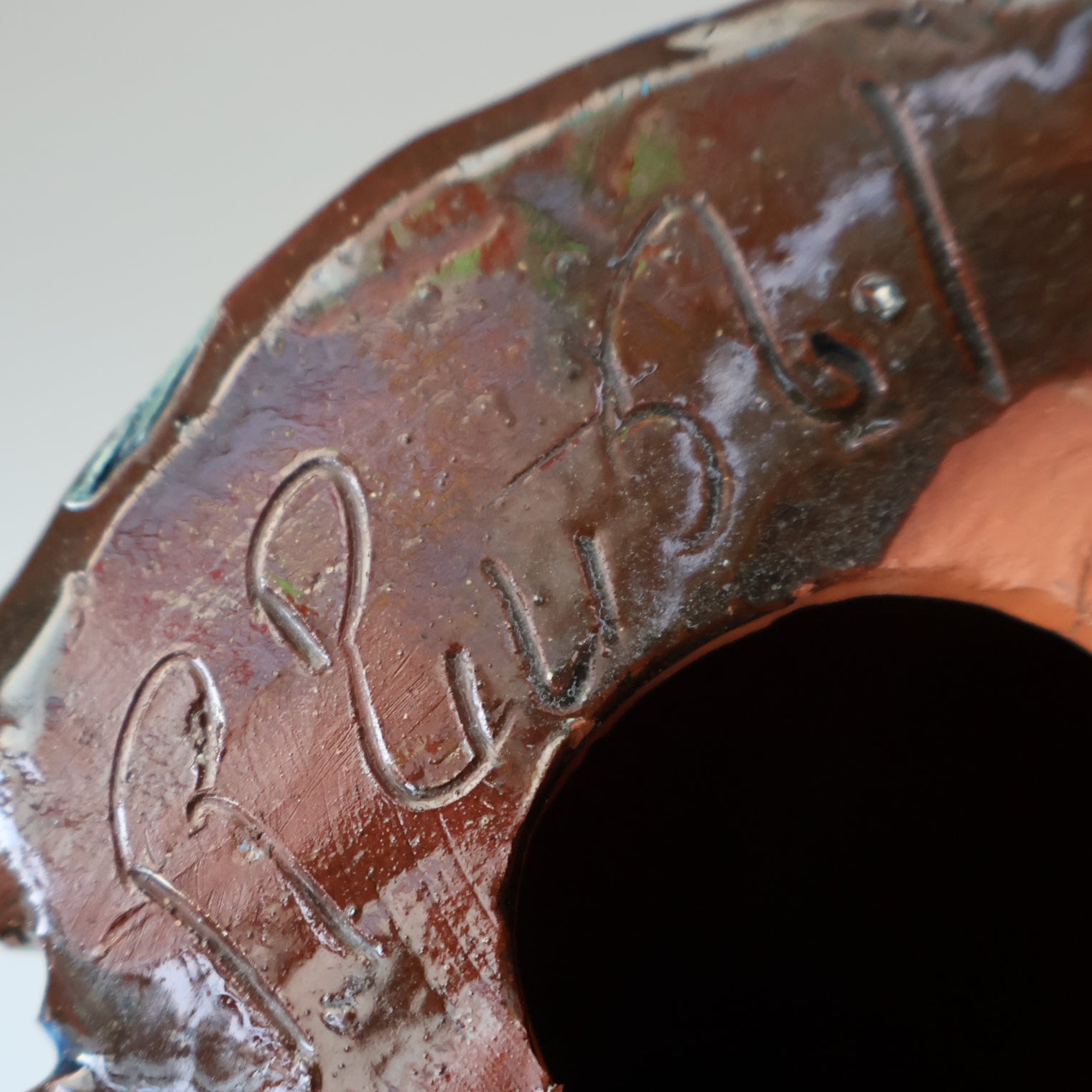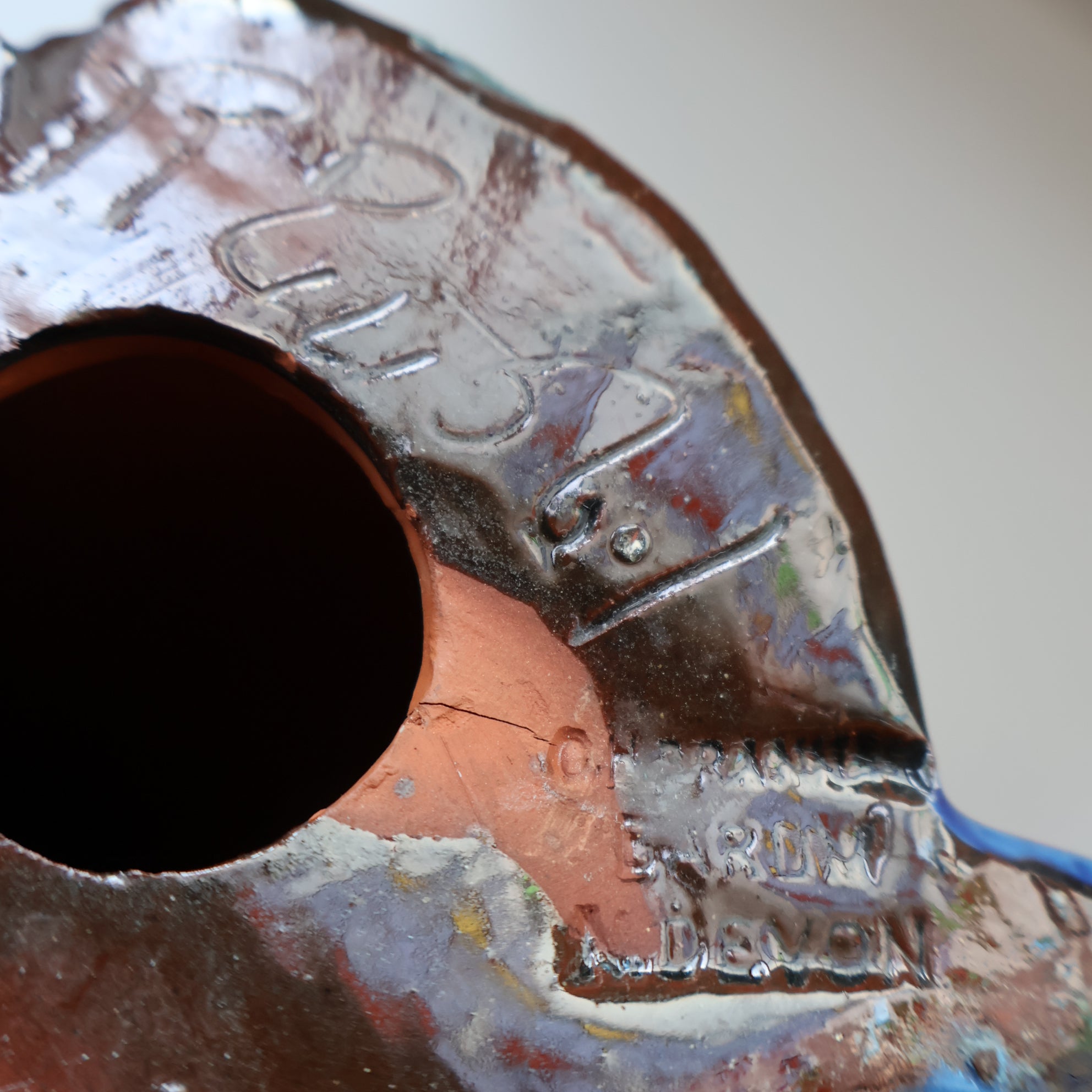 It is an attractive model which sits and looks straight ahead. His head is slightly cocked to one side in a quizzical manner. It is made of the customary Brannam red clay and decorated with a thick blue glaze. This blue body colour is further embellished with patches of olive green, rust and chocolate brown painted decoration to the body, as photographed. The cat has a green tail and green tip to his nose. There is some slipware ridges on the back of the cat to suggest the texture of his fur. My Kitty Cat has clear yellow glass eyes - these are original to the model and not later additions. It is certainly a very nice example.