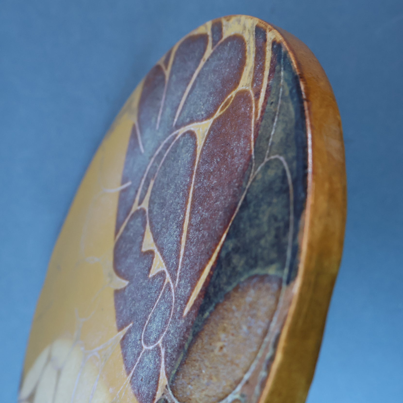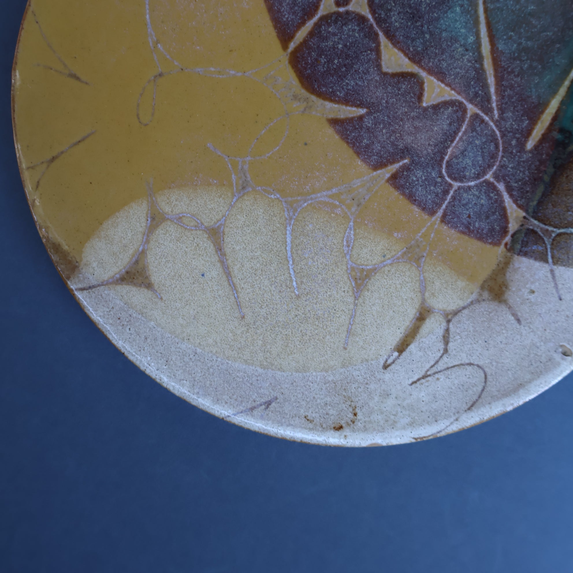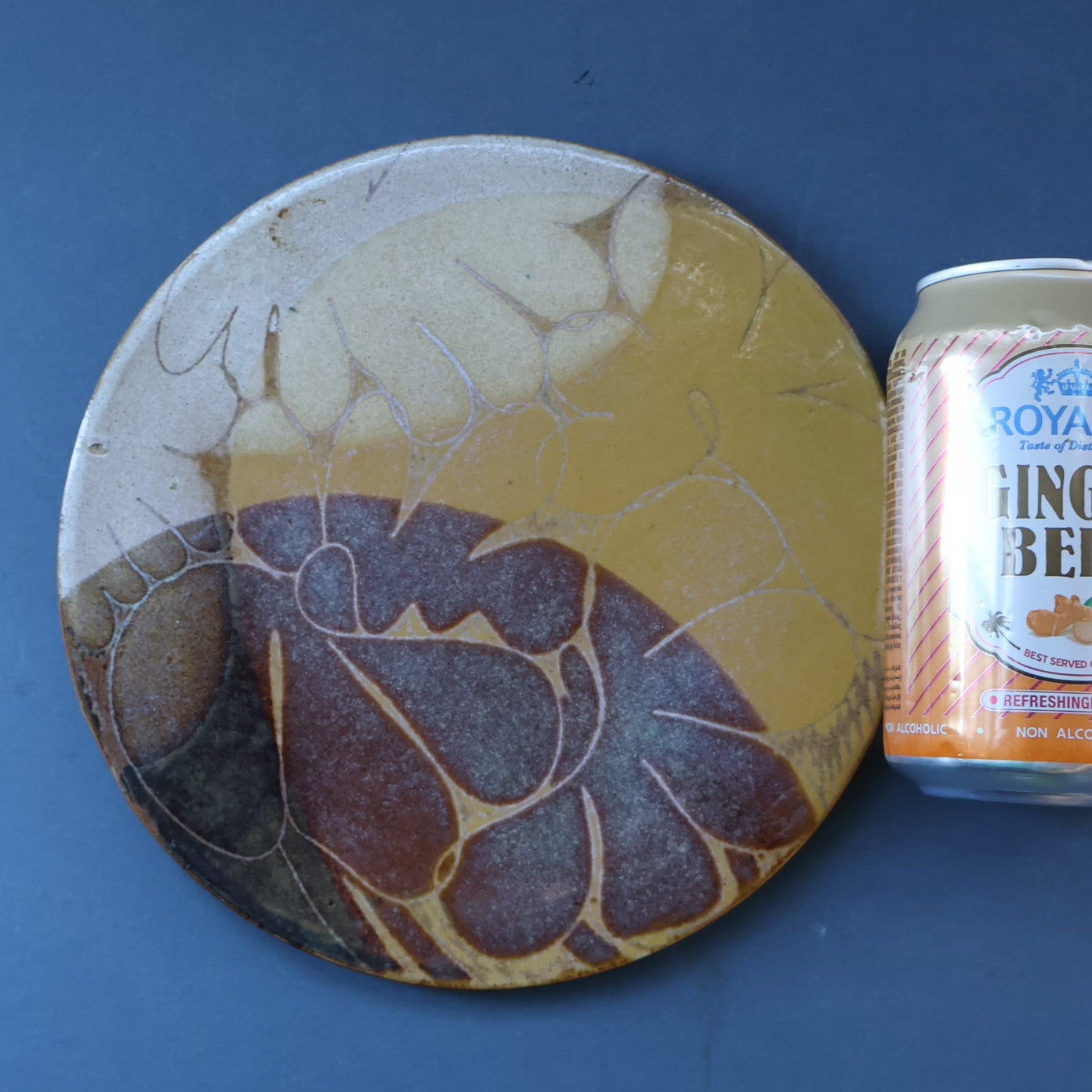 It dates to the 1980s. This one substantial teapot stand or trivet. It has a diameter of 8 inches and a depth of half an inch. The decoration is very painterly, and it is certainly a fabulous example. The image on the platter consists of abstract flower heads. I love the colours on this one - the warm grey, yellow ochre and brown-purple shades. A nice little art-work!