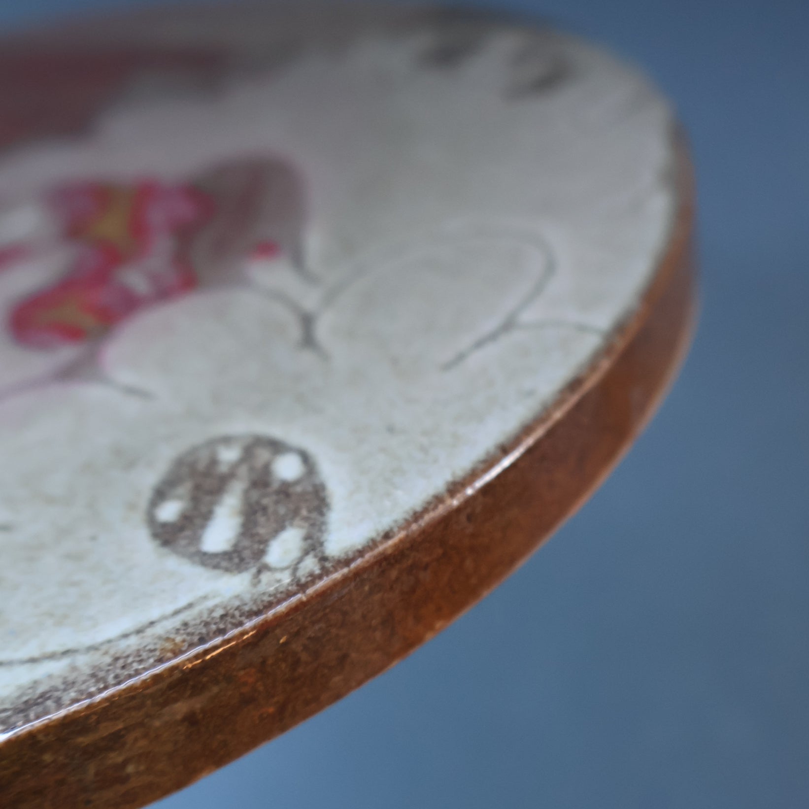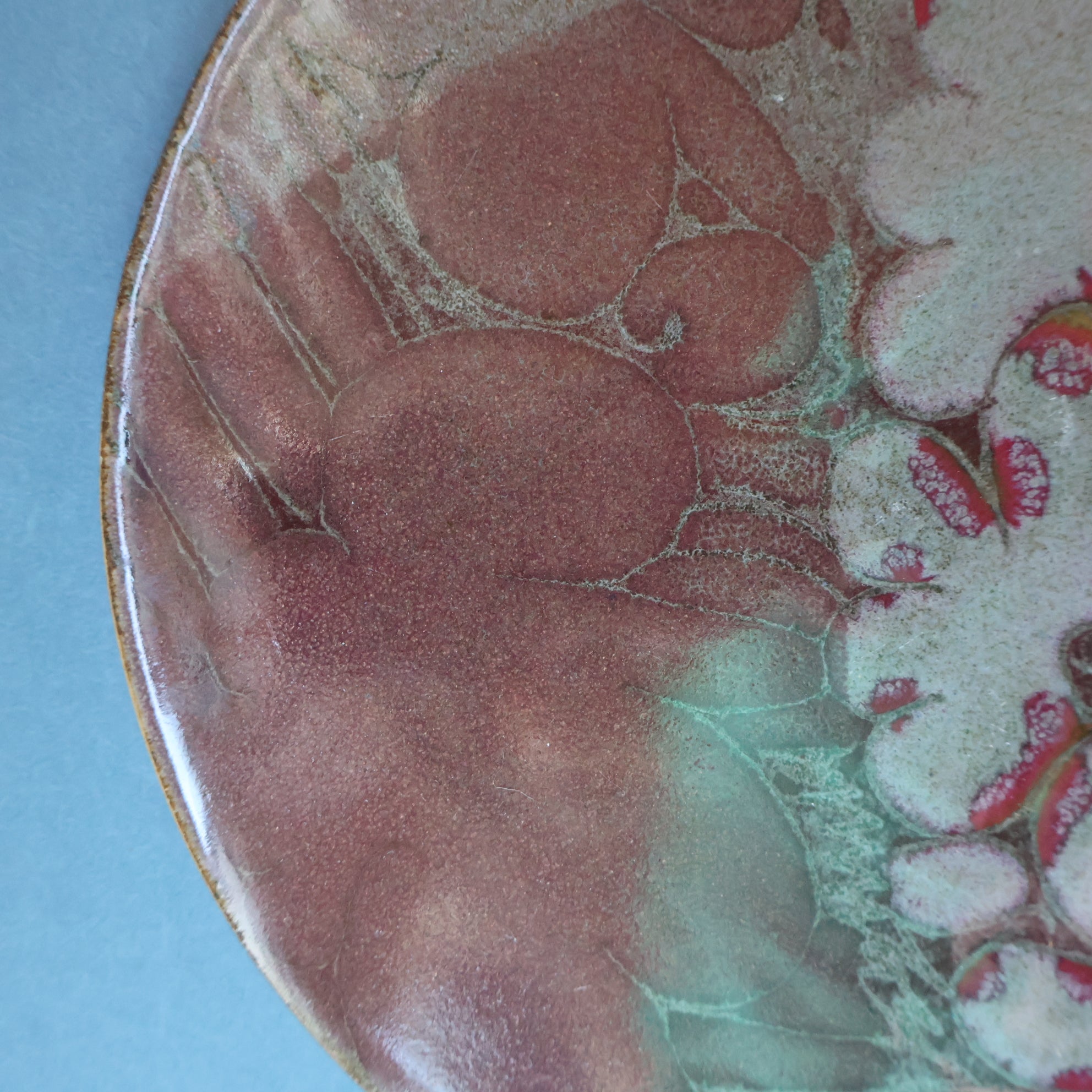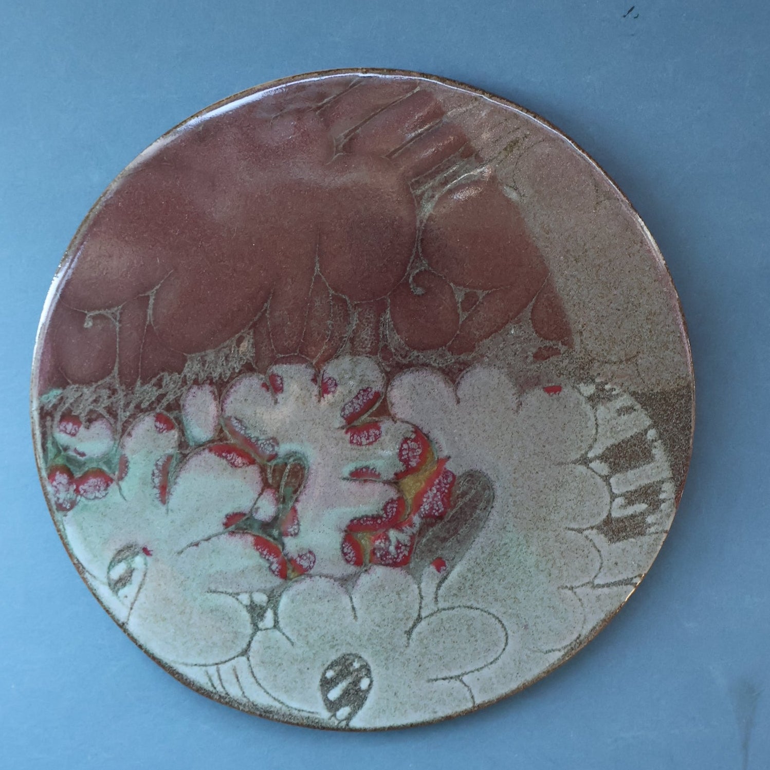 It dates to the 1980s. This one substantial teapot stand or trivet. It has a diameter of 8 inches and a depth of half an inch. The decoration is very painterly, and it is certainly a fabulous example. The image on the platter looks like a countryside landscape with the tops of grey bushes foreground and in distance are dark plum abstracted tree tops.