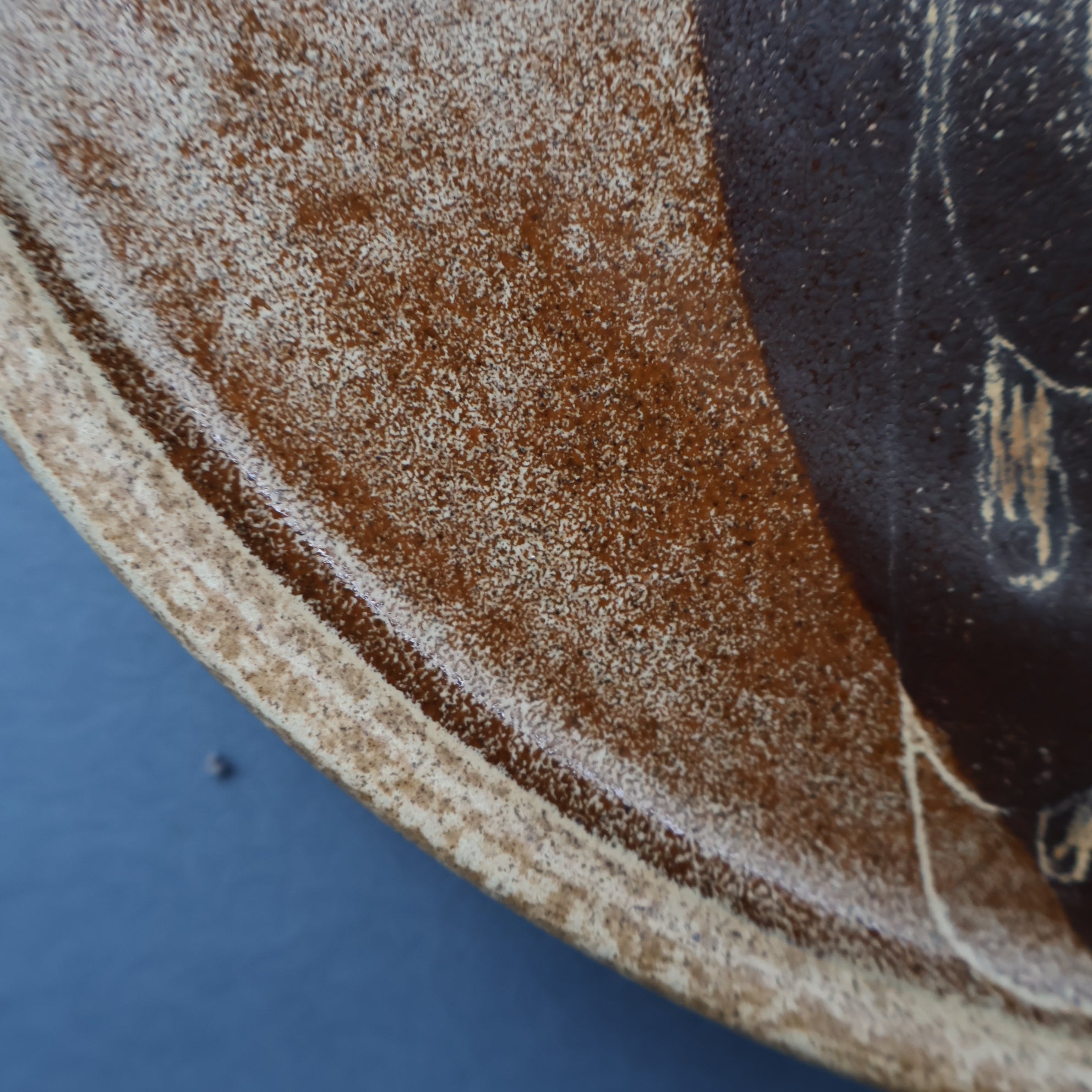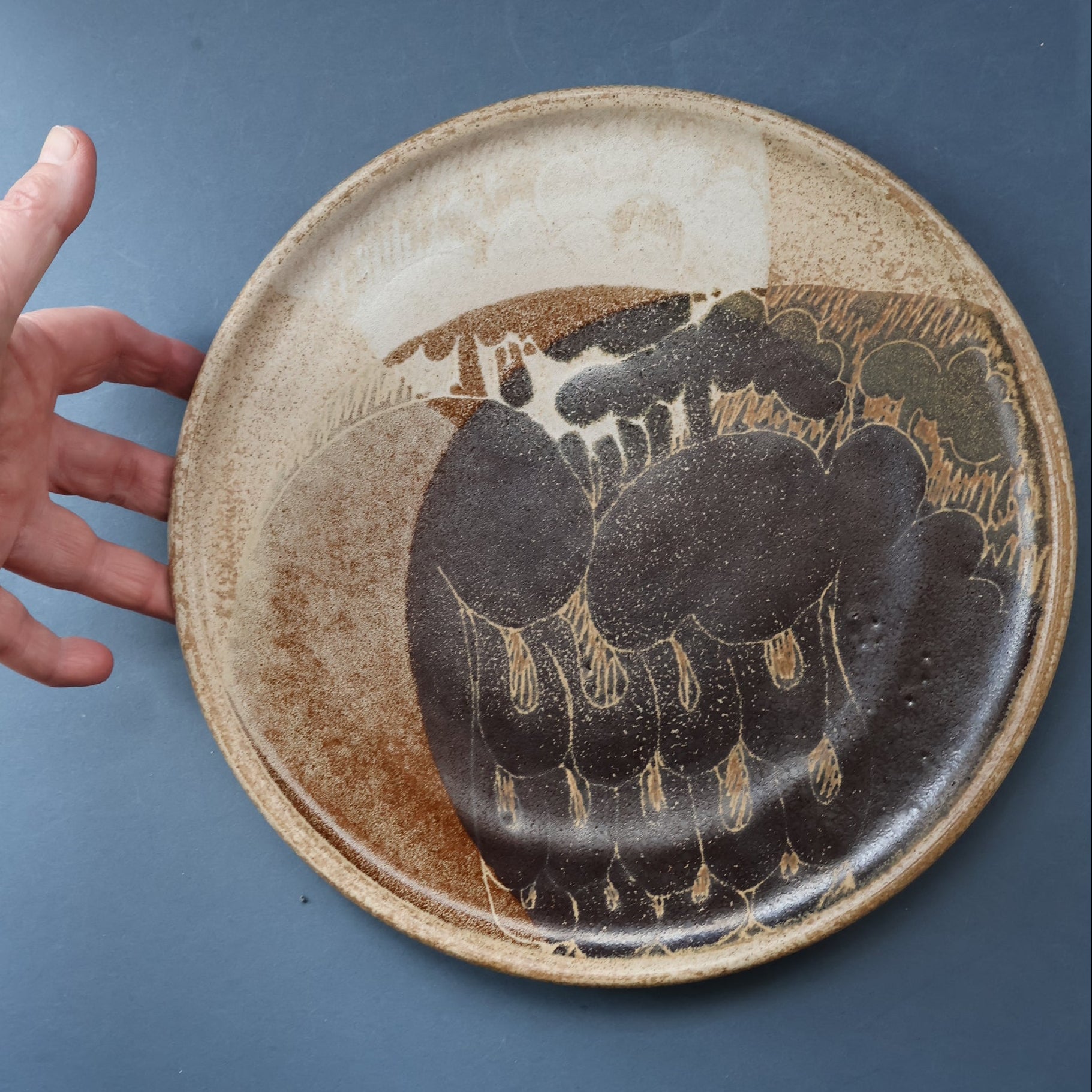 It dates to the 1980s. This one is larger stoneware plate or platter. It has a diameter of 10 1/2 inches (900 grams in weight). The decoration is very painterly, and it is certainly a fabulous example. The image on the platter looks like a countryside landscape with the tops of bushes or trees in the foreground depicted with a plum / brown glaze. Receding into the distance are dark beige fields to the side with more trees onto the horizon and a lighter sky section to the top of the design.