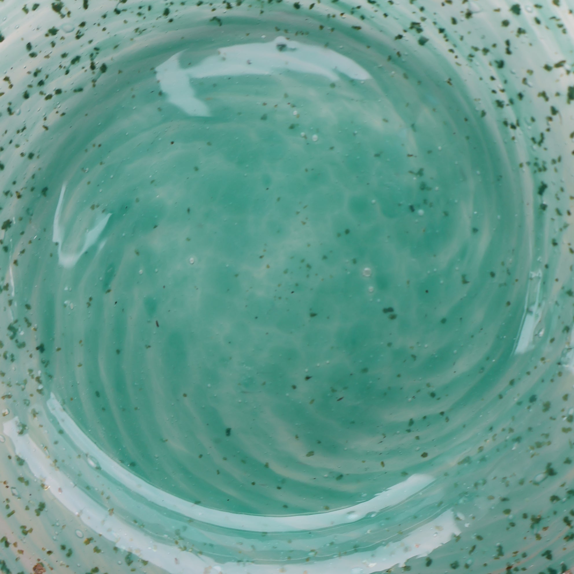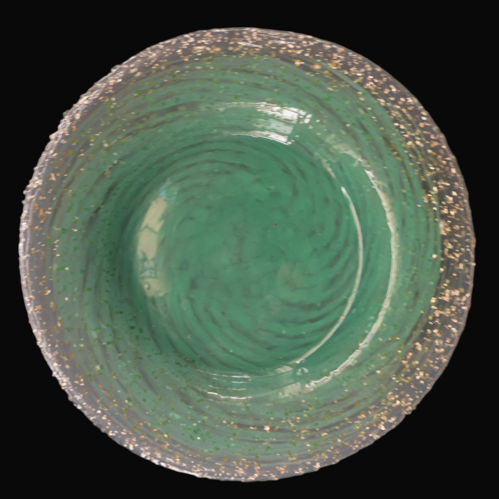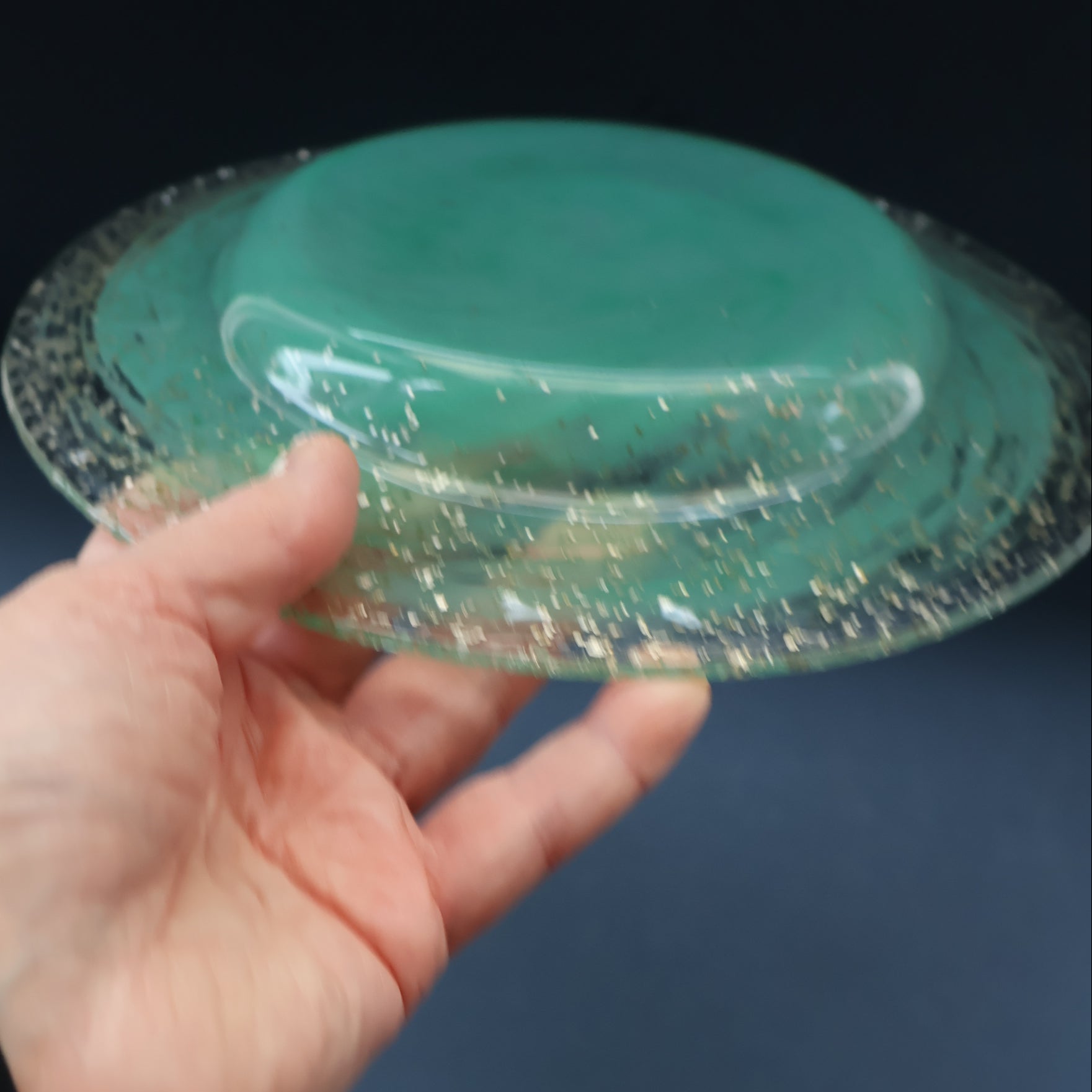 This is a good starter piece for your collection of Monart glass. The body colour is a mottled sea-green glass. Around the rim, there is a clear glass bans which is liberally speckled with lots of gold aventurines that twinkle in the light. The base is polished and there is a polished pontil mark. It has no label - but it is definitely an old Monart glass dish and is being sold as such.