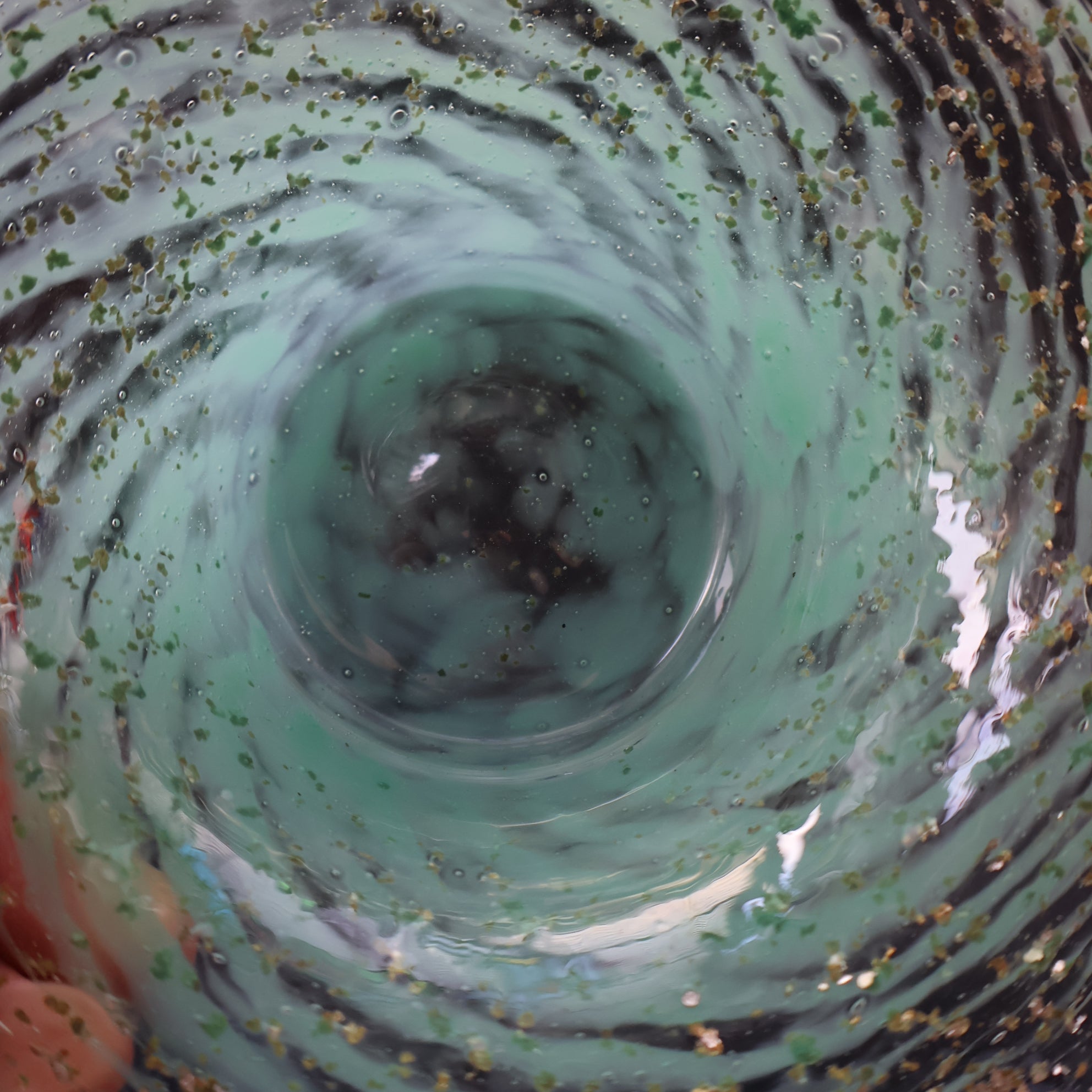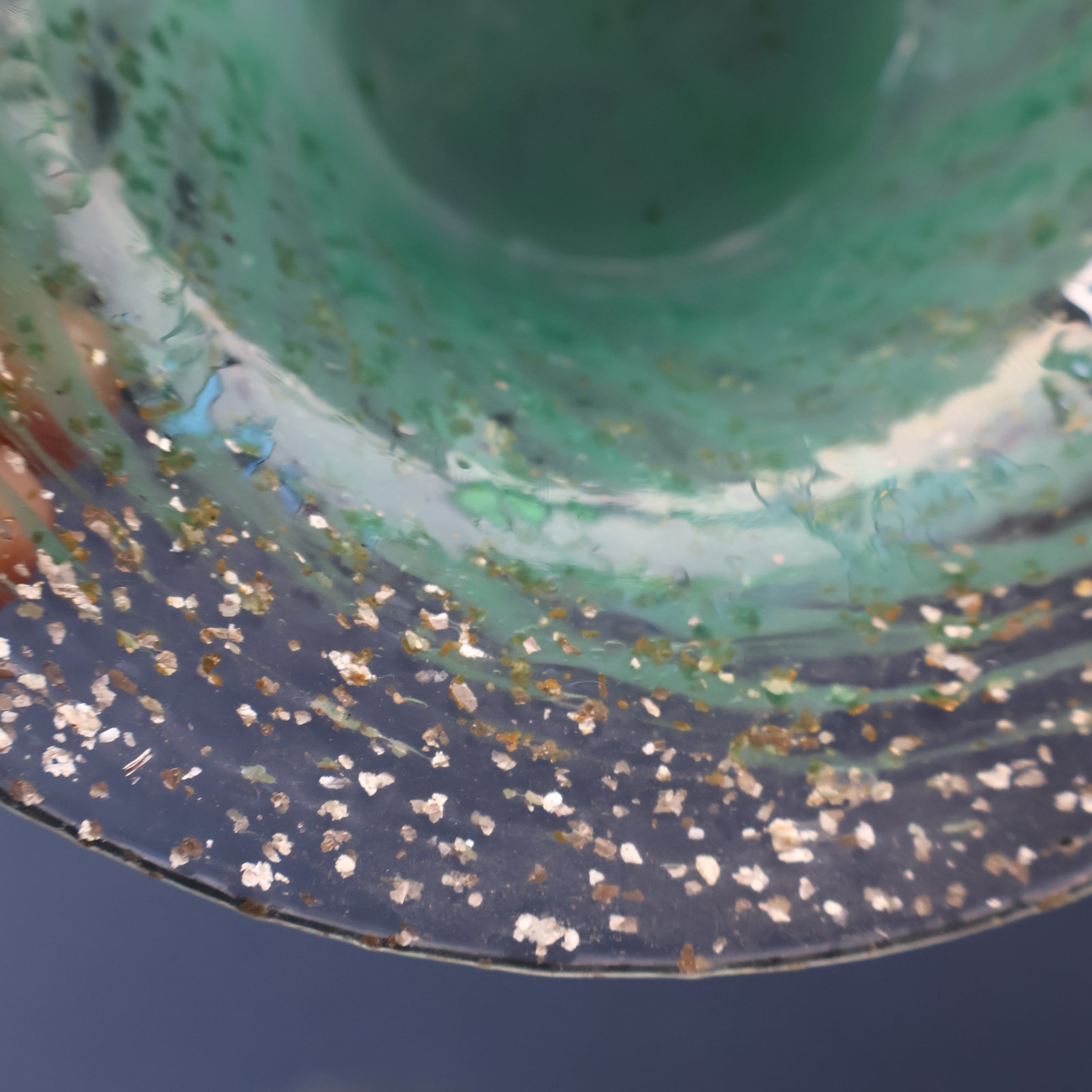 This is an attractive pair of Monart glass bowls. They are both a subtle aqua green colour with a clear band around the rim. The green glass has little swirls of darker green flecks and there are swirls of silver / gold aventurine around the rim. They are not of an identical size (being hand -blown) but are both are about the following size: The base is 2 3/4 inches and flares out to a rim measuring 6 inches. They both have a height of 2 1/4 inches I have a total of six of these on my website - listed as three pairs. All are in good condition with no damages. They have a flat polished out pontil mark on the base.