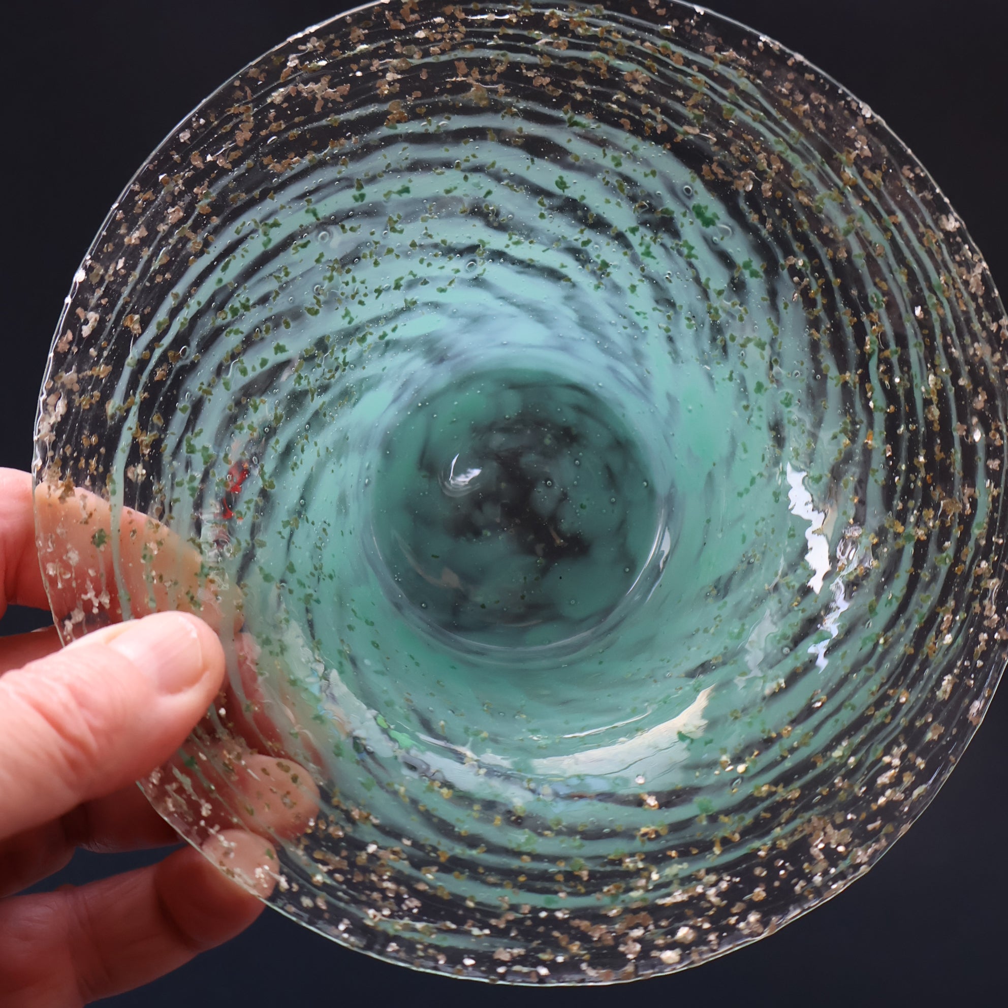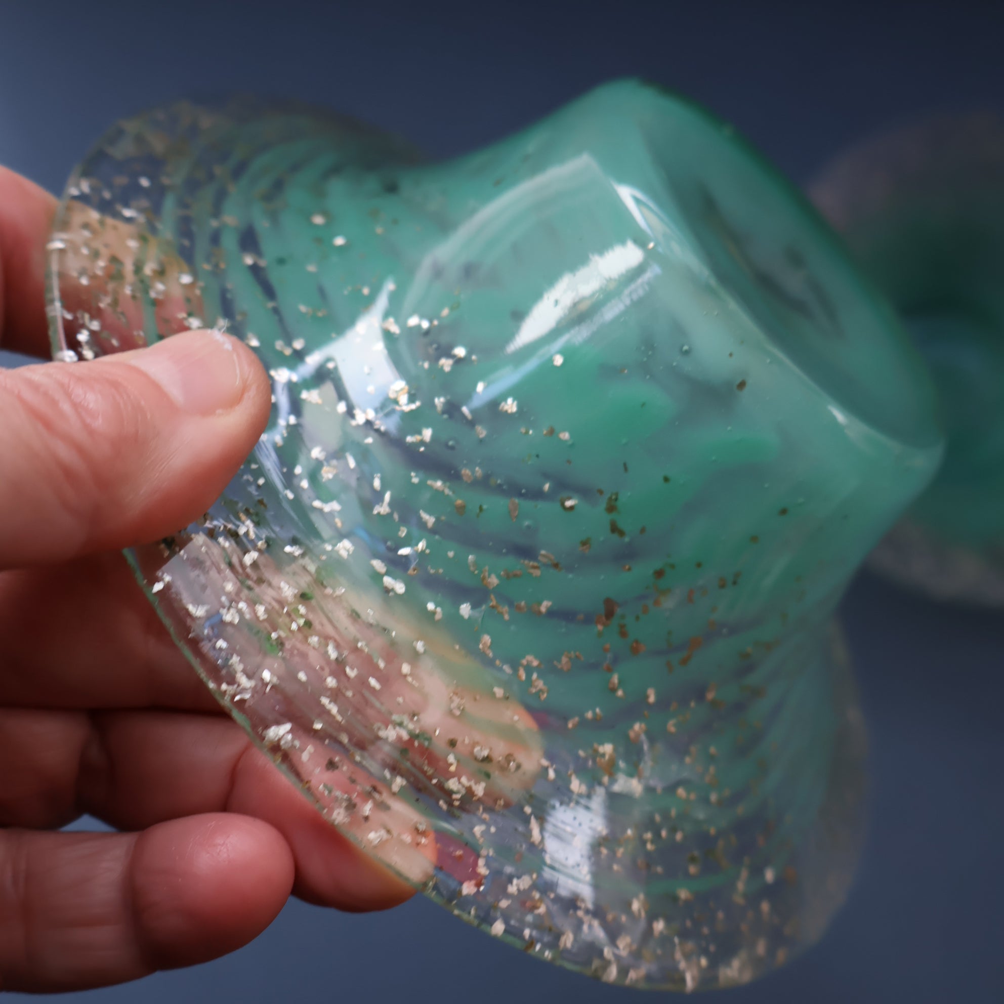 • Load image into Gallery viewer, SCOTTISH GLASS. Collectable Small PAIR of 1930s Monart Bowls. Aqua with Silver Aventurine (G)