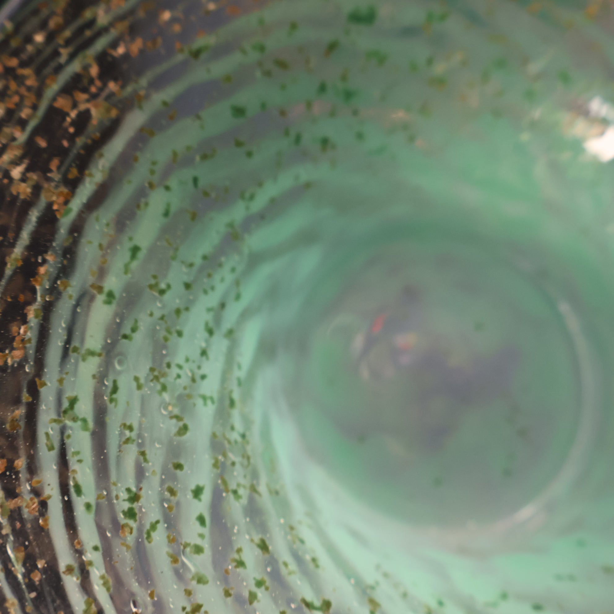 SCOTTISH GLASS. Collectable Small PAIR of 1930s Monart Bowls. Aqua with Silver Aventurine (G)