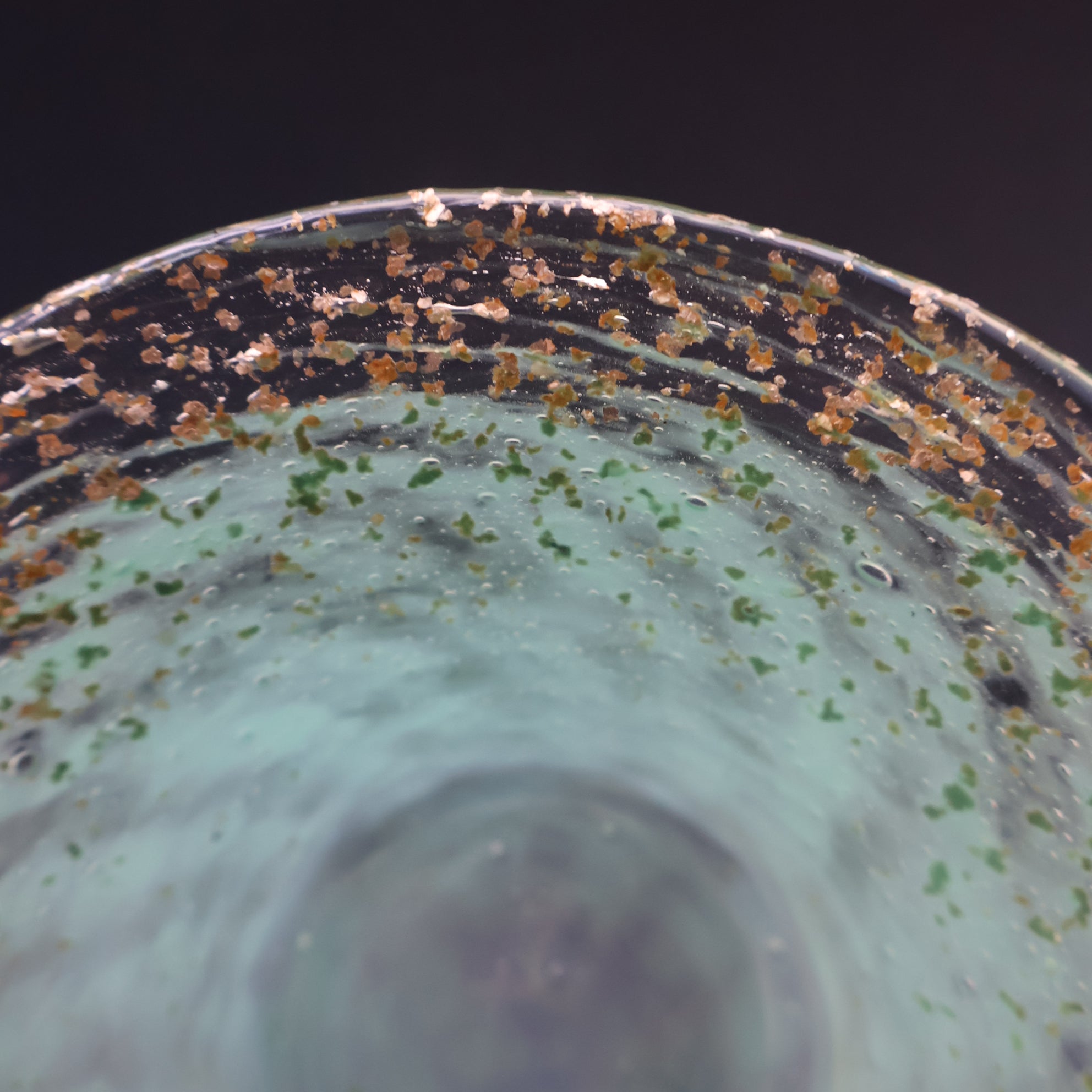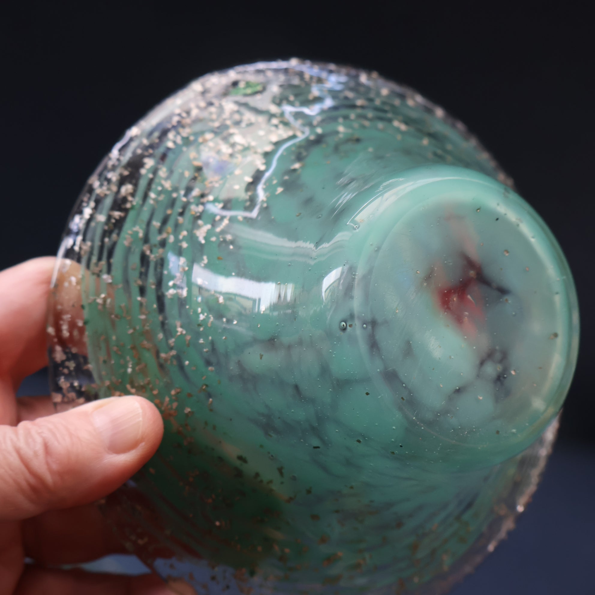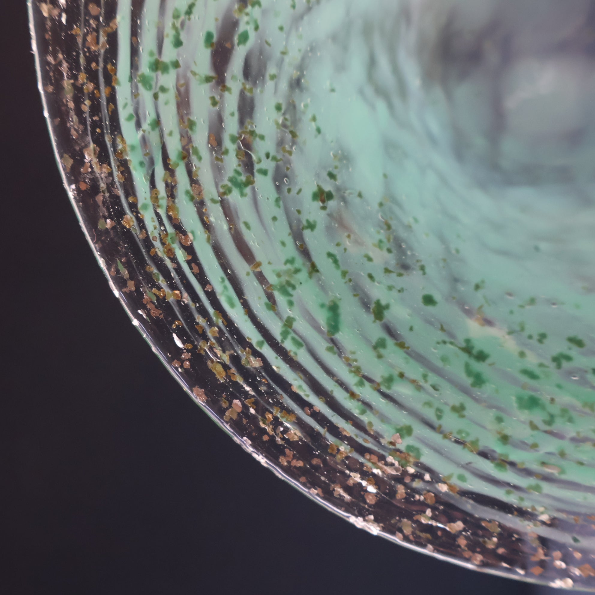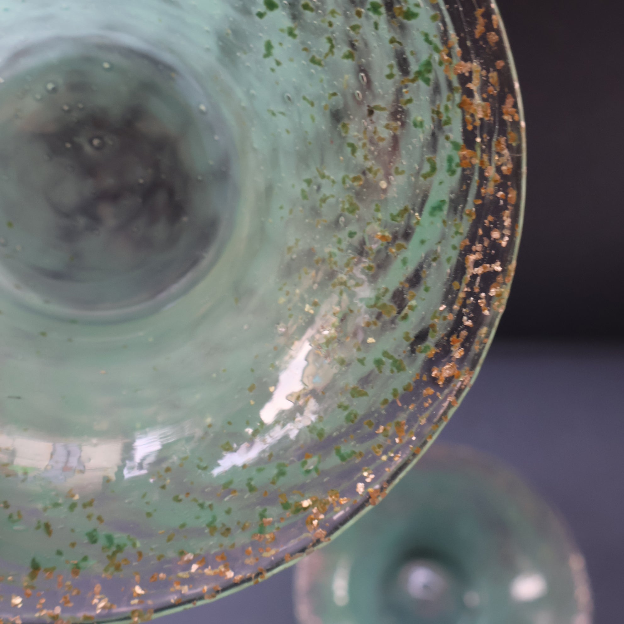 This is an attractive pair of Monart glass bowls. They are both a subtle aqua green colour with a clear band around the rim. The green glass has little swirls of darker green flecks and there are swirls of silver / gold aventurine around the rim. They are not of an identical size (being hand -blown) but are both are about the following size: The base is 2 3/4 inches and flares out to a rim measuring 6 inches. They both have a height of 2 1/4 inches I have a total of six of these on my website - listed as three pairs. All are in good condition with no damages. They have a flat polished out pontil mark on the base.