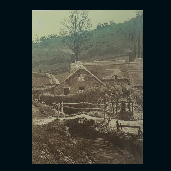 This etching is almost photographic in feel and it certainly is a very fine etching and colour aquatint by the Evernden. It is called Grasshopper Brook and you can see the little river running out of the composition towards the lower right corner. A little rustic humpback bridge crosses the brook. It is a winter scene and the rural landscape is covered in snow. In the mid-distance is a little country cottage with slopping roof and another converted barn behind. I love the two wisps of smoke billowing out of the chimneys. The sun is low in the sky and it is a hazy day. The sunlight just manages to be seen above the tree tops in the distance - and there is a very pale lemon glow. A big tree devoid of leaves with spindly branches dominates the space behind the dwelling house. Brrrr! you can almost feel how cold it is in the little hamlet.
