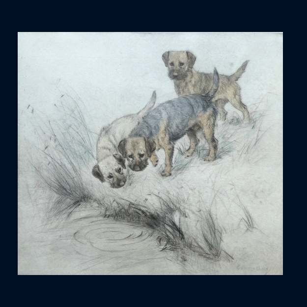 This beautifully rendered etching shows three little Border Terriers standing at the side of an overgrown river bank. They hear a noise in the water and a little creature disappearing under the surface and all that is left are ripples. They are curious as to what has caused the noise and two to them peer into the murky waters.