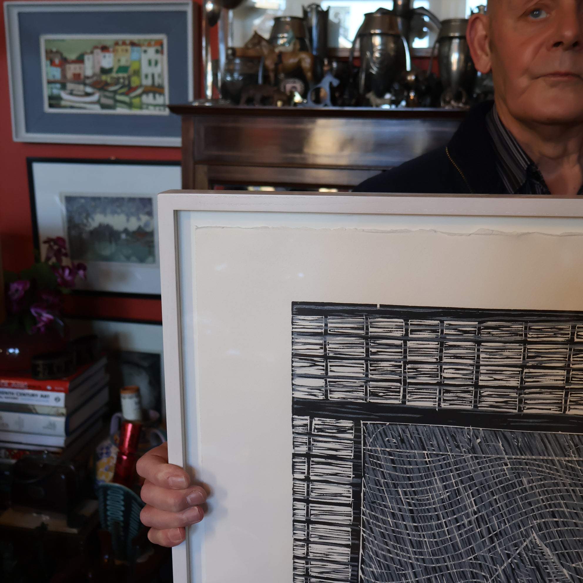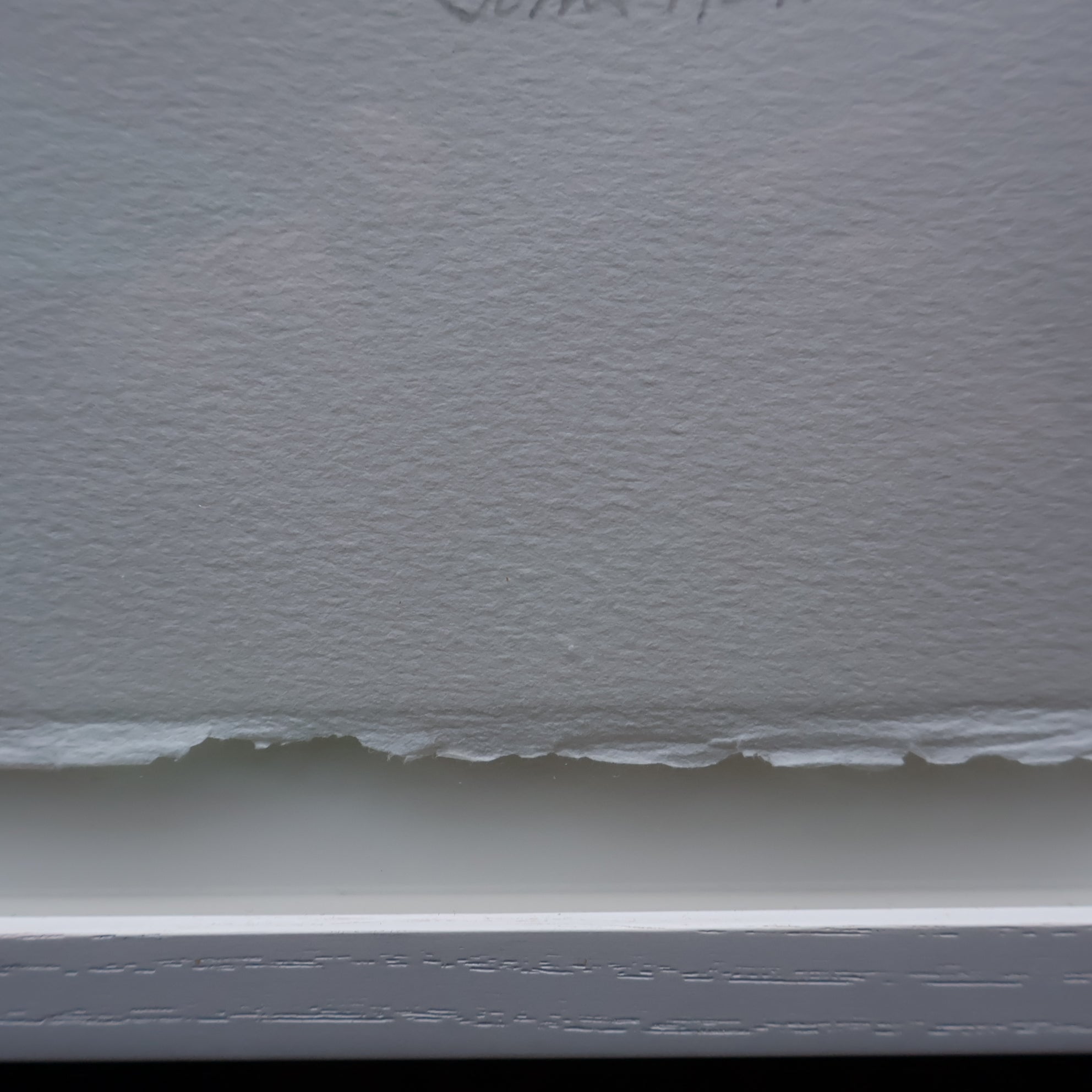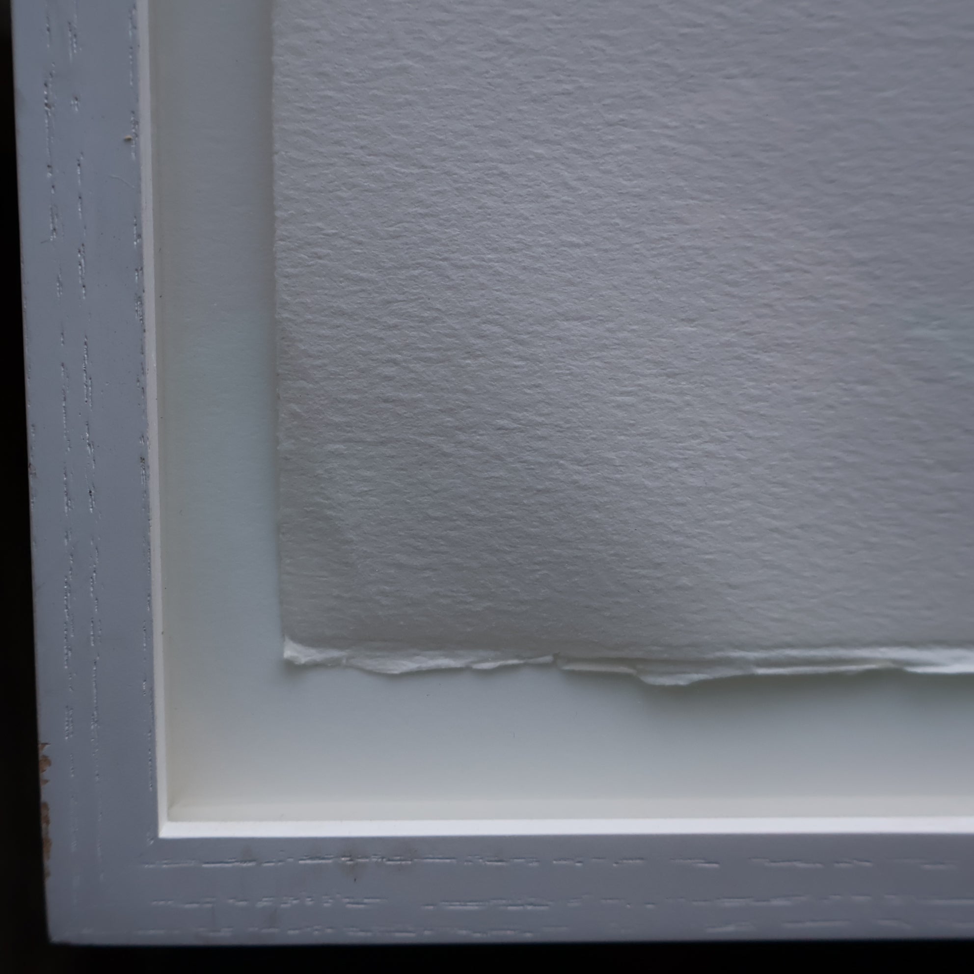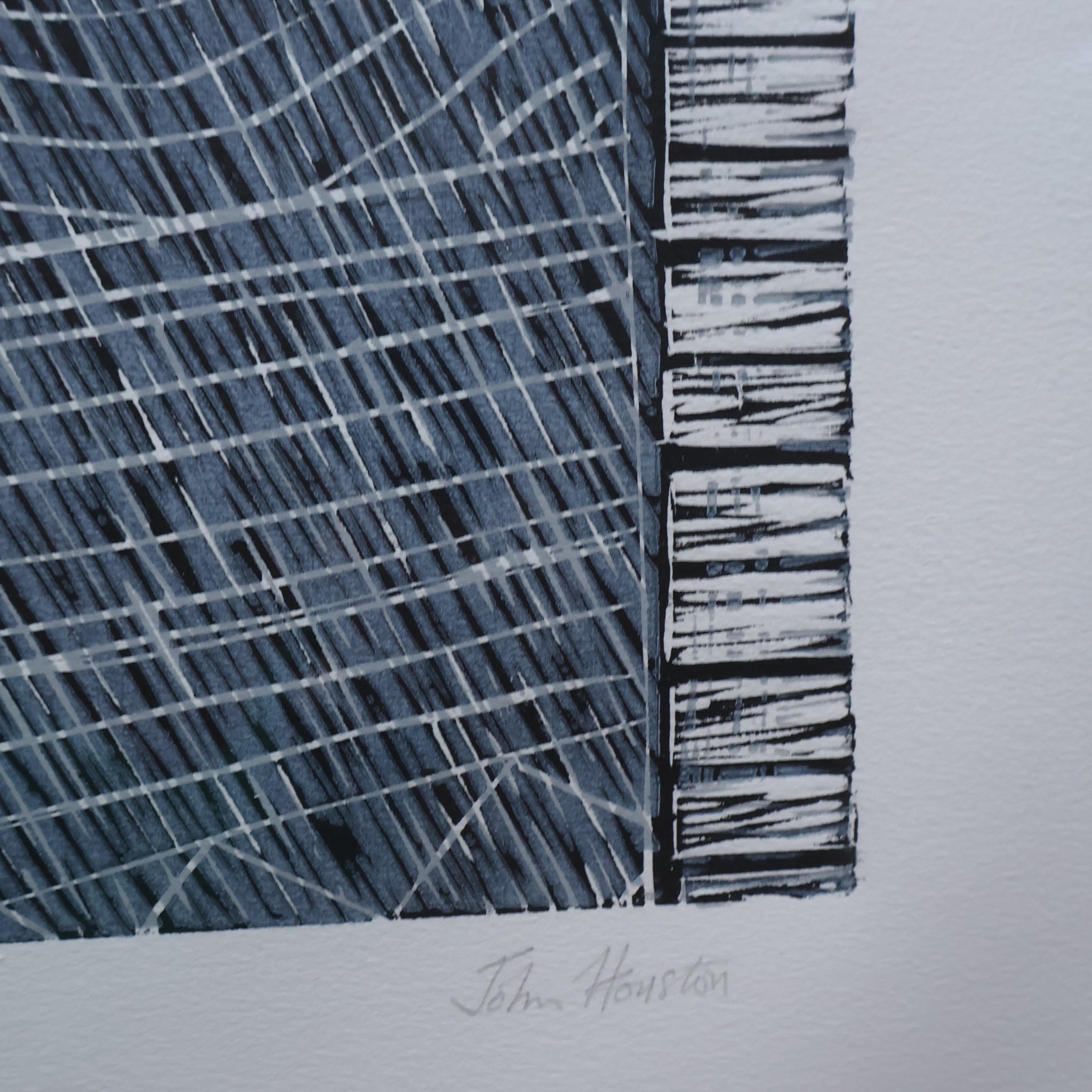 This fine print by Houston was published by the Glasgow Print Studio in 1989 and it is in good original ready to hang condition. It is printed on a full sheet with its deckled edges showing in a floating mount. It has been framed in London and comes in a heavy frame with thick white wood moulding and has plexiglass.