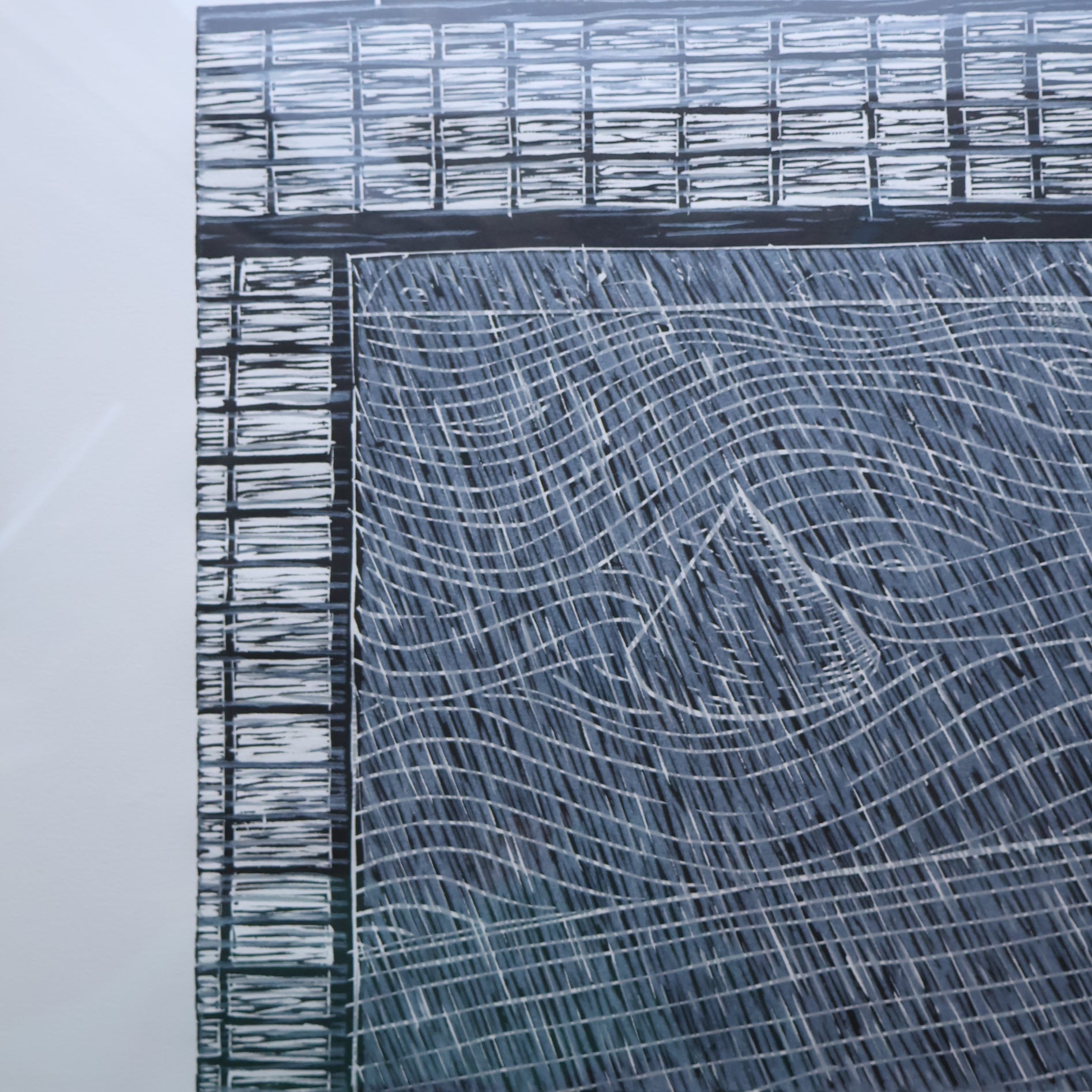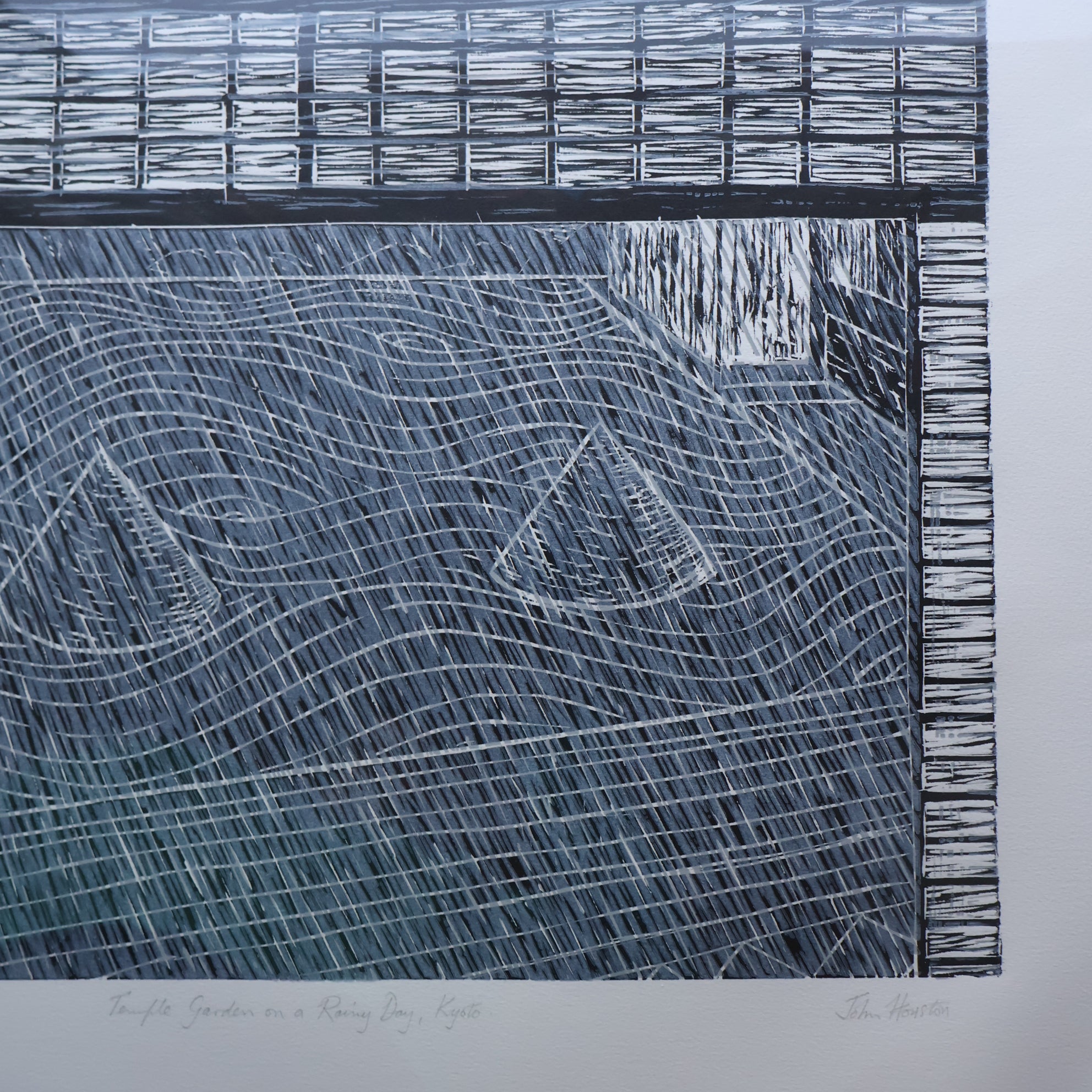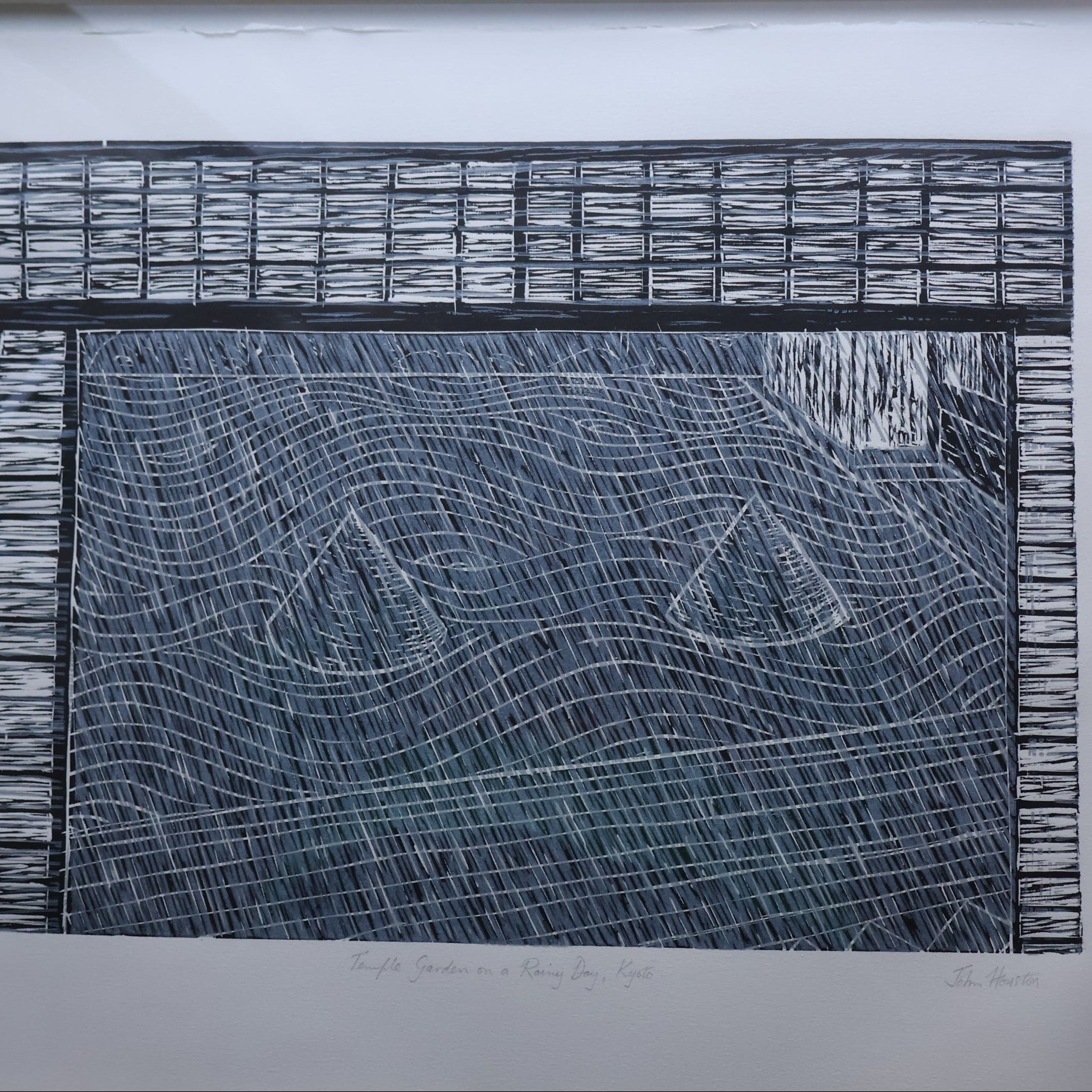 Houston has taken great delight in carving out all the intricate lines making up the busy composition. Houston made his first of three visits to Japan in 1986. His travels to Japan with his wife fostered a special creative partnership and inspired their work and home life. They built a Japanese-style garden and tea house at their home in Edinburgh.