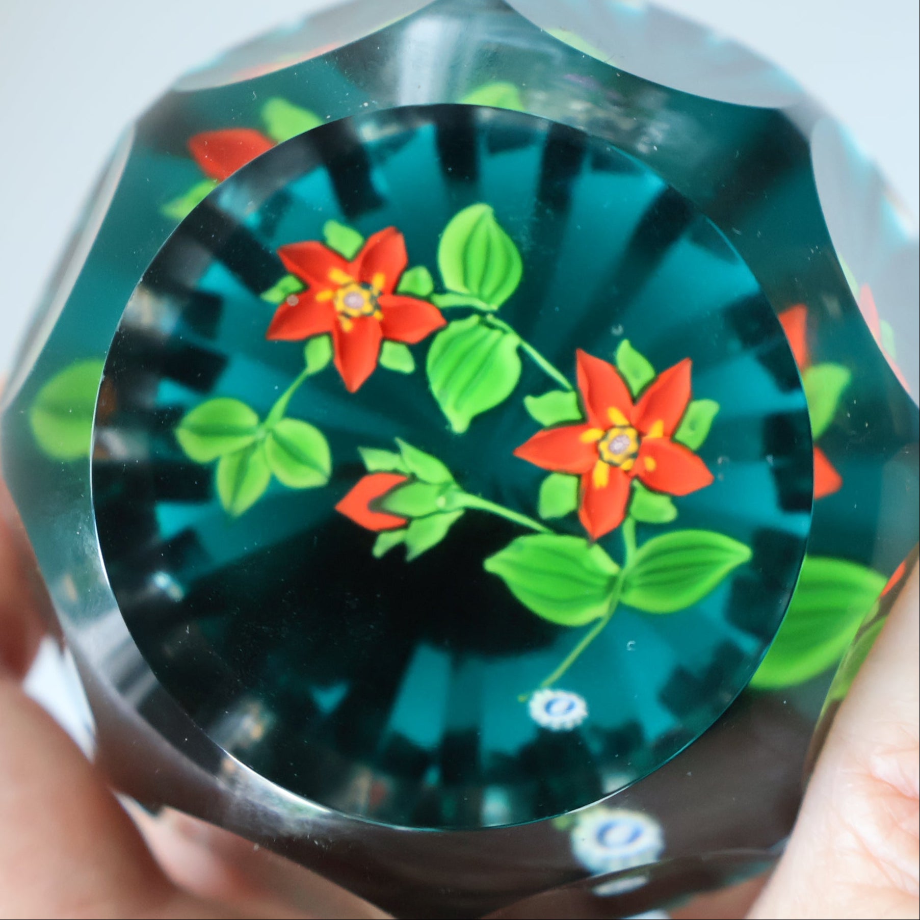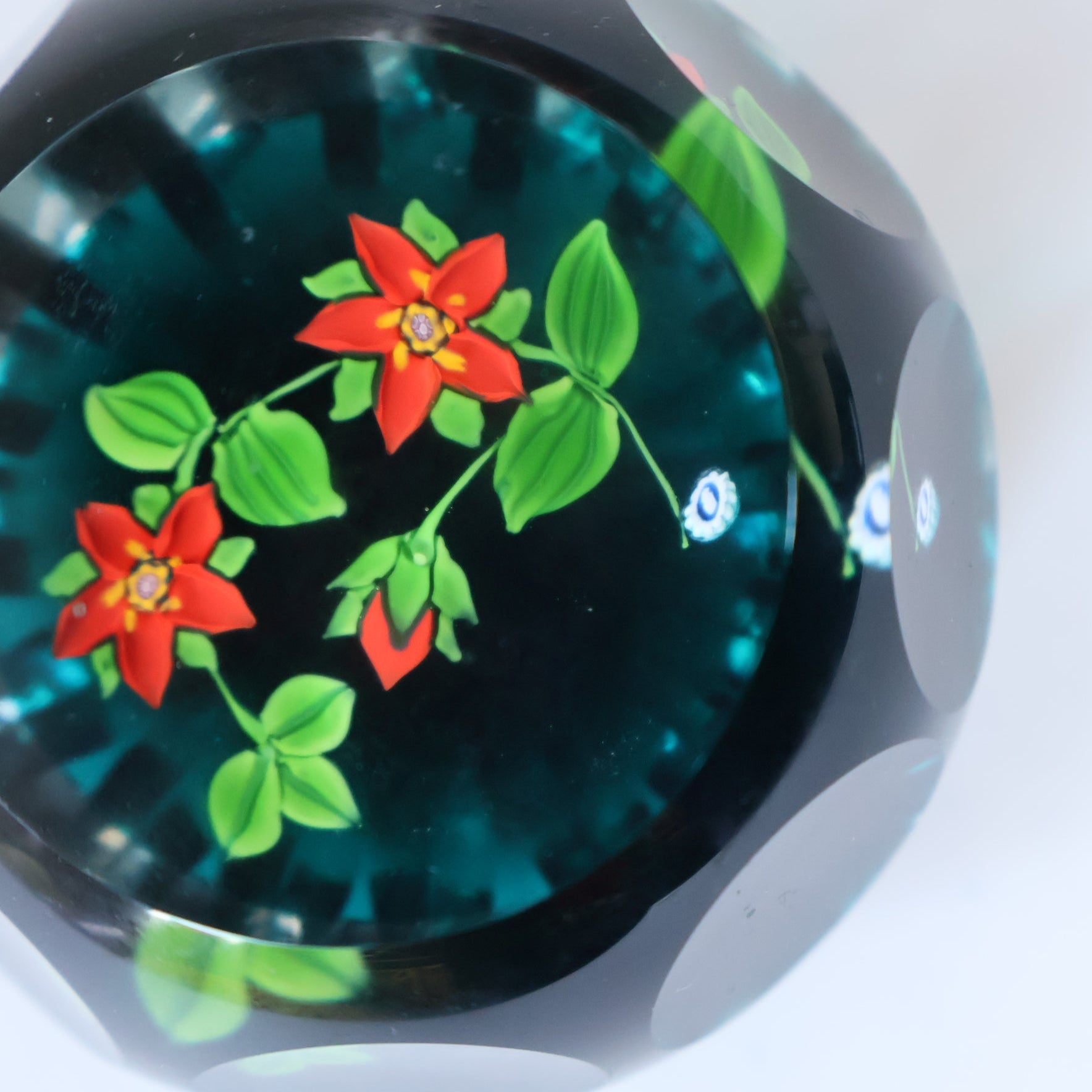 It has a little signature blue Butterfly / or Monks cane on the green ground (it is hard to make out the actual central image on the cane). This paperweight has a very dark green coloured ground. The base is deeply faceted and each faceted finger runs up the side to meet the level of green base colour. The floral arrangement inside consists of two red clementis flowers with yellow centers and another bloom is still in bud. There are lots of vivid green leaves. The lampwork used in the creation of the flowers is certainly very skillful. There are also circular polished facets (eight in total) around the top half of the weight. The top is flat with a polished viewing facet so you can easily see the flowers inside.