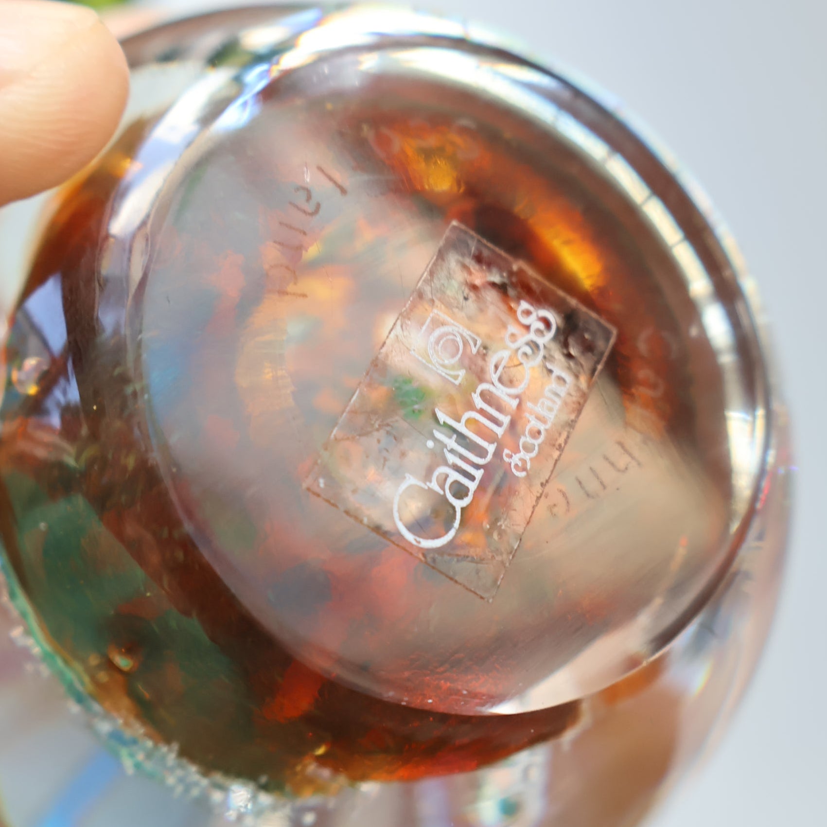 This is another one of my vintage Scottish Caithness Glass paperweights. This is a lovely vintage paperweight entitled Myriad. It was issued in 1978 and made at their Oban Studios. It is a harder to find weight. I have two of these in my store. This one in amber - and another in the a blue / green colour range.
