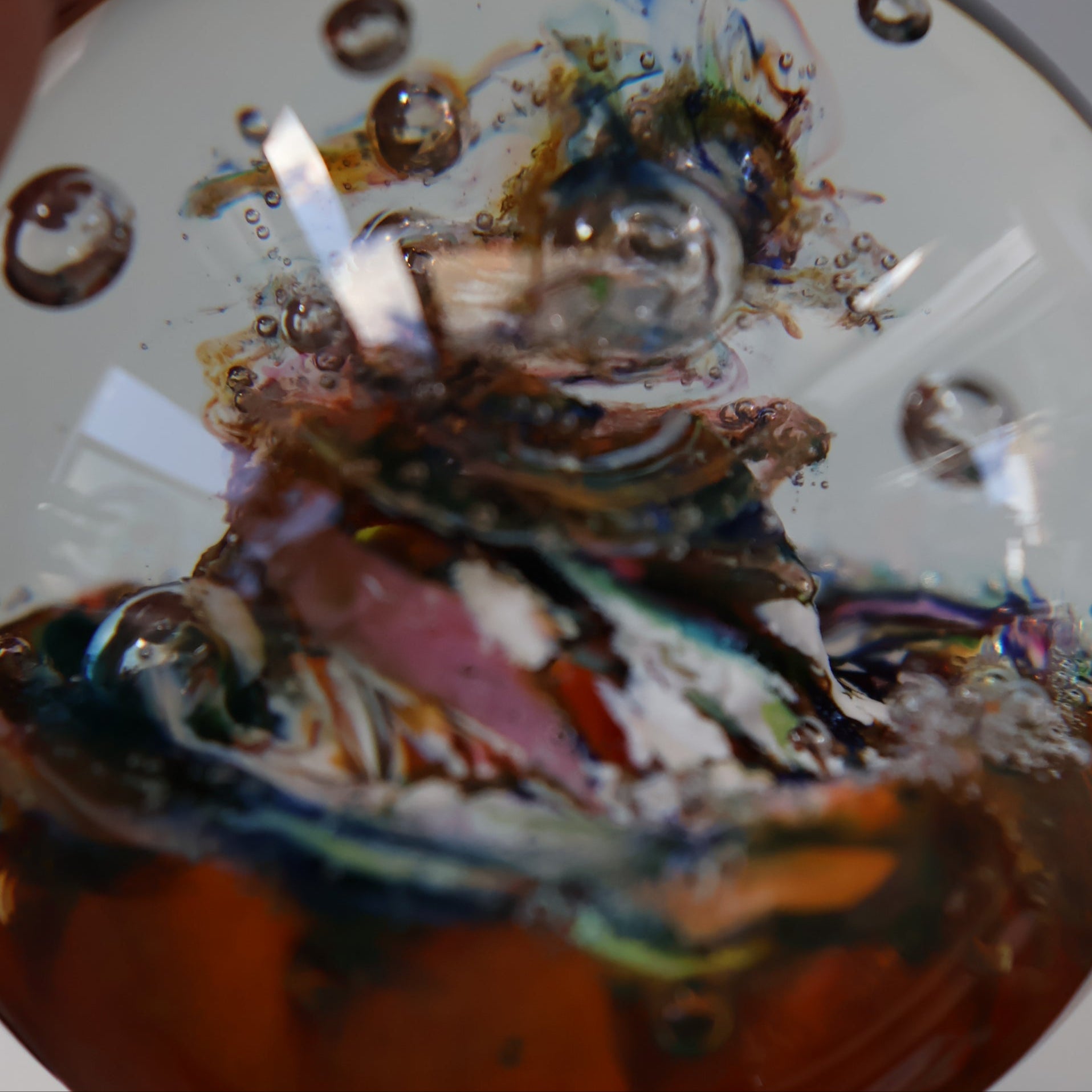 It is a more simple weight - with a golden amber ground and melted tutti-frutti millefiori swirls sweeping up into a mini-whirlpool in the center. There is a large silvery air bubble in the middle and floating randomly in the dome there are smaller bubbles, as photographed.