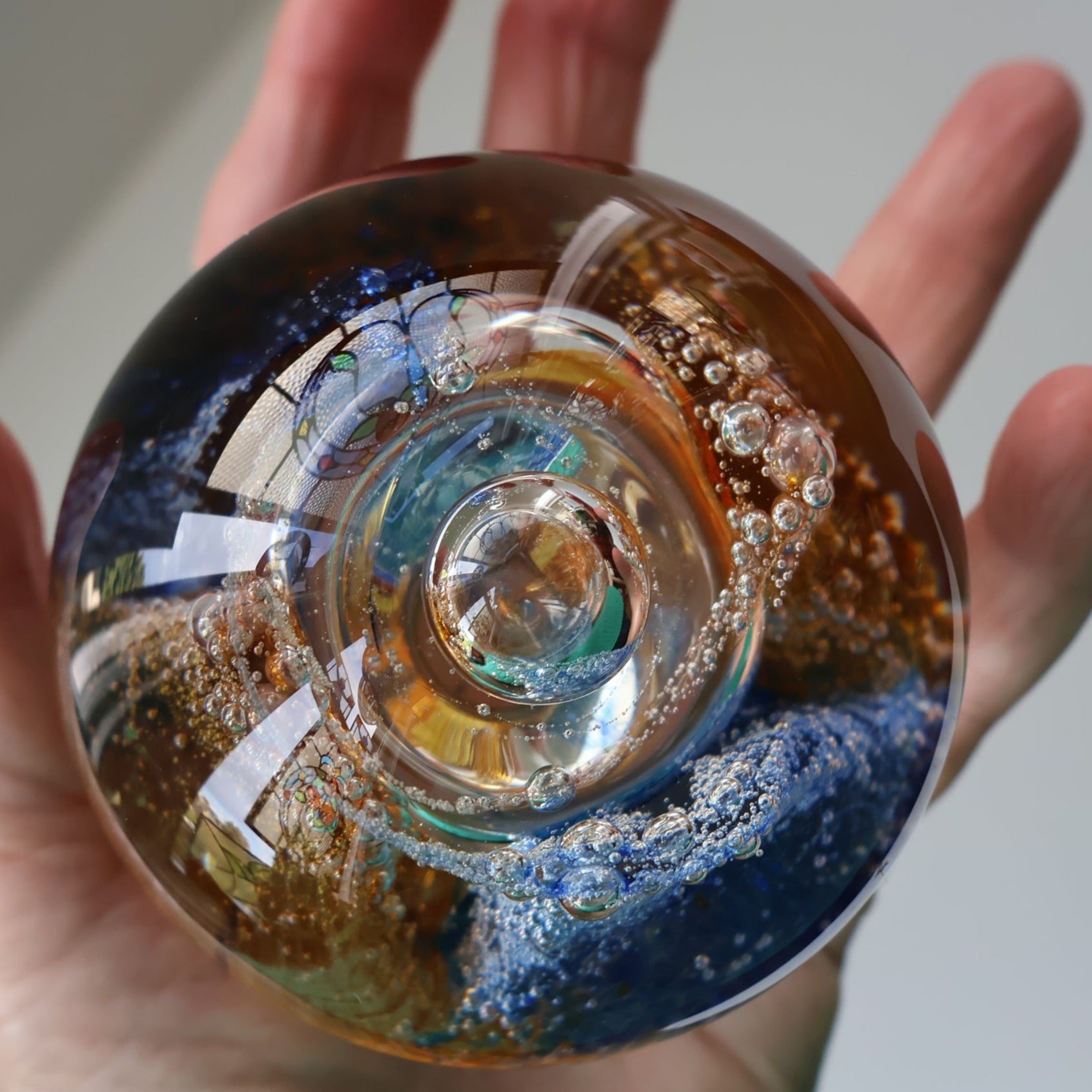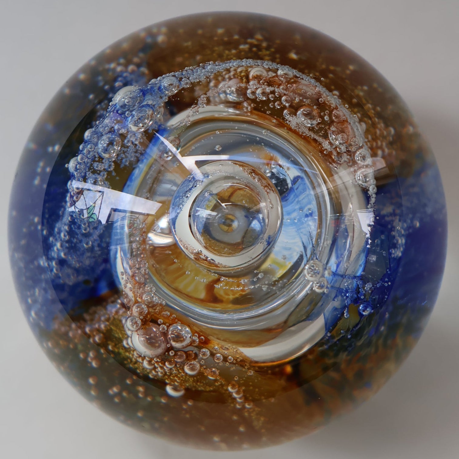 It is an abstract weight taking the form of a clear sphere. It has triangular shaped peaks around the base area - these in blue and golden amber shades - and the tip of each is covered with lots of teeny weeny glistening air bubbles. In the center of the weight is a clear nest shape with an attached stalk below. In this sits a large "silvered" air bubble. It looks like a Nebula - hence the name Cosmo.