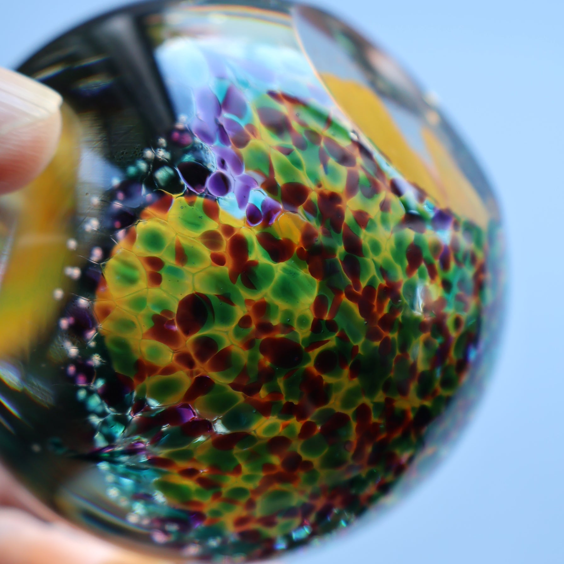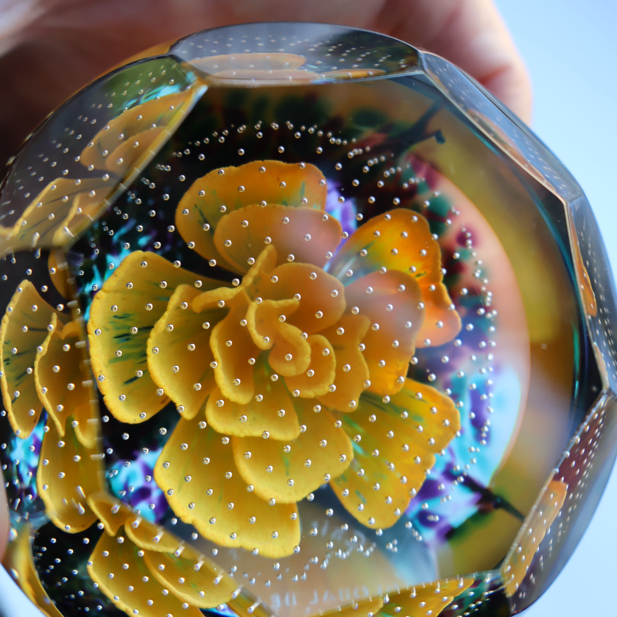 The weight is spherical in shape - but with the front of the paperweight cuts into shaped facets. There is an octagonal flat facet angled on the front which acts as a viewing window. Around the viewing facet there are eight hexagonal ones forming a sophisticated decorative border. Inside the weight we have a flat net of controlled tiny air bubbles - which act as a delicate screen in front of the large bright yellow flowerhead. If you then turn the weight around - the smooth spherical part at the back contains a backdrop of speckled tutti-frutti drops - in yellow, red and green. The paperweight is view and displayed on an angle. All the issue details are engraved on the base.