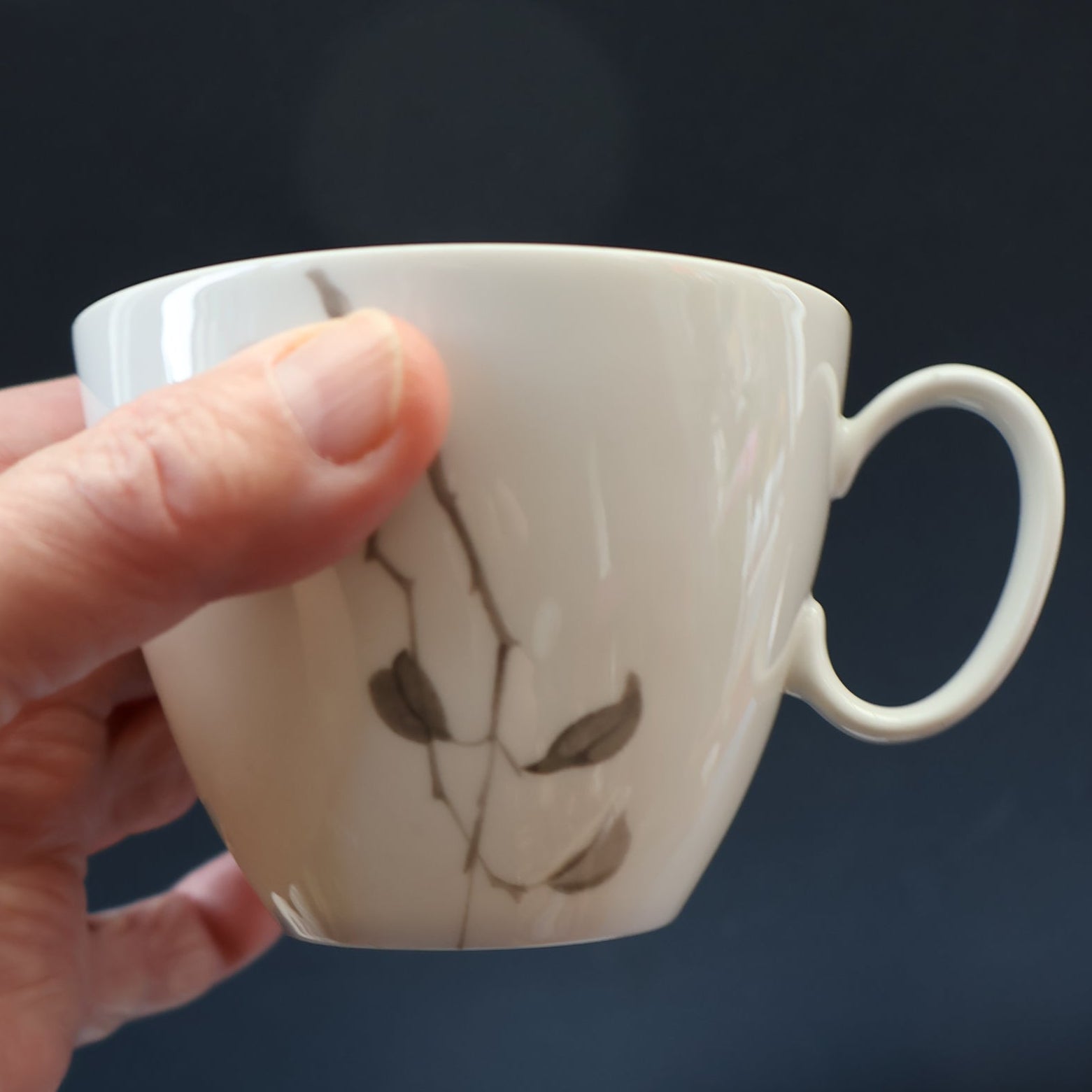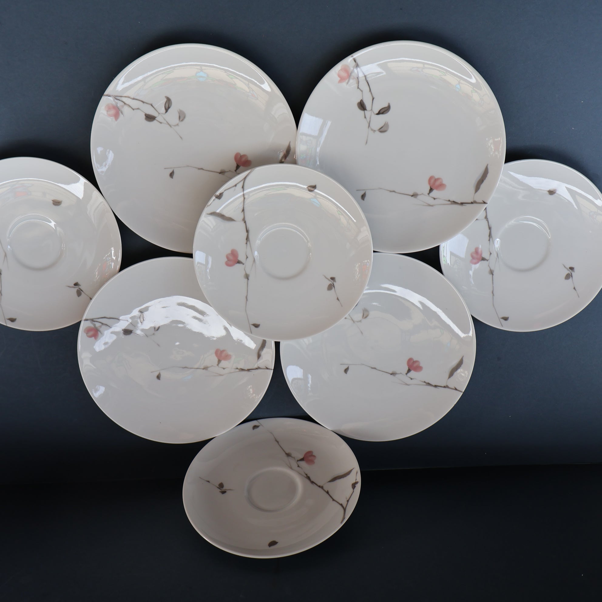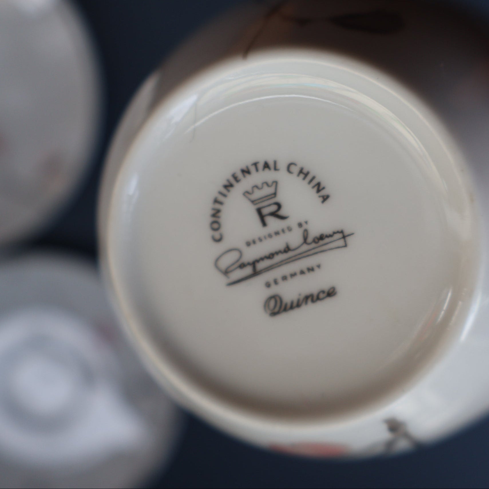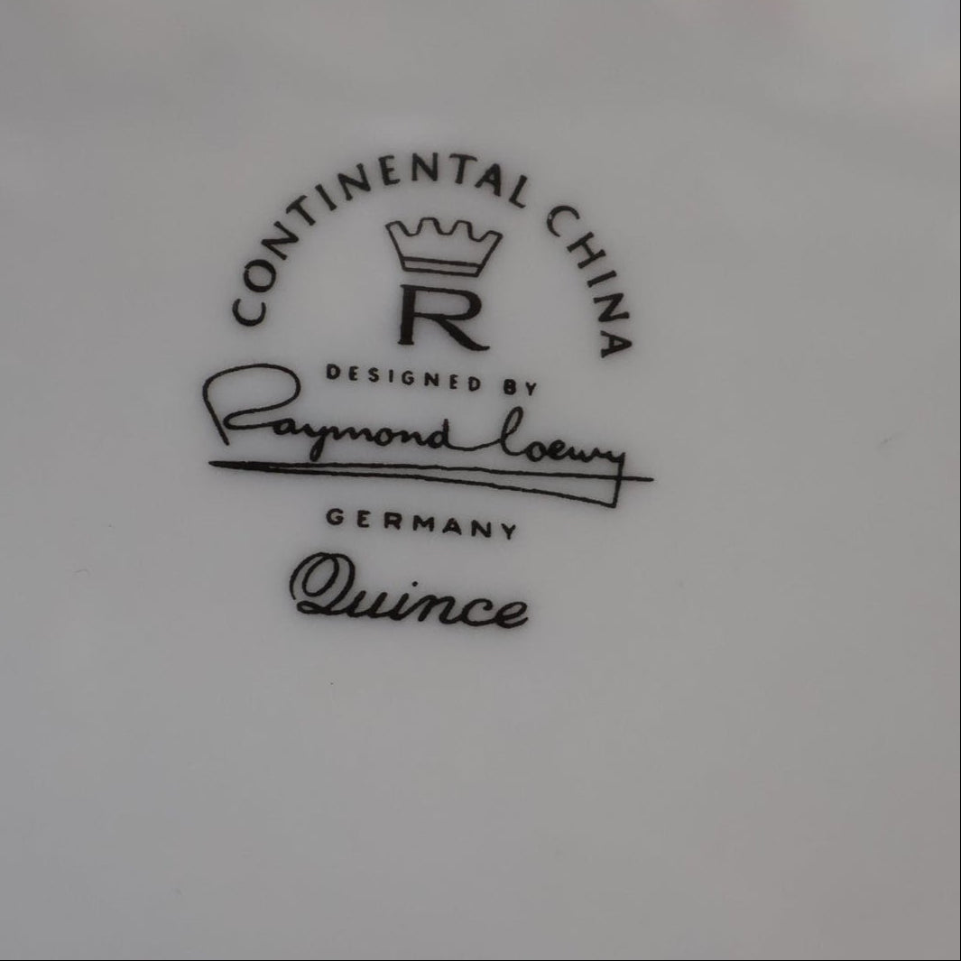 This more minimalistic Quince pattern was designed by Raymond Loewy (1893-1986) for Continental China, a division of Rosenthal, Germany. The design features a pink and grey quince blossom and leaf pattern on a white porcelain background. Quince pieces were in production from 1956 through 1964. The pattern in now discontinued.