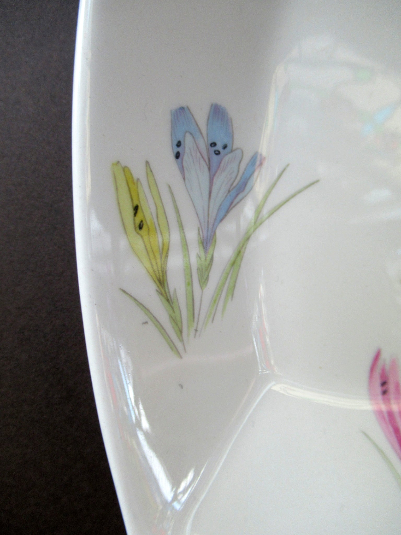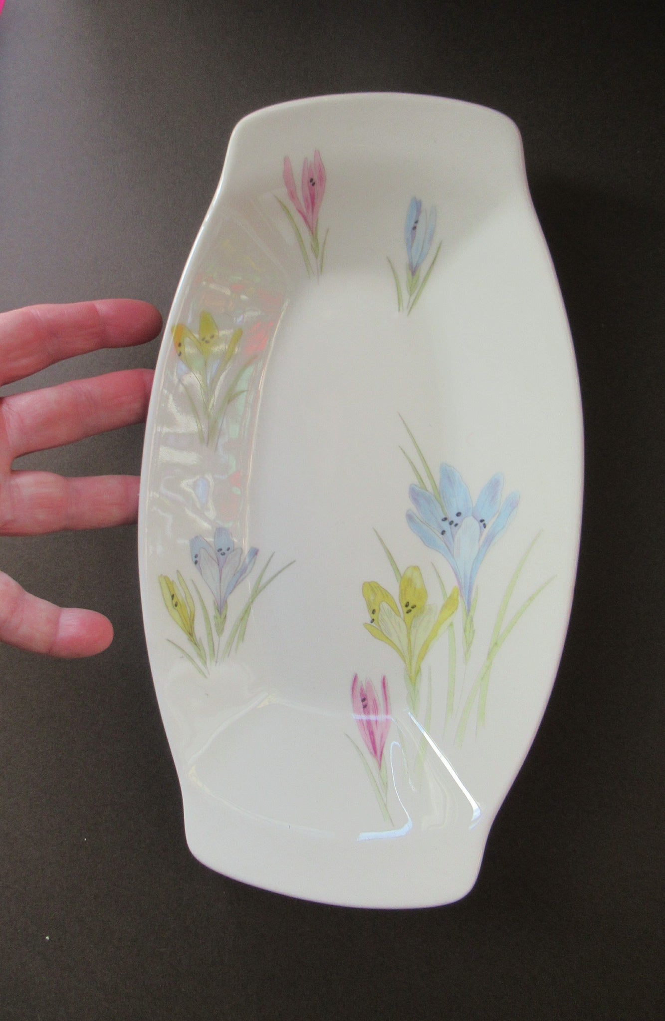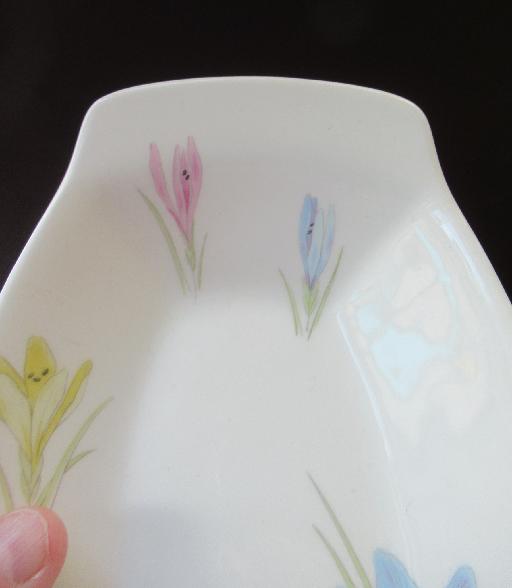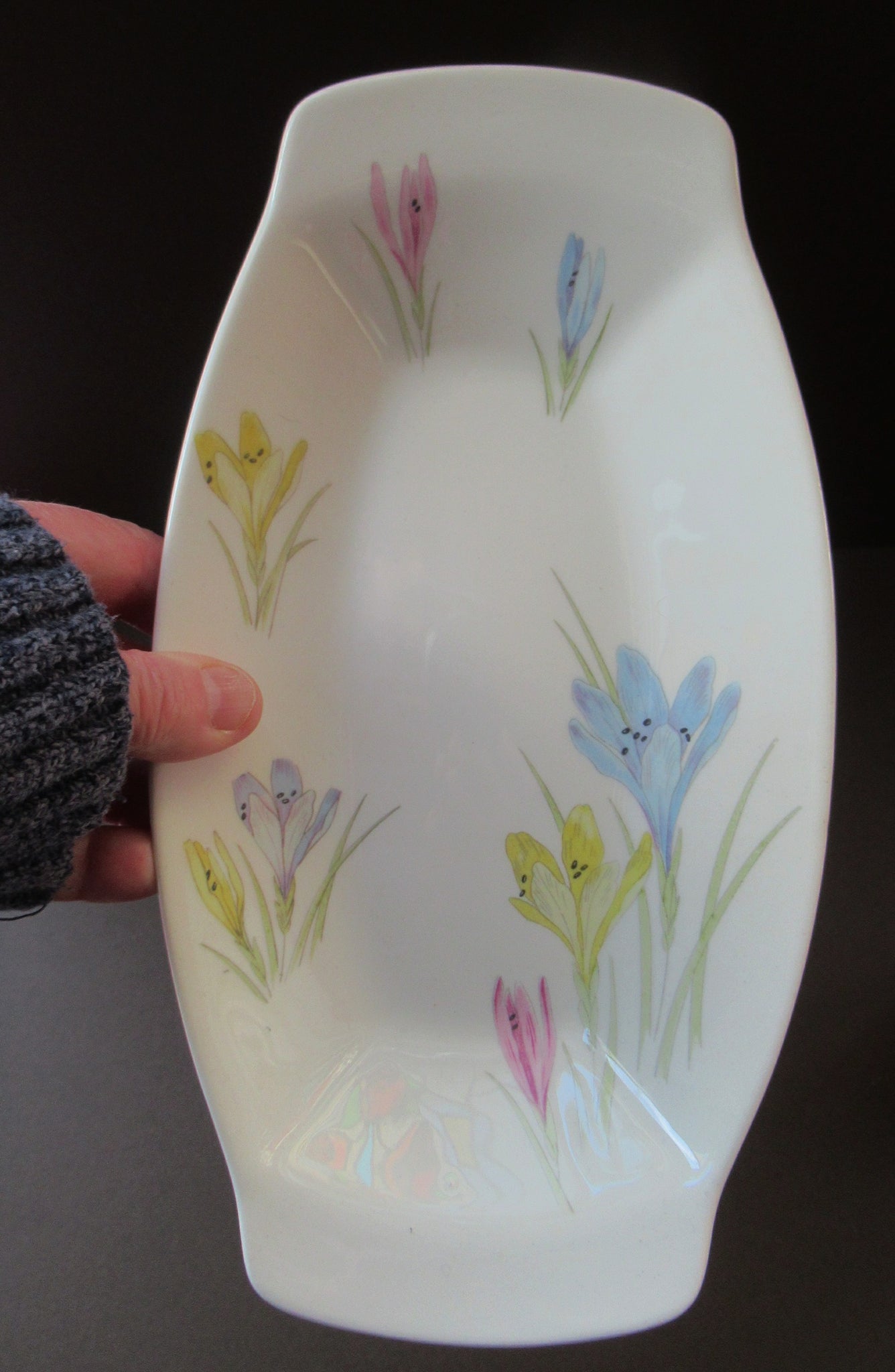 The design is a more unusual and harder to find one - and is called Crocus. The main plate colour is white - and it has sweet pastel coloured crocus patterns around the side.