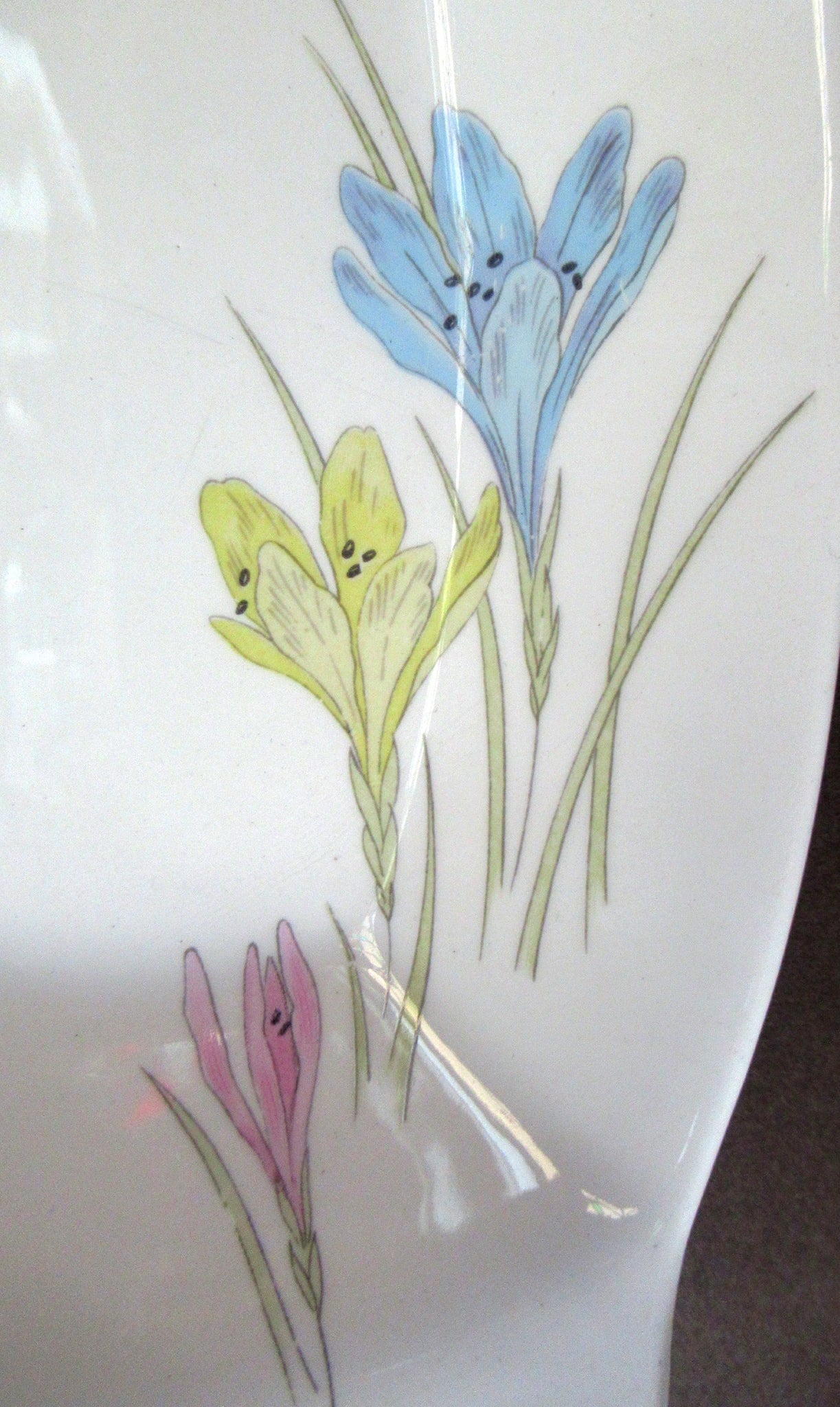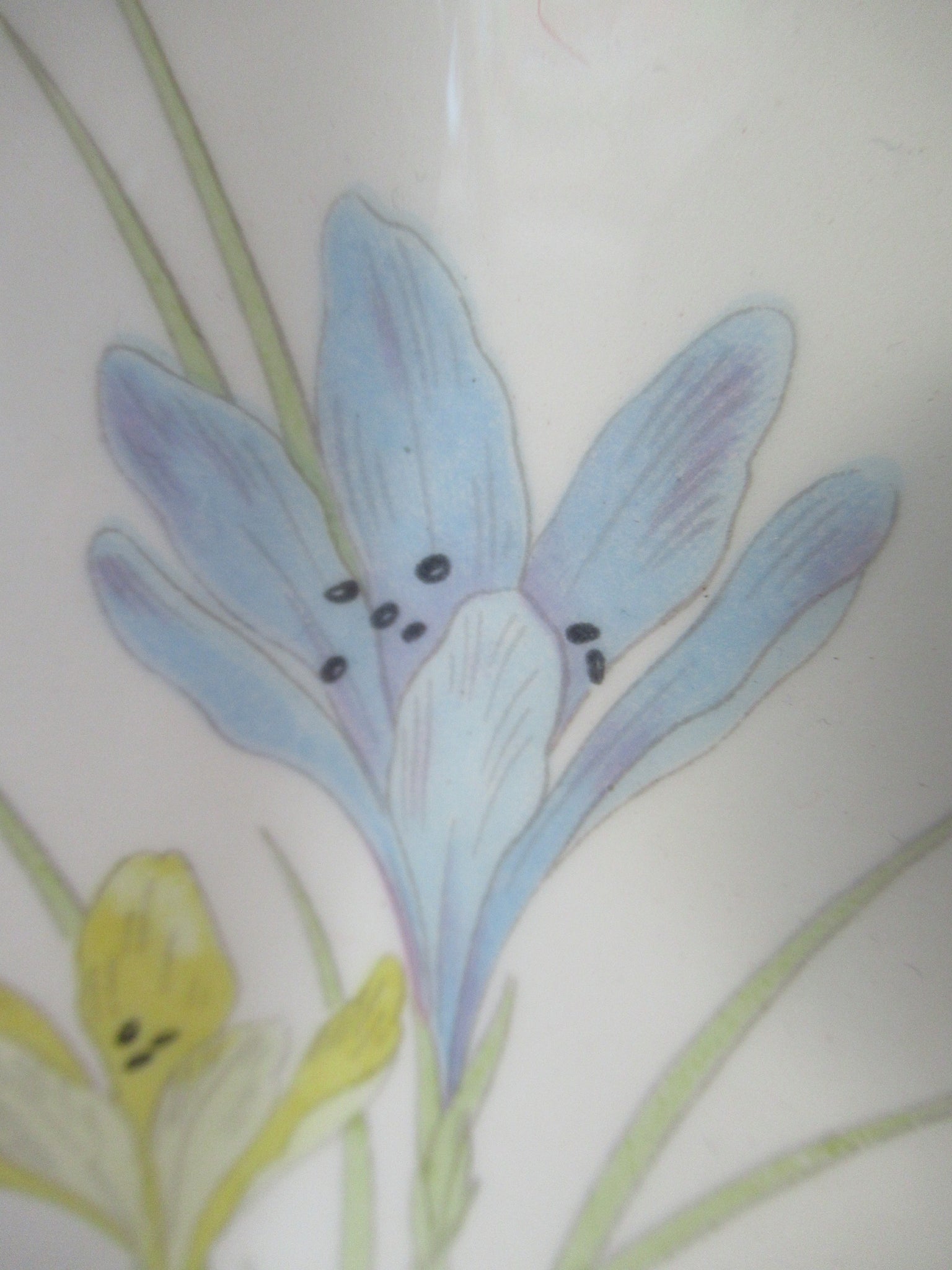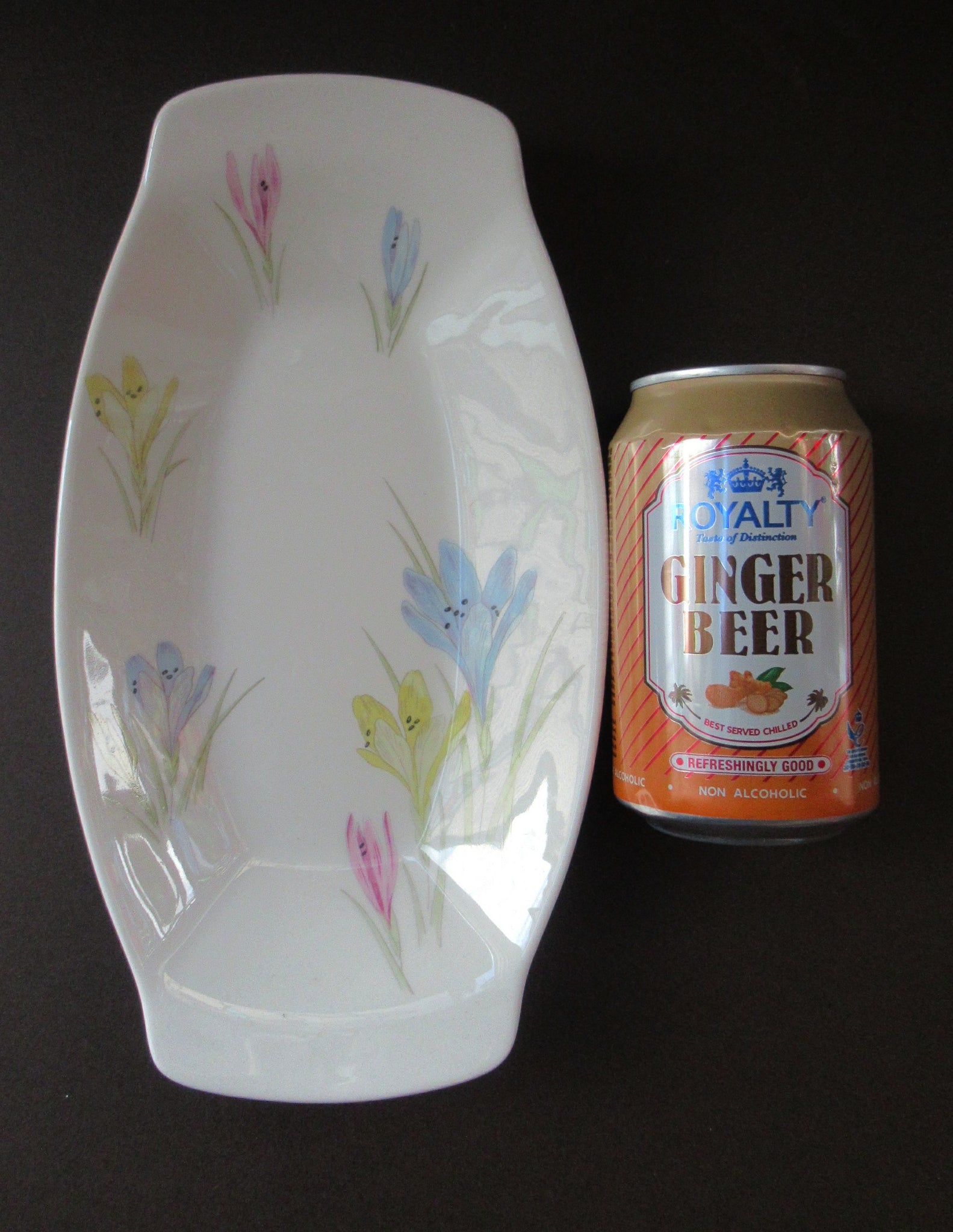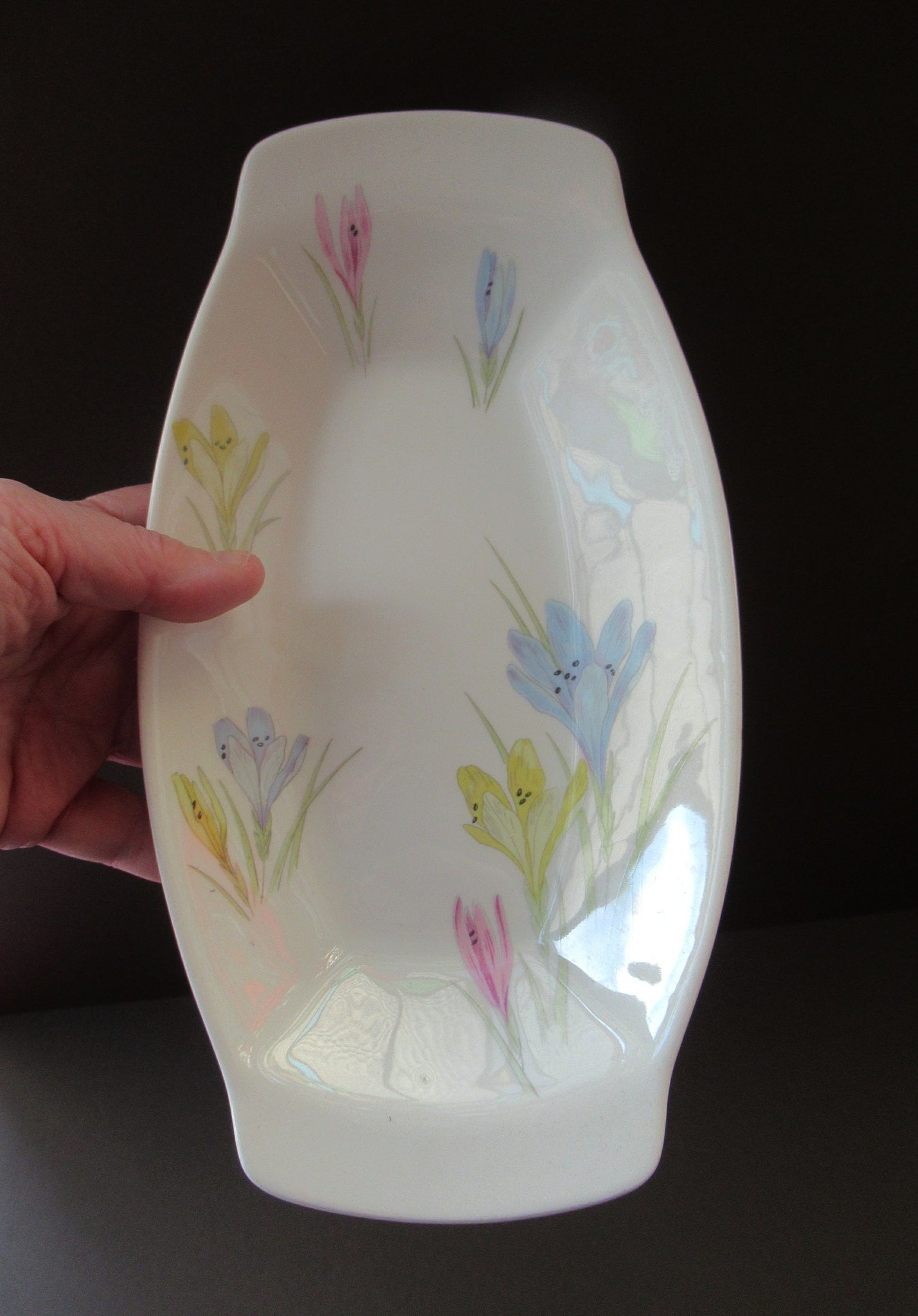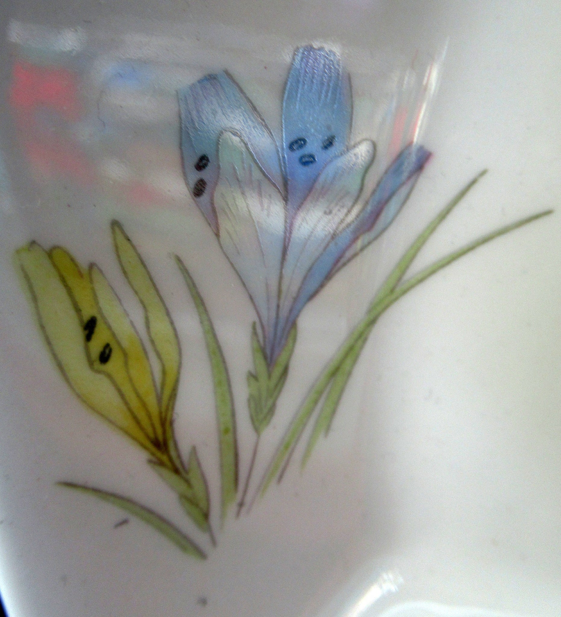 The design is a more unusual and harder to find one - and is called Crocus. The main plate colour is white - and it has sweet pastel coloured crocus patterns around the side.