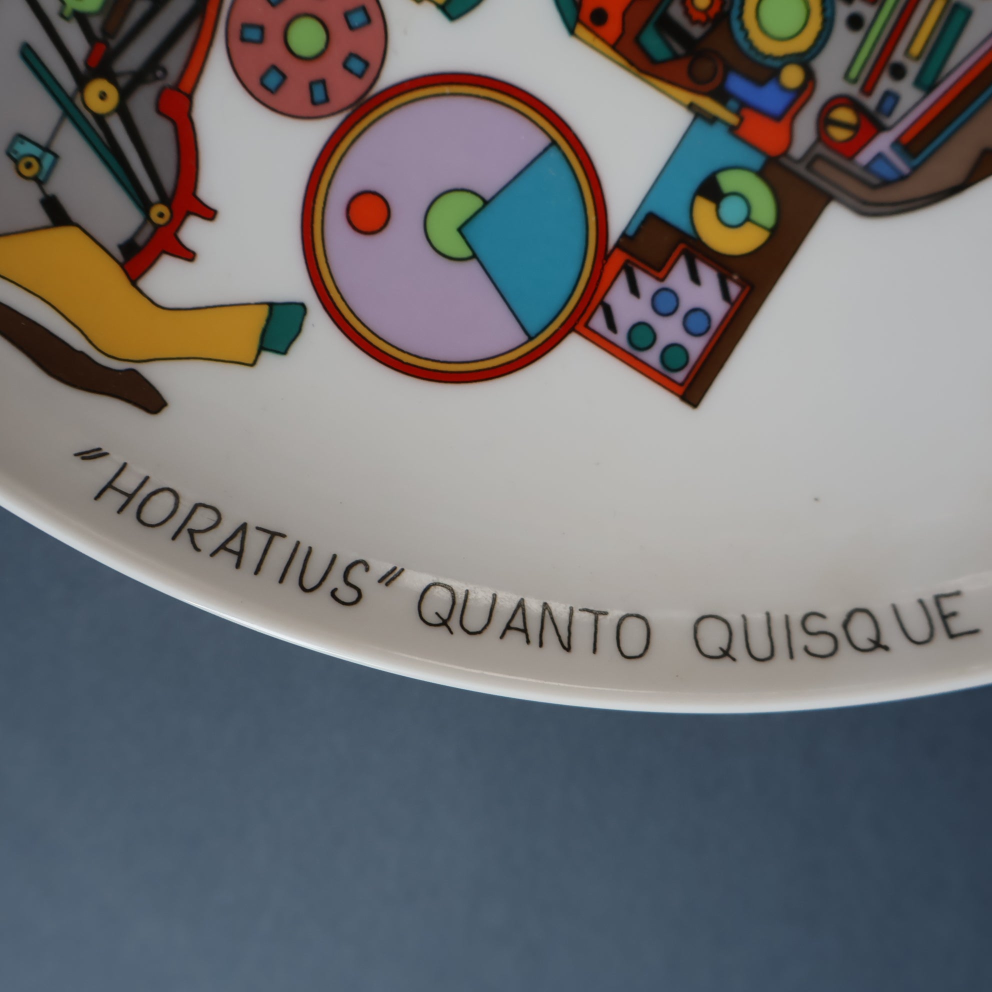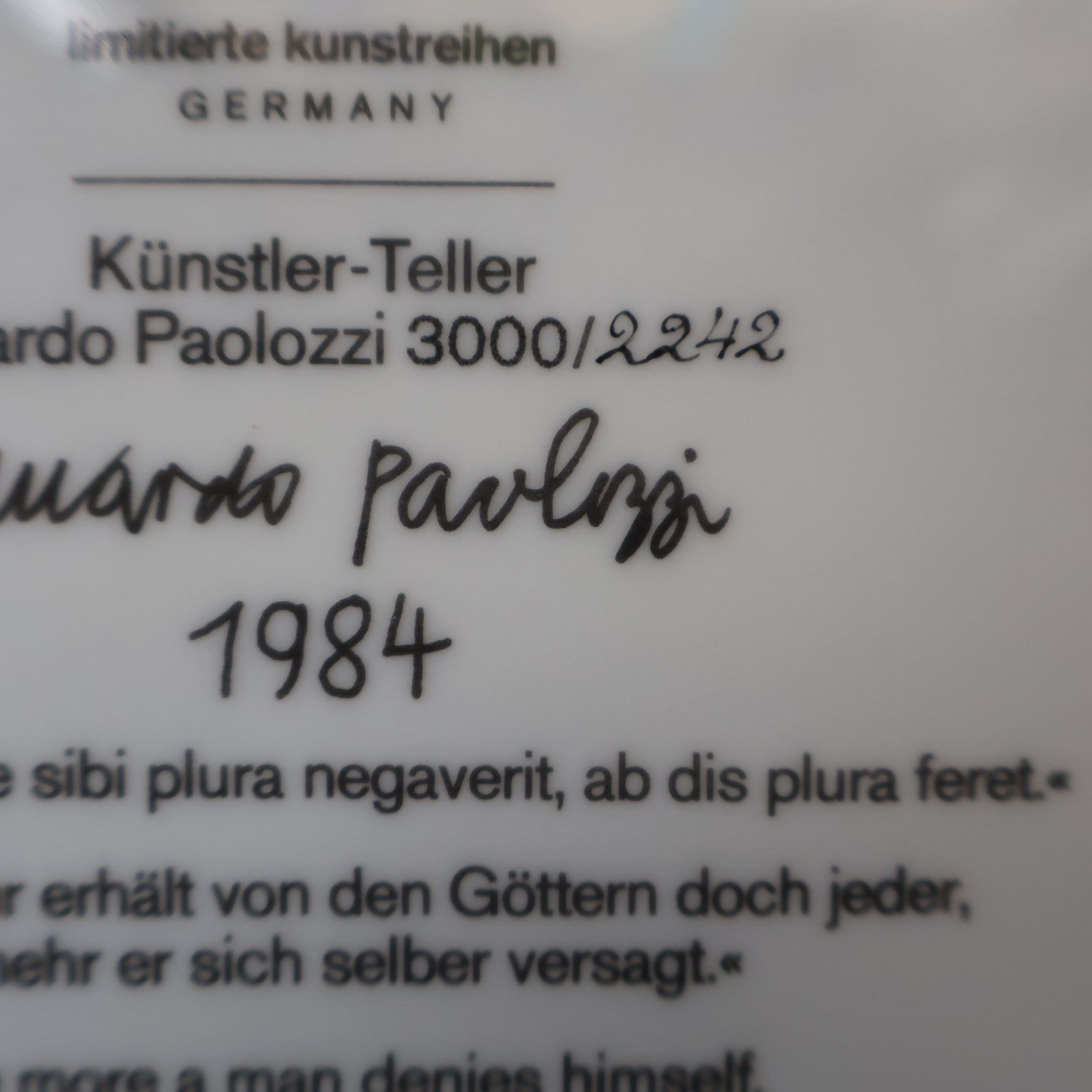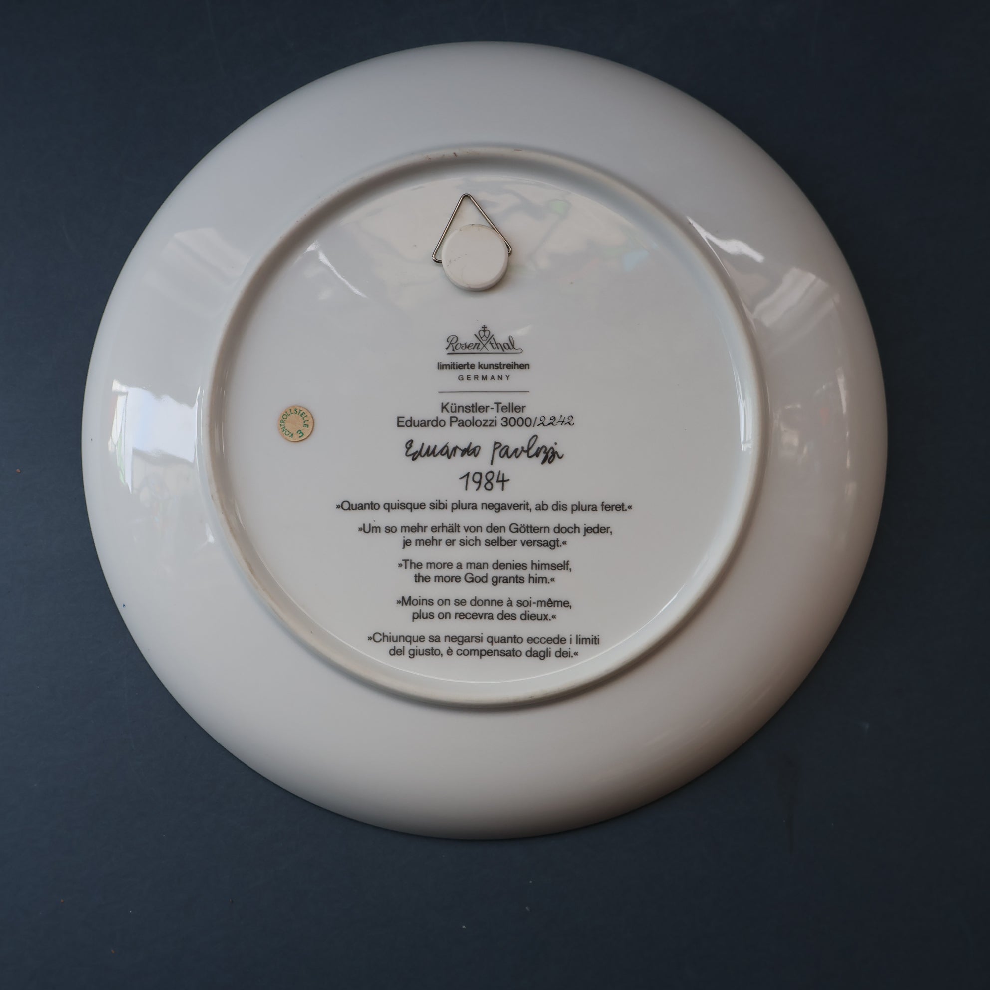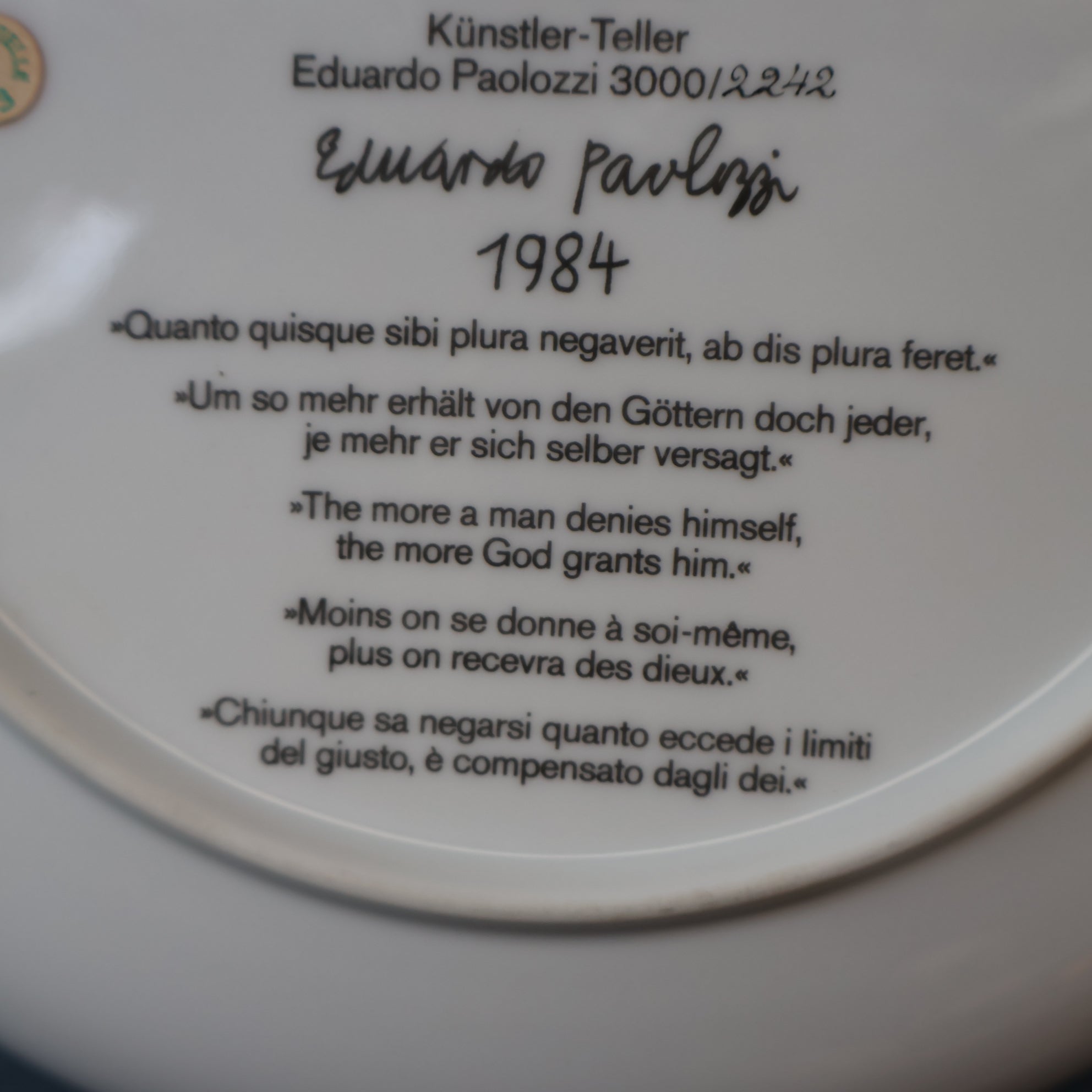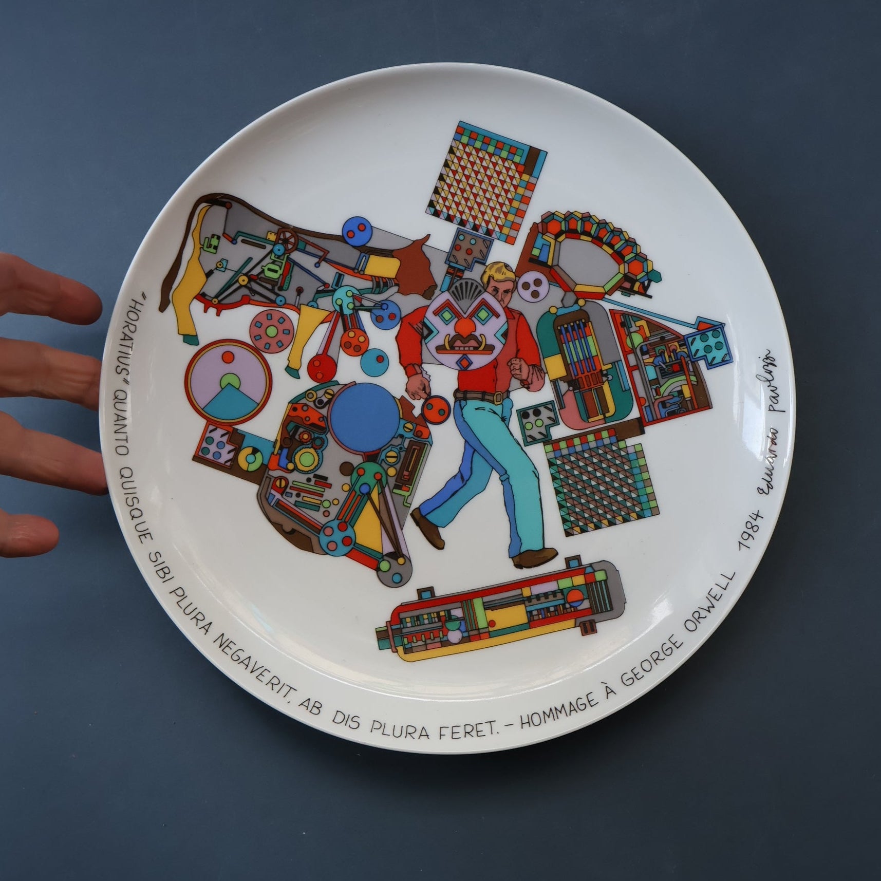 It is entitled in German around the base and has the quote on the reverse in English "The more a man denies himself the more God grants him". And also inscribed Horatius. It was designed and produced in 1984 as a homage to George Orwell. It is 10 inches in diameter.