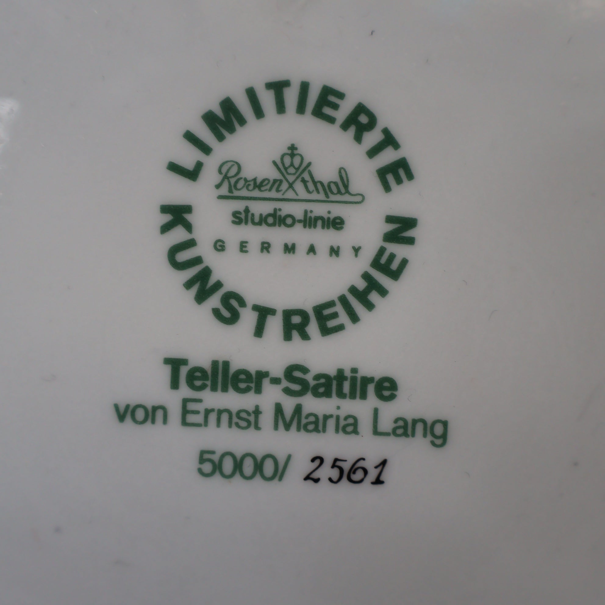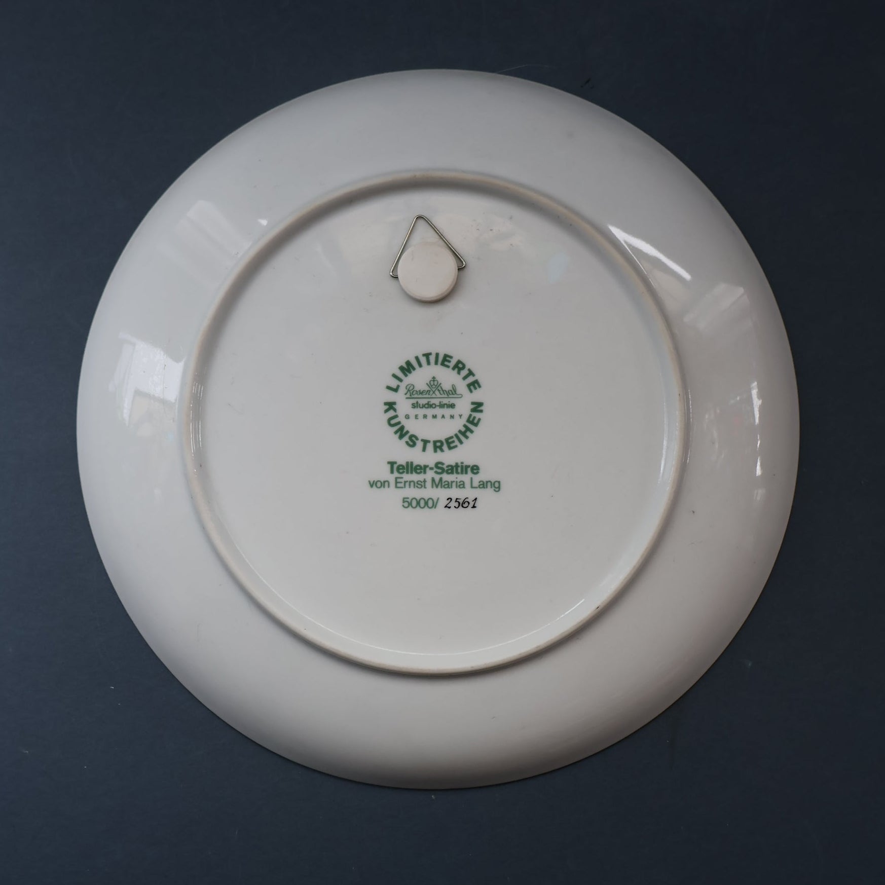 This is an decorative wall plate or charger designed by Ernst Maria Lang. He was a prominent German architect, caricaturist, and cartoonist. Lang was known for his satirical drawings on political and social issues, especially during the Cold War.