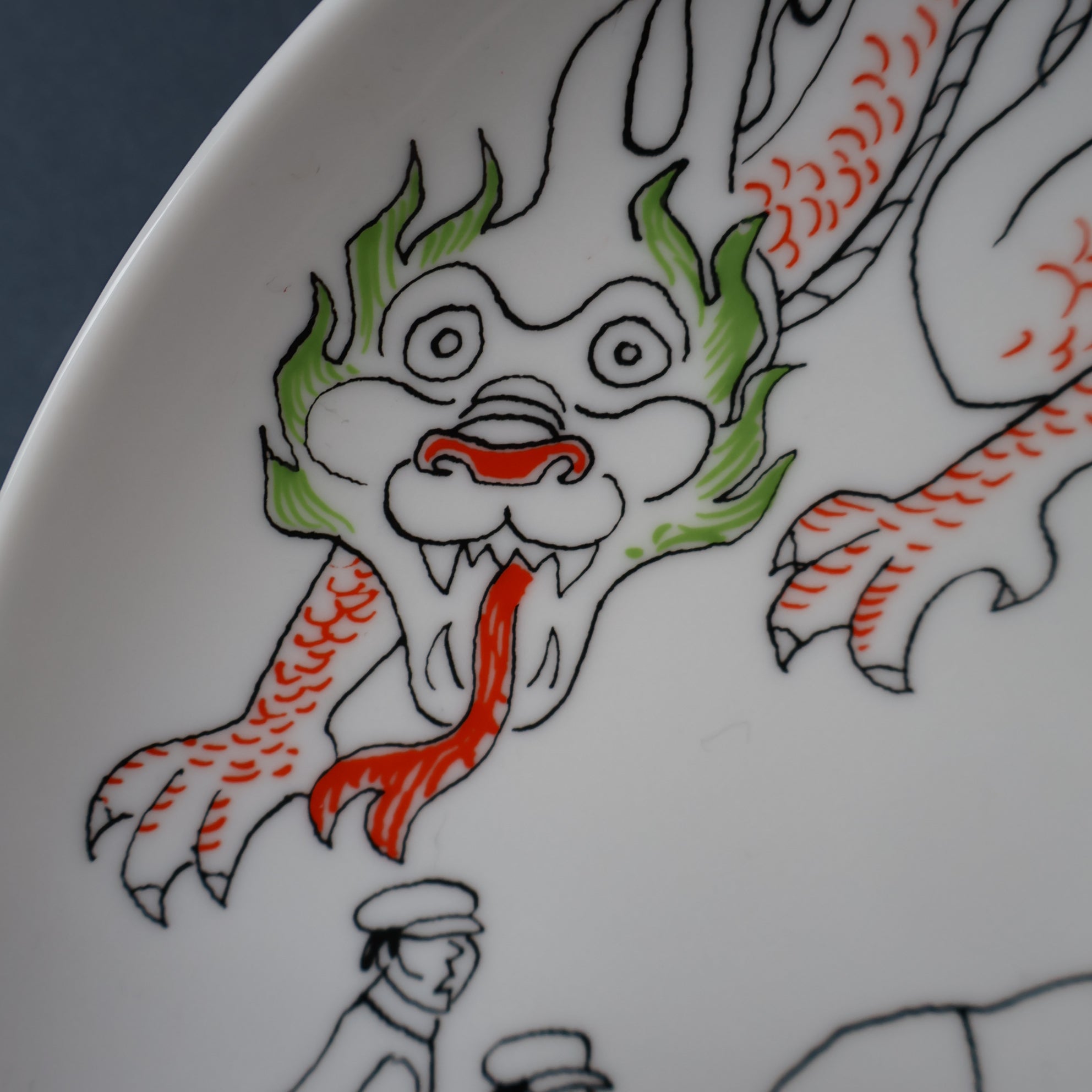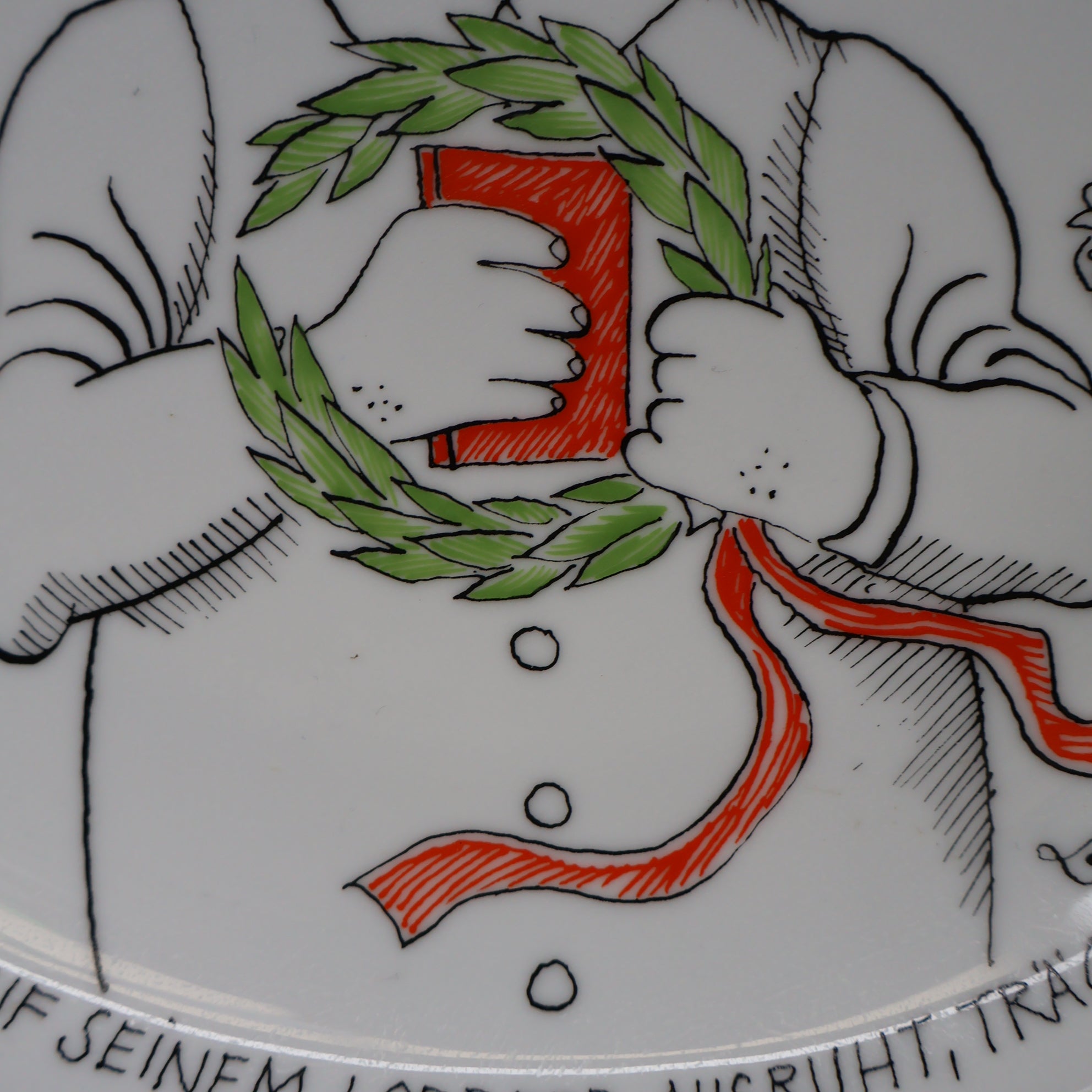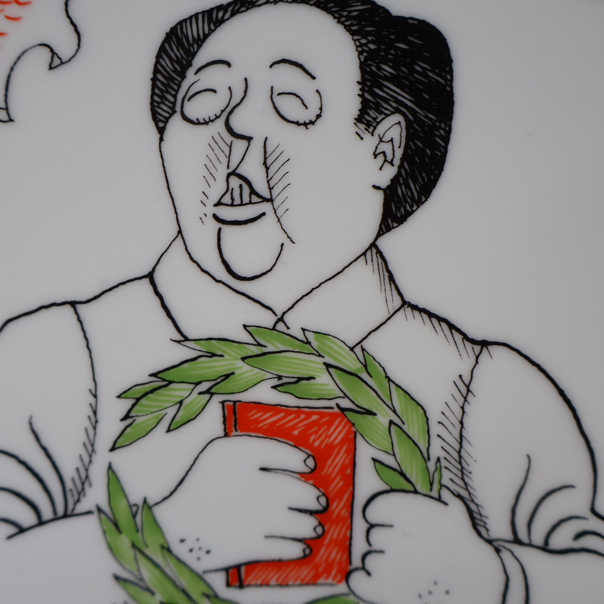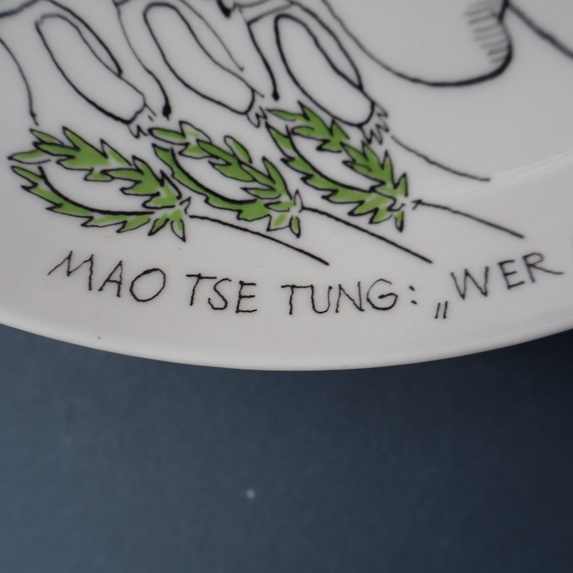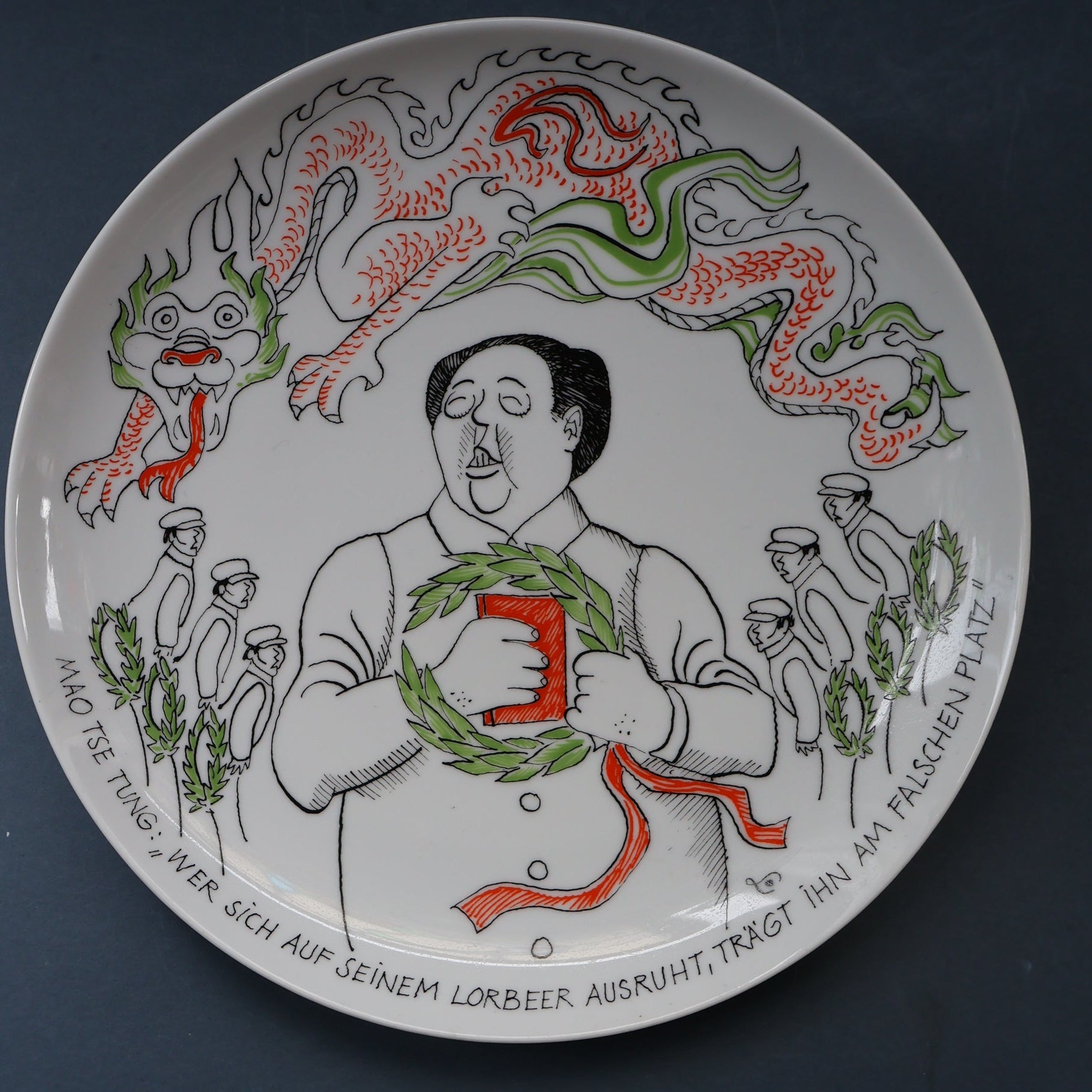 This comic plate is just over 10 inches in diameter. The design is a satirical one showing the German actress the Chinese leader Mao Tse Tung - he is holding firmly onto his little red book. A chinese dragon appears above him. Six men with victor's laurel wreaths are positioned on each side of the leader.