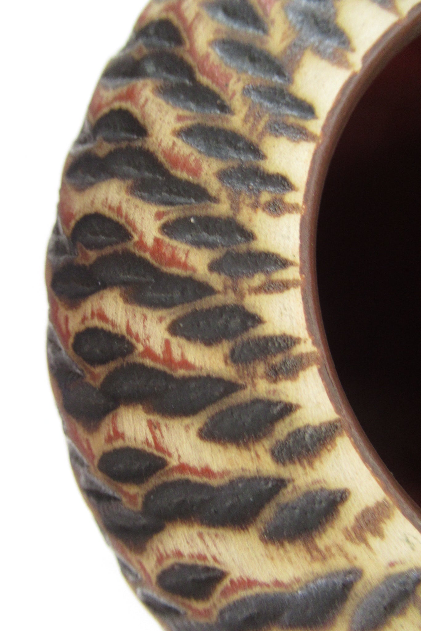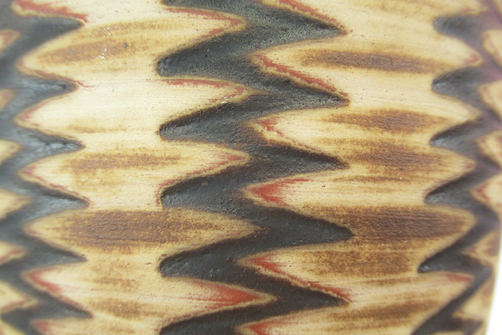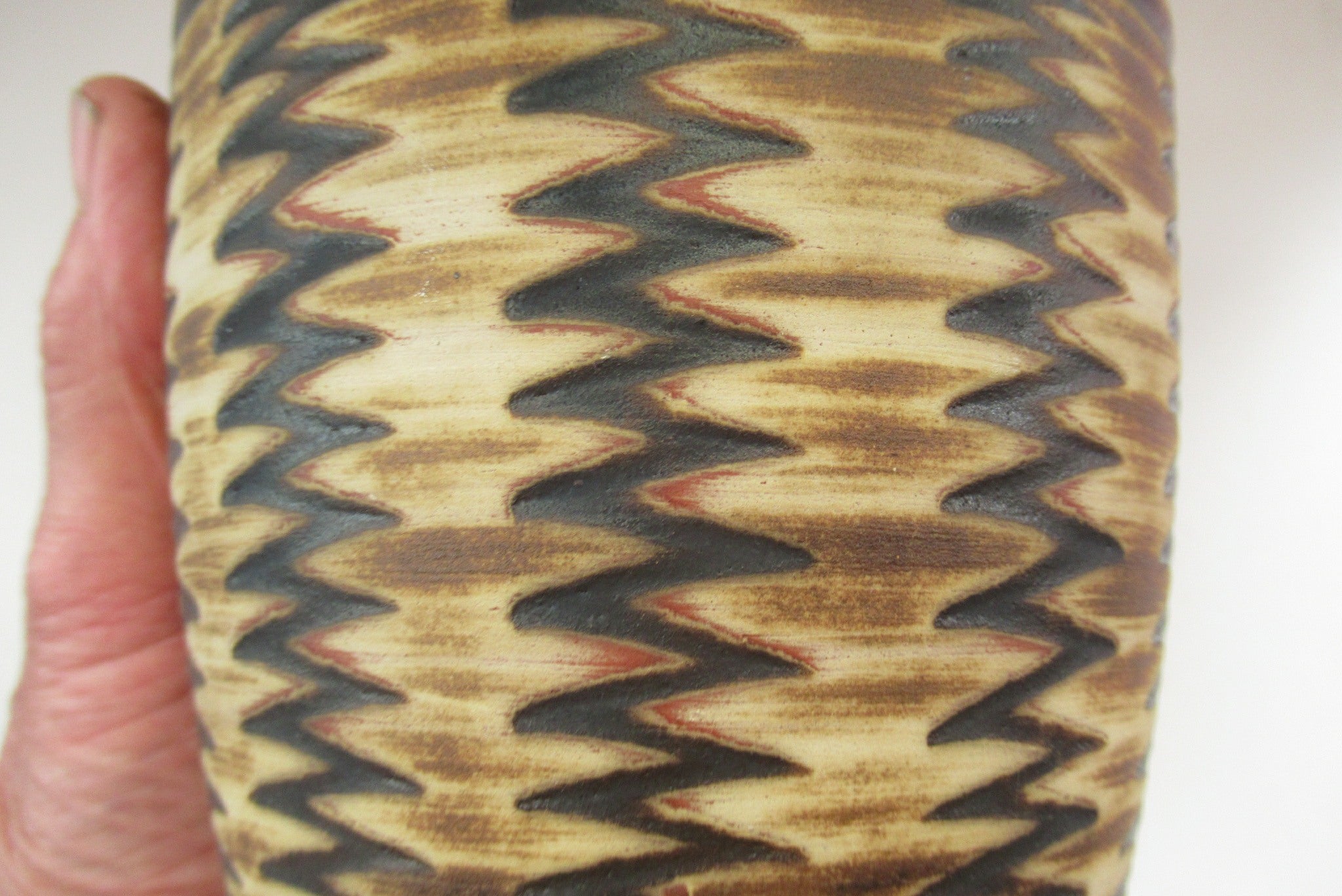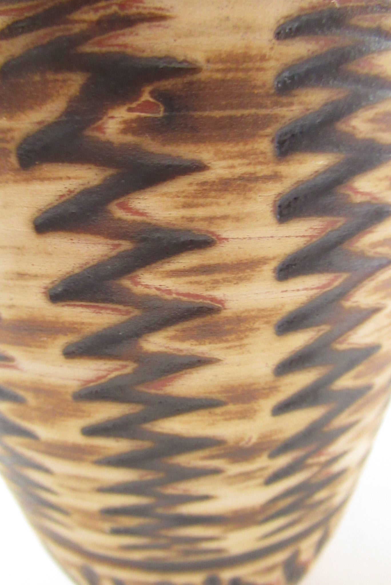 The Brutalist decoration of abstract zig-zags has been etched into the surface and then coloured with washes of beige, chocolate brown and black.