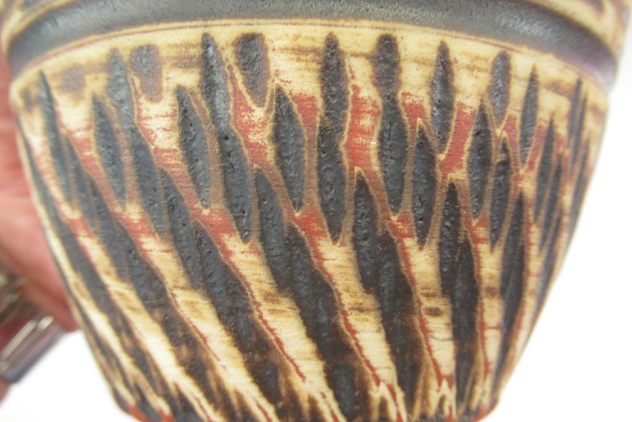 It is certainly a fine and most attractive piece of North European studio or art pottery. The main body of the pot is hand thrown and is made from an attractive terracotta-coloured clay.