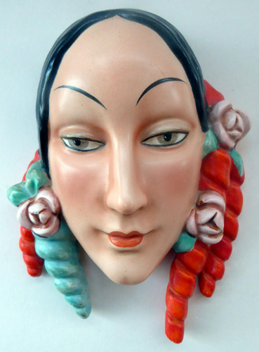 Rare 1930s GOEBEL Pottery Wall Mask. Art Deco Spanish Lady with Fabulous Floral Hair Decorations. LARGER size. 7 inches