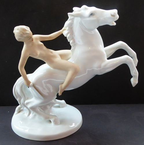 Fine WALLENDORF PORZELLAN Art Deco Style Large Figurine of a Nude Lady Warrior Riding a White Horse. PRISTINE