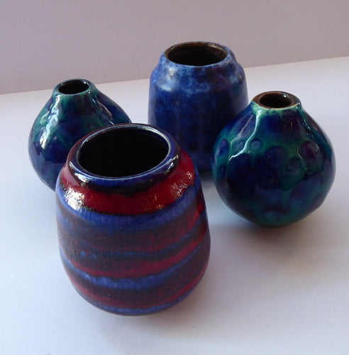 JOB LOT. Four Miniature West German Vases: Scheurich & Ruska. Mainly Blue Tones. All about 4 inches.