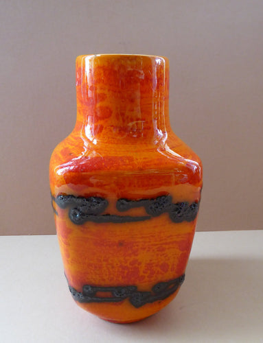 West German SCHEURICH Square Shaped Vase. Shiny Tangerine Orange Glazes: with Horizontal Lava Stripes 6 1/4 inches in heig