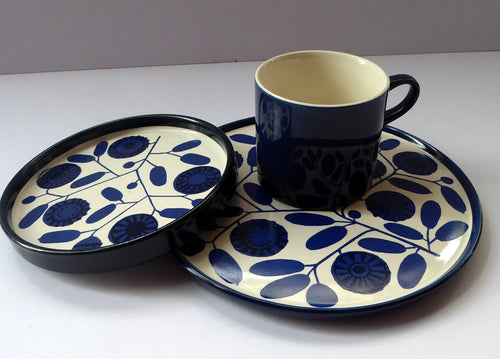 German 1960s MELITTA Blue Sunflowers PORCELAIN Trio. Cup, Saucer & Side Plate. Designed by Lilo Kantner