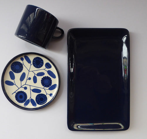German 1960s MELITTA Blue Sunflowers PORCELAIN Cup, Saucer with plain blue oblong side plate. Designed by Lilo Kantner