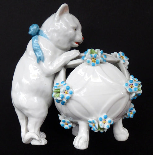 Pretty Victorian era SITZENDORF DRESDEN porcelain cat playing with a ball of wool, possibly a pot pourri holder