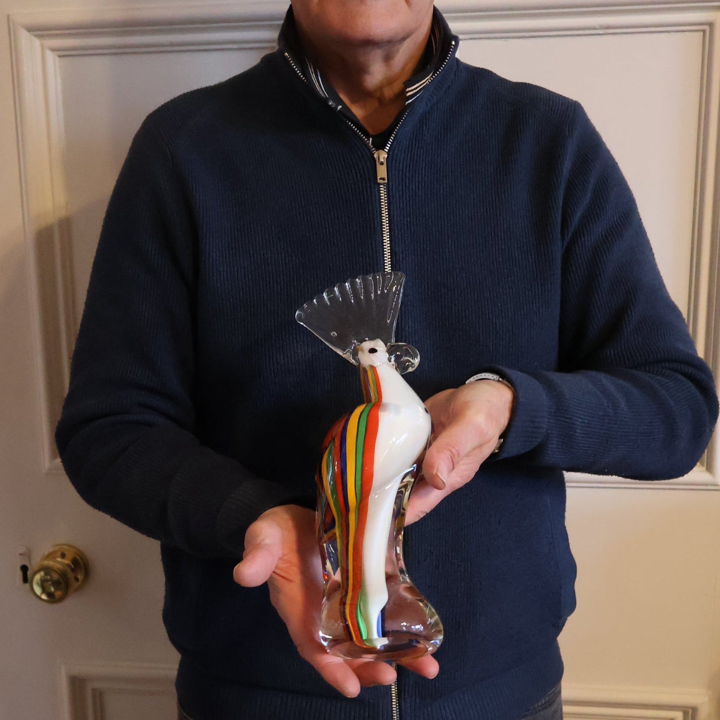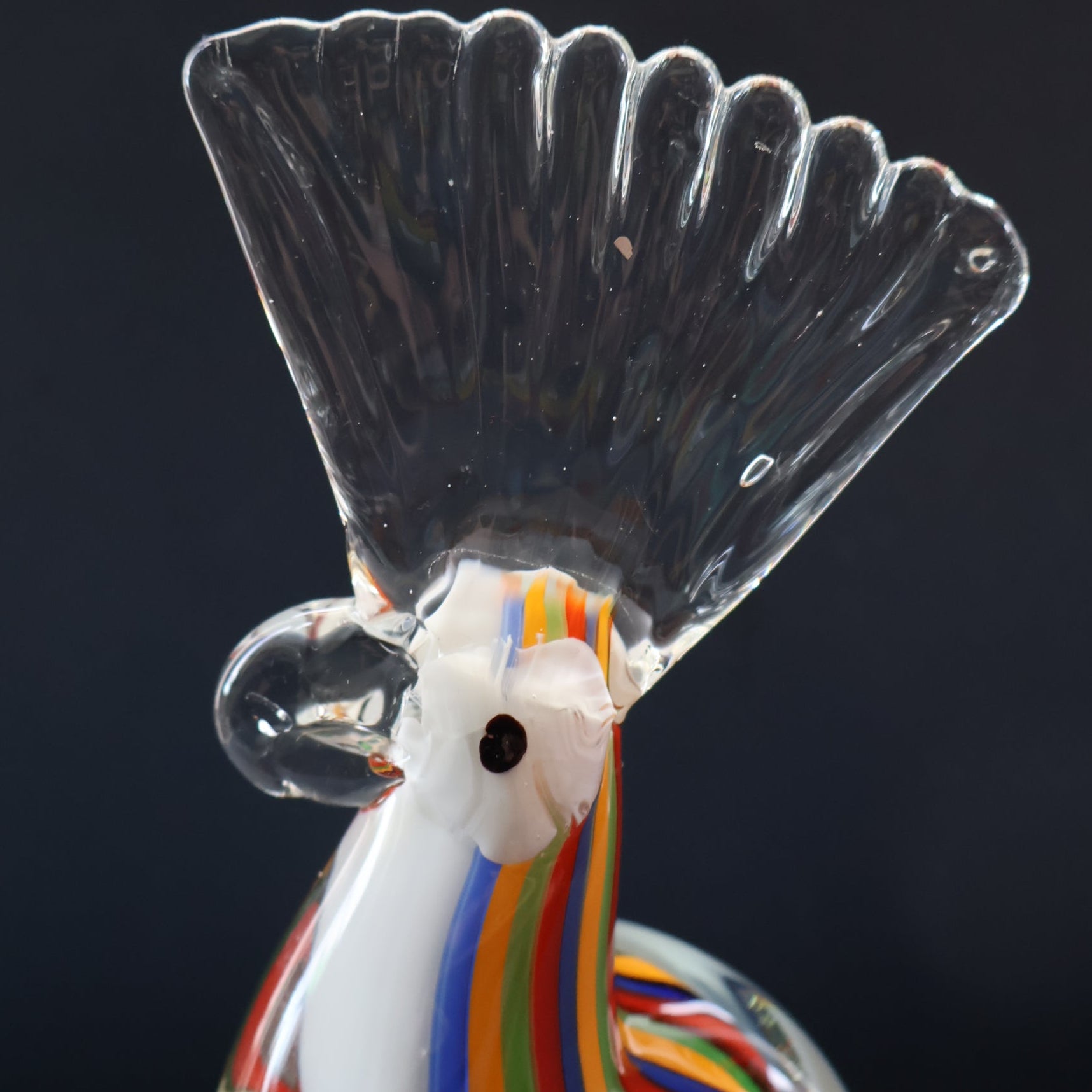 He has a little black glass eye and a clear glass crest of feathers on his head. His beak is also clear glass. Being hand blown, there are a couple of tiny air bubbles obvious in his crest (these occurred in the making and are consistent with the figurine being all handmade.