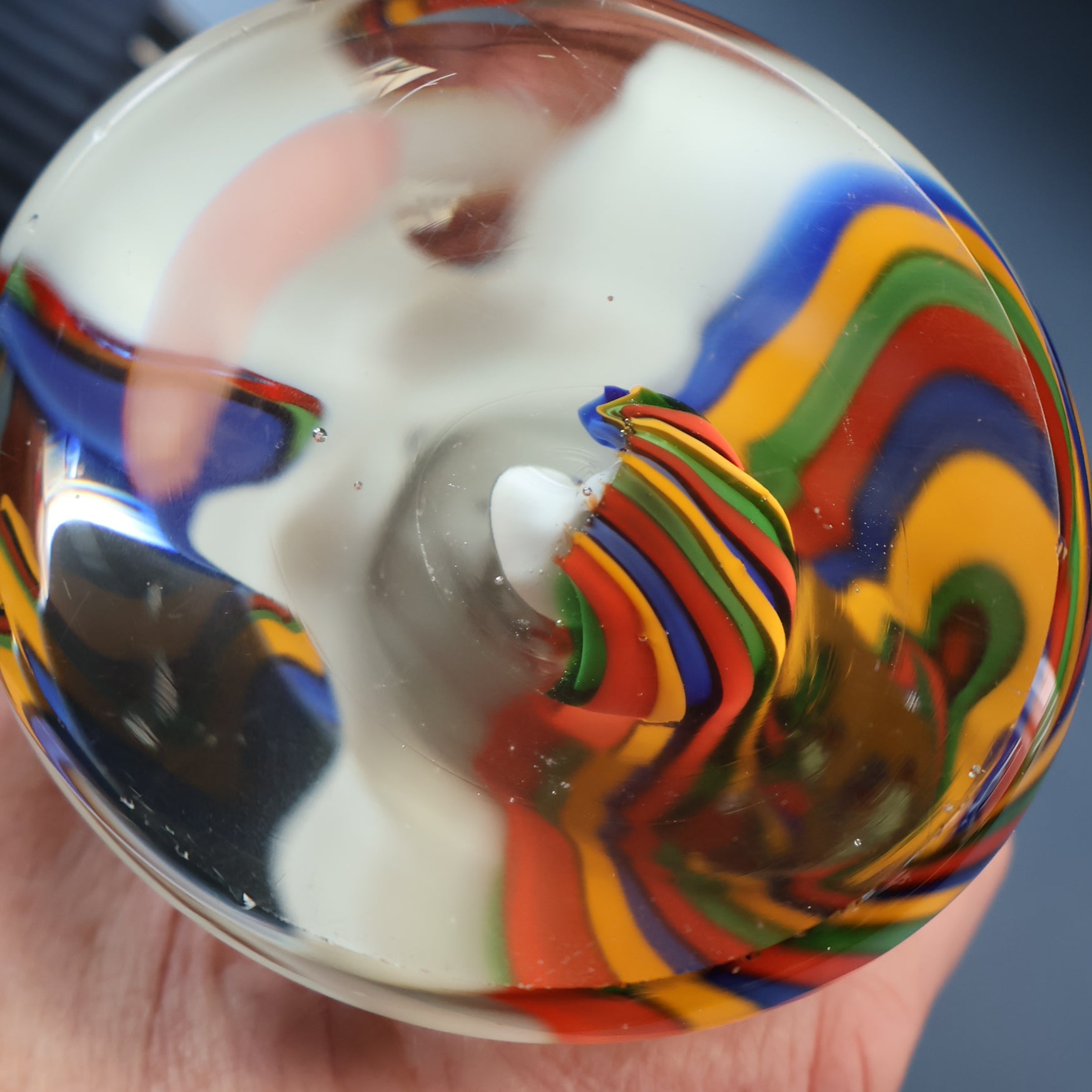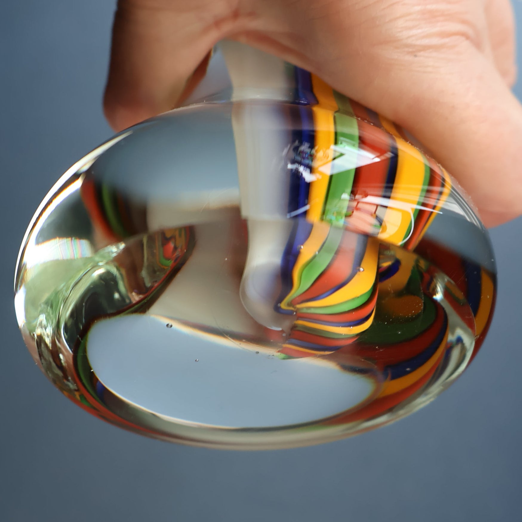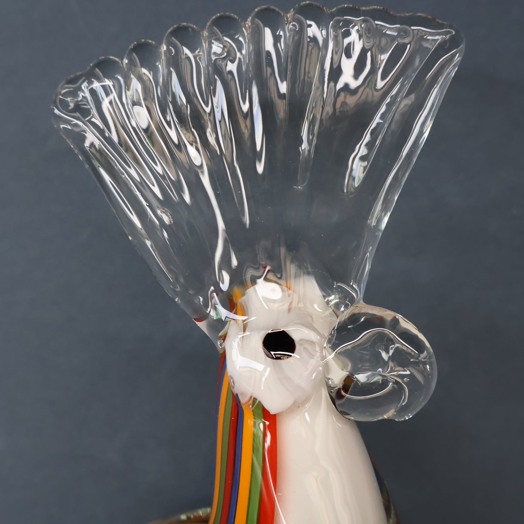 He has been hand-blown and has a nicely ground base section, as photographed. The cockatoo's main body colour is white glass - and this is overlayed with flat, fused ribbons of red, green, yellow and blue. These stretch from under his head down to the base. The base is made of clear crystal glass dome which forms a stylized chunky foot or perch section.